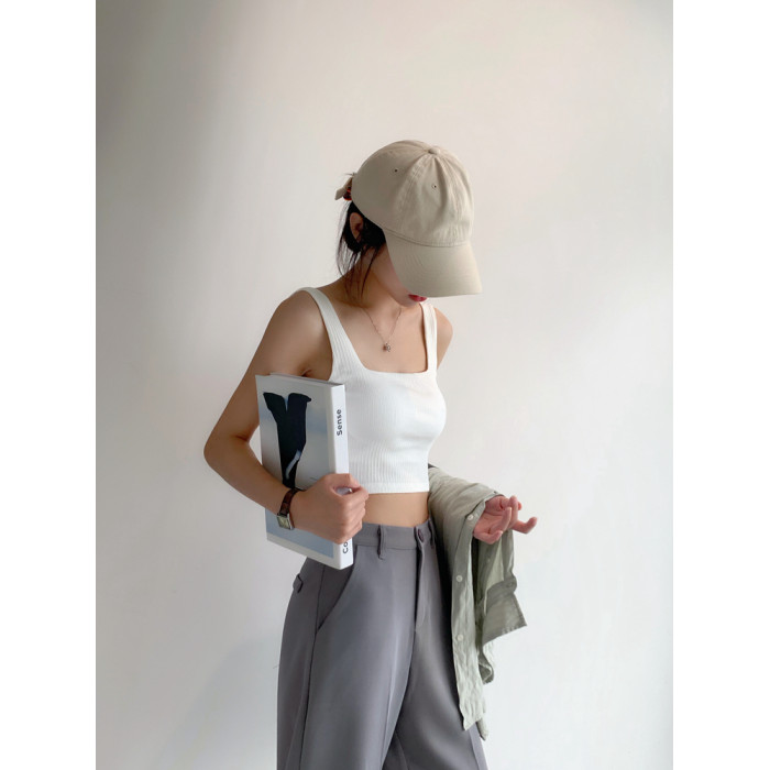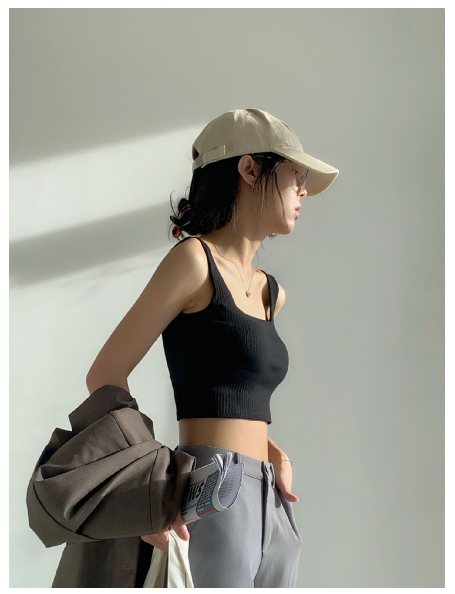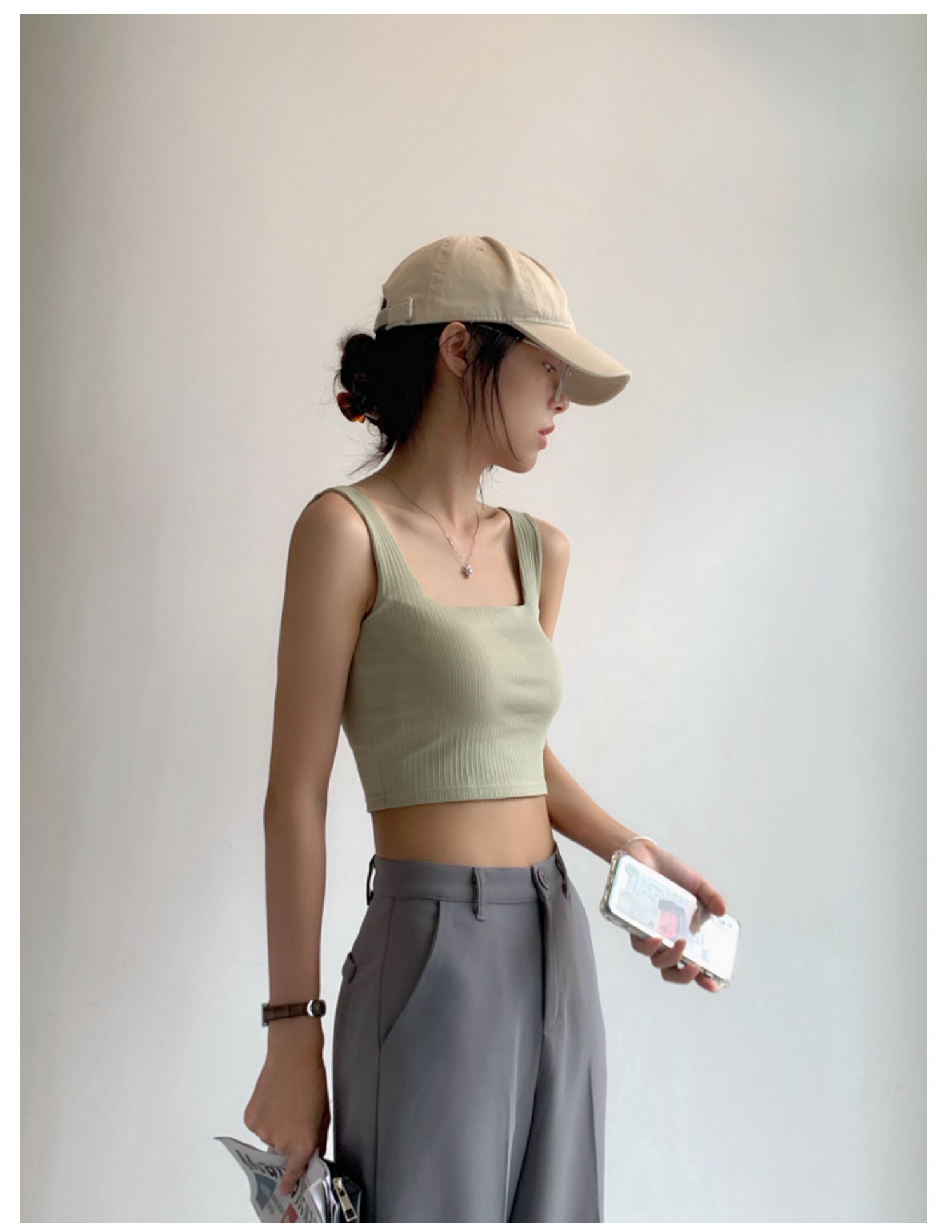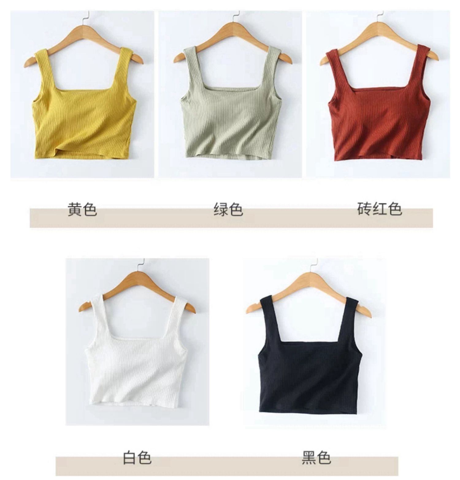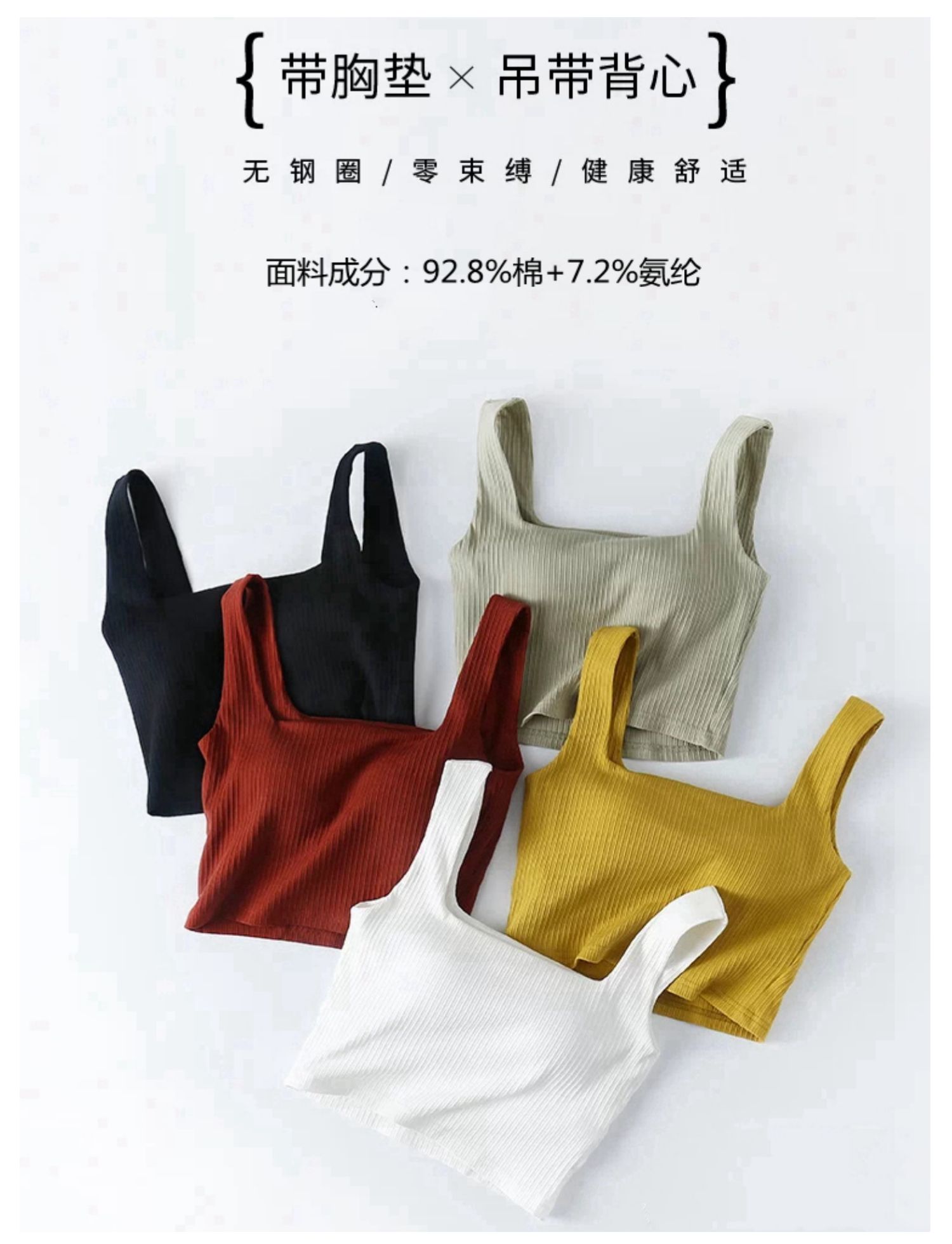 帶胸墊一字方領短款背心女夏外穿無袖露臍純棉吊帶防走光打底上衣
