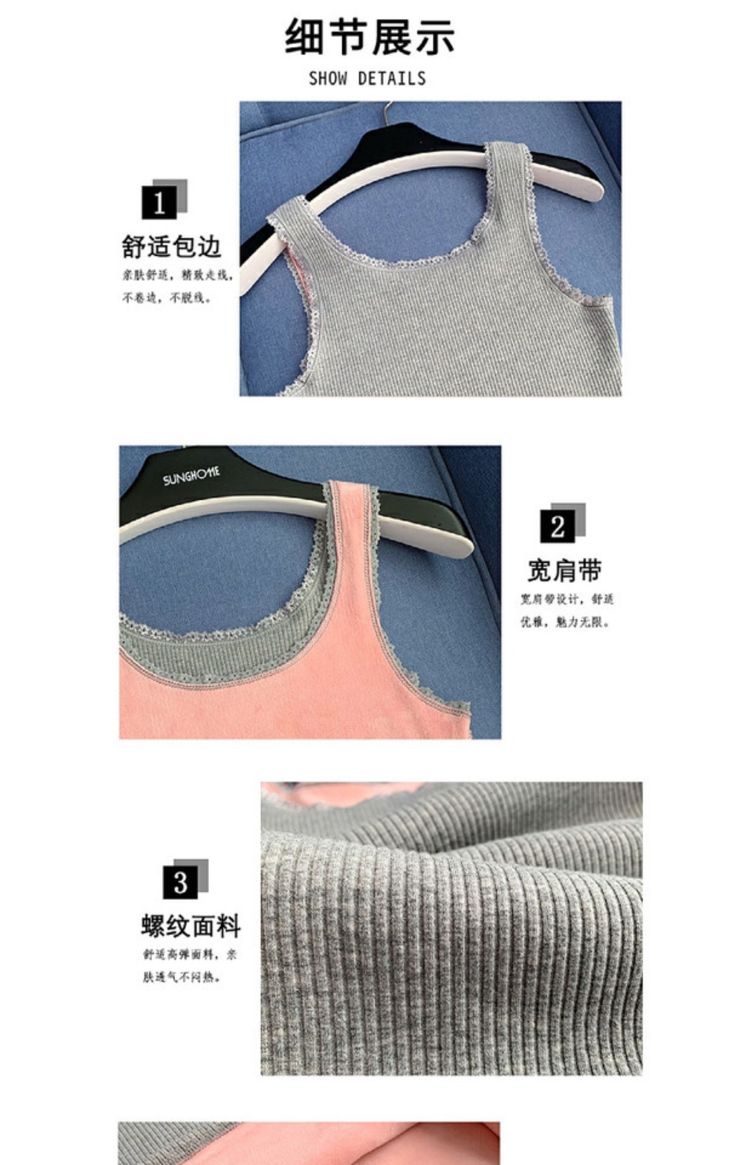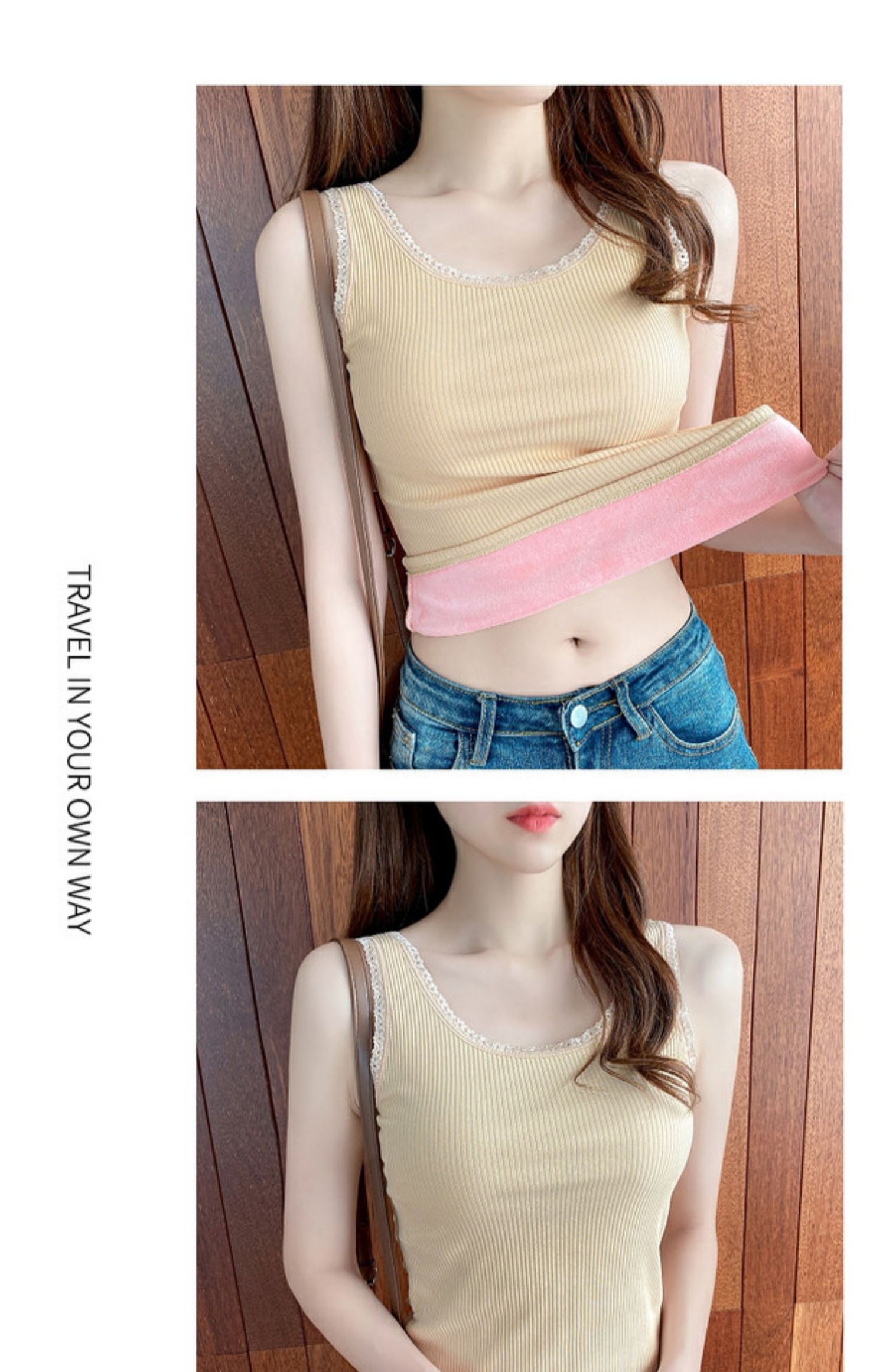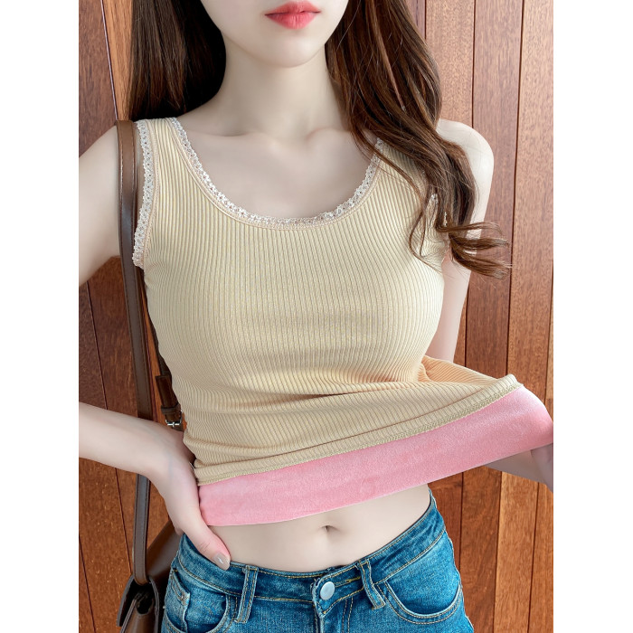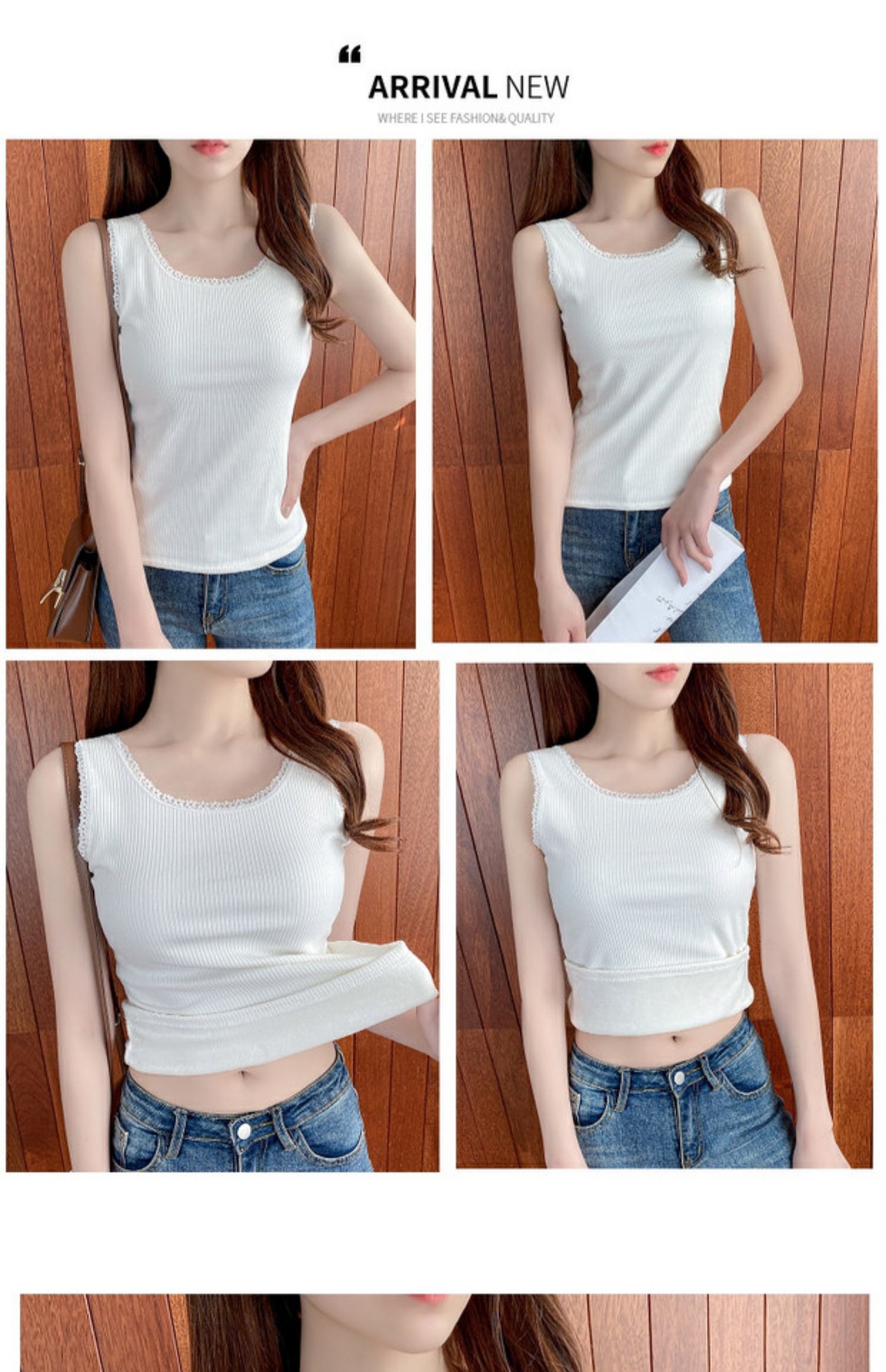 保暖背心女加絨加厚秋冬季螺紋棉蕾絲花邊大碼無袖內搭上衣打底衫