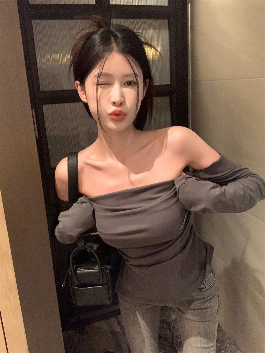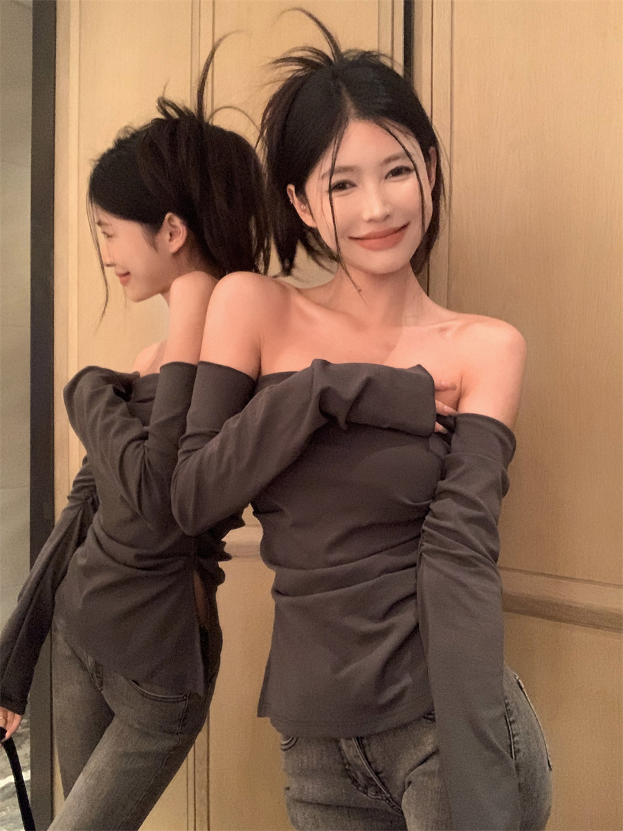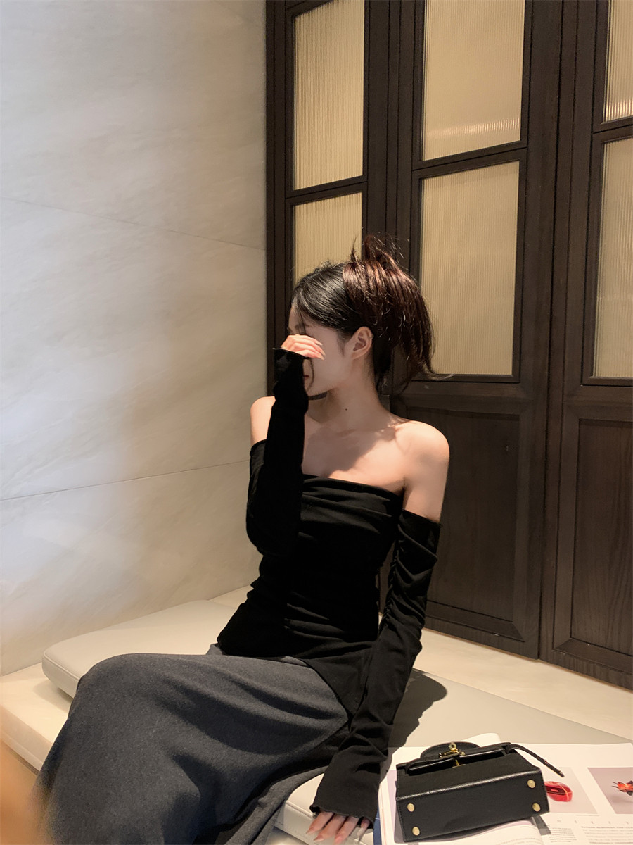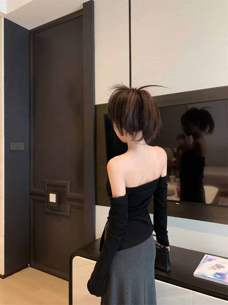 純欲甜辣妹抹胸一字肩上衣女秋冬美拉德不規則開叉長袖打底衫內搭