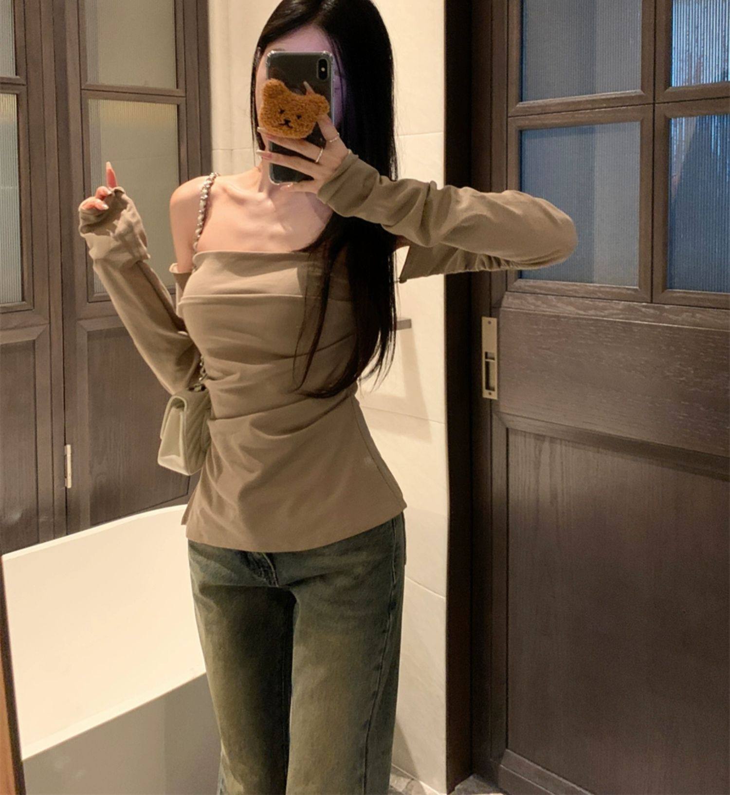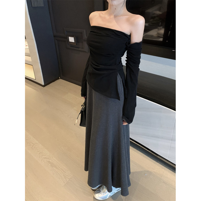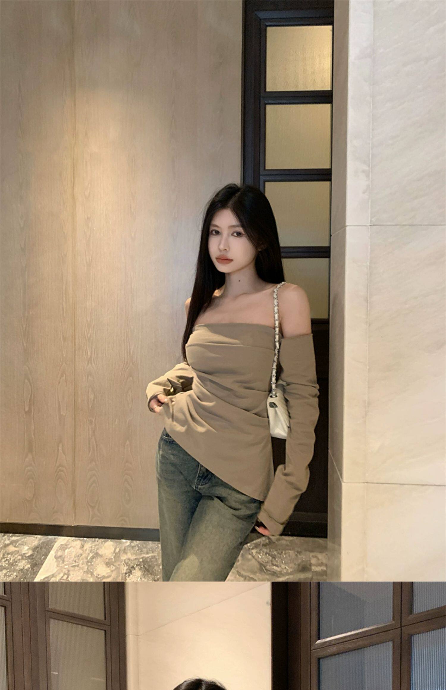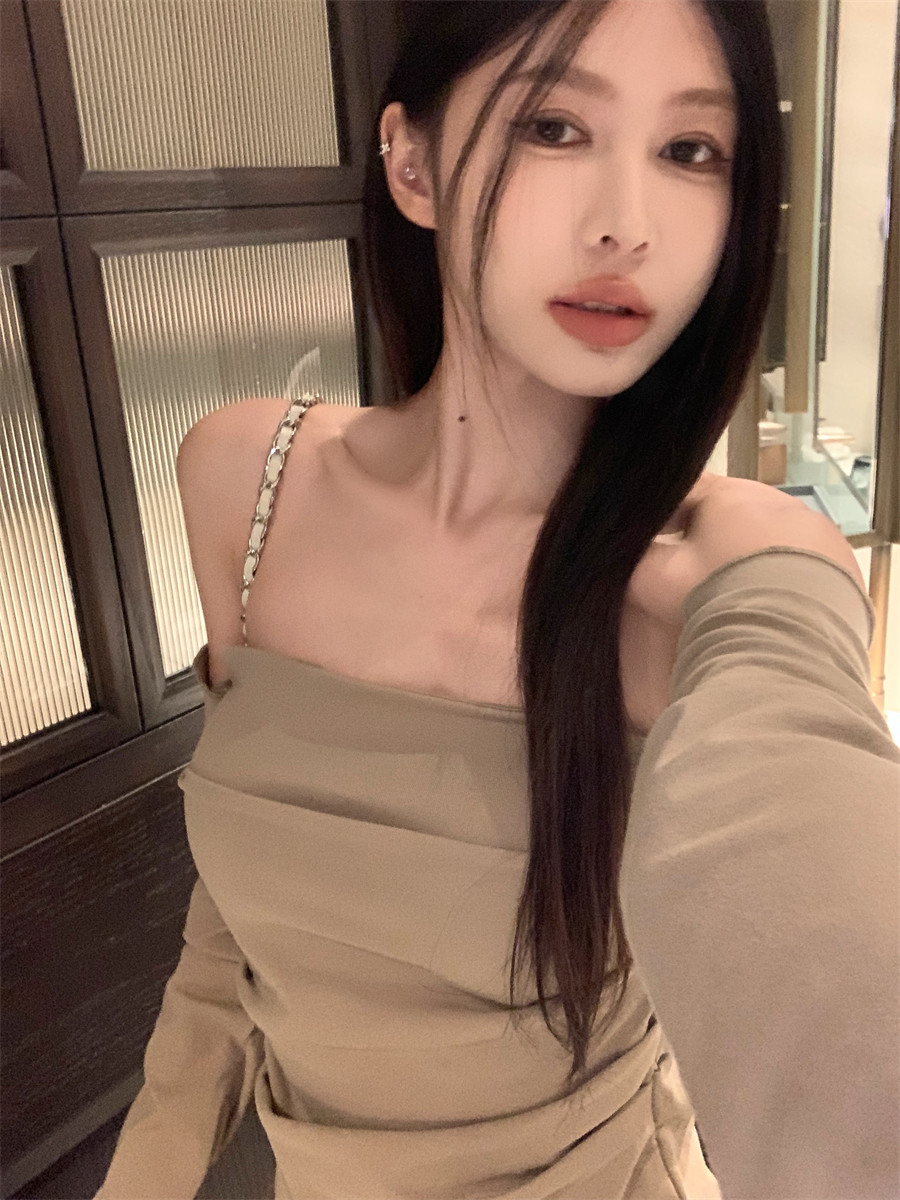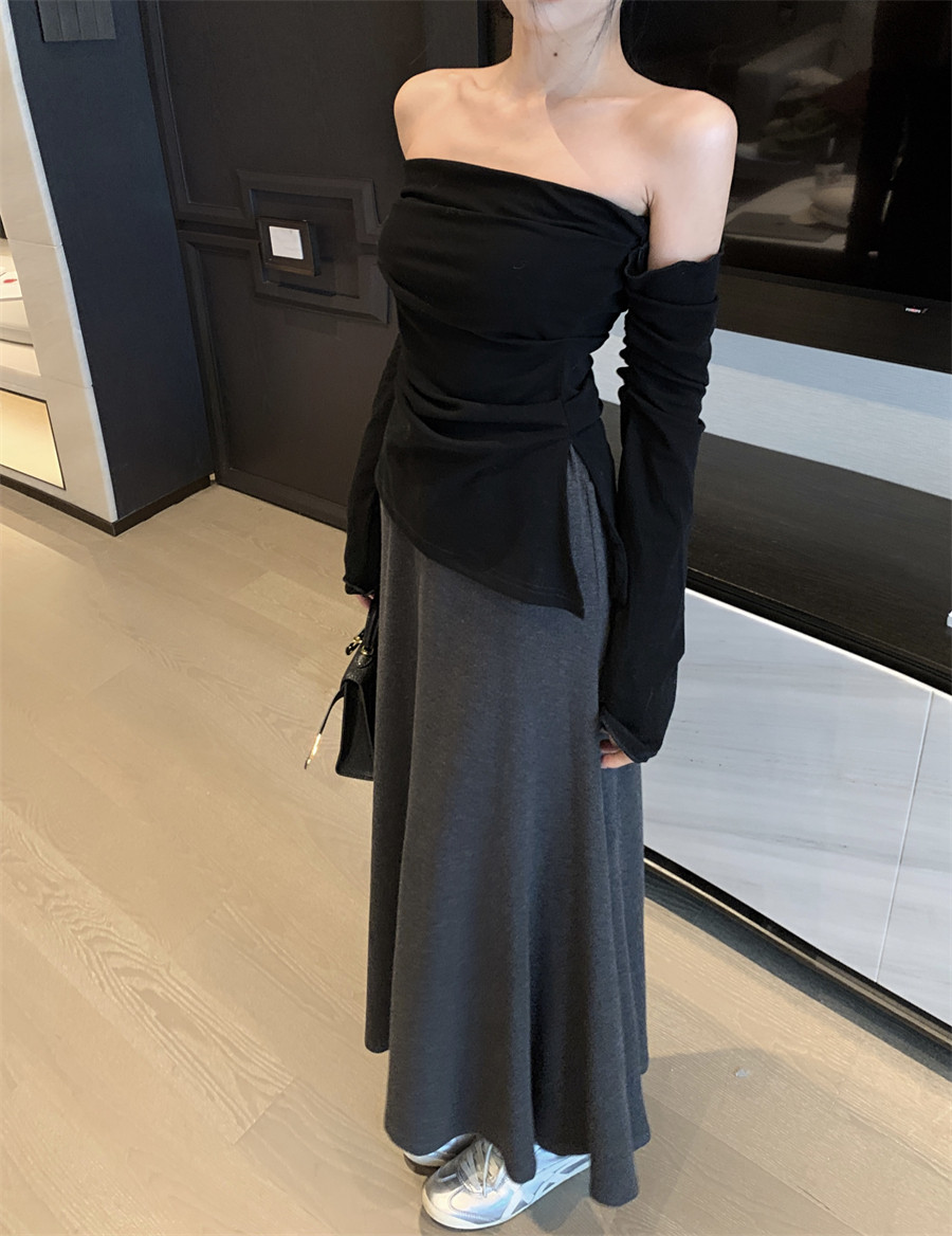 純欲甜辣妹抹胸一字肩上衣女秋冬美拉德不規則開叉長袖打底衫內搭