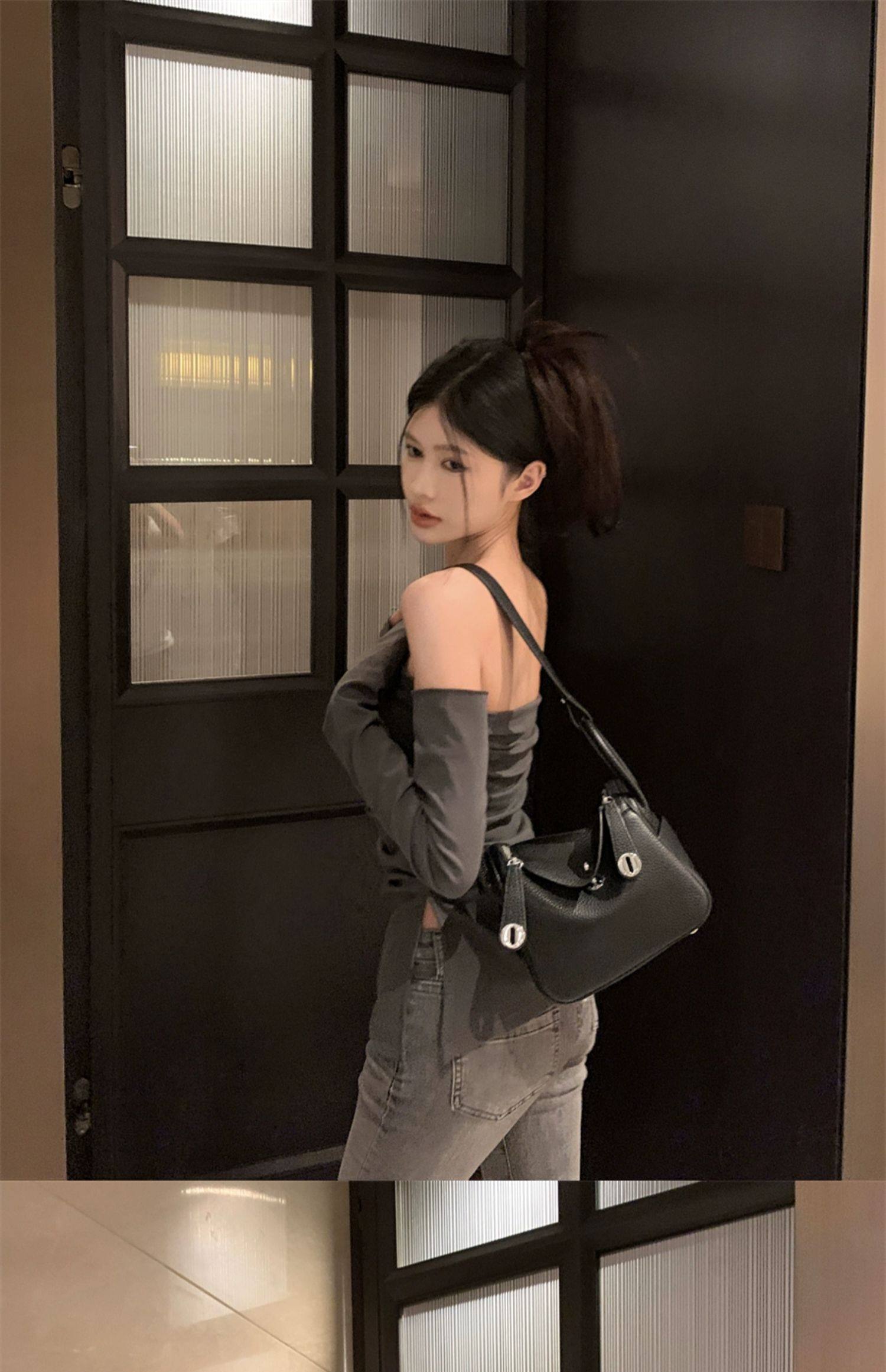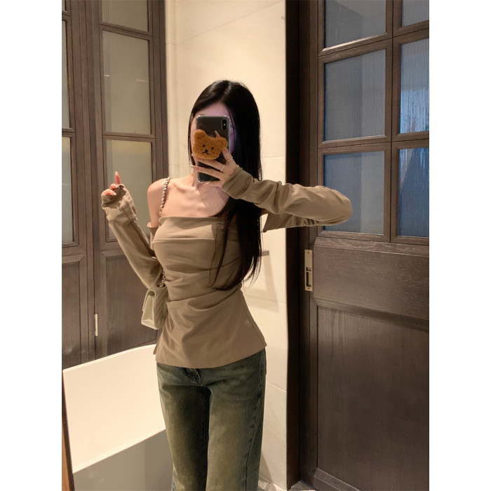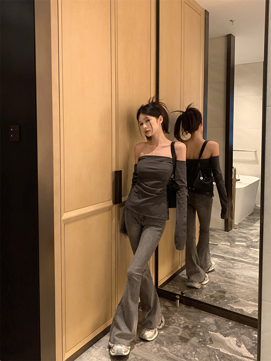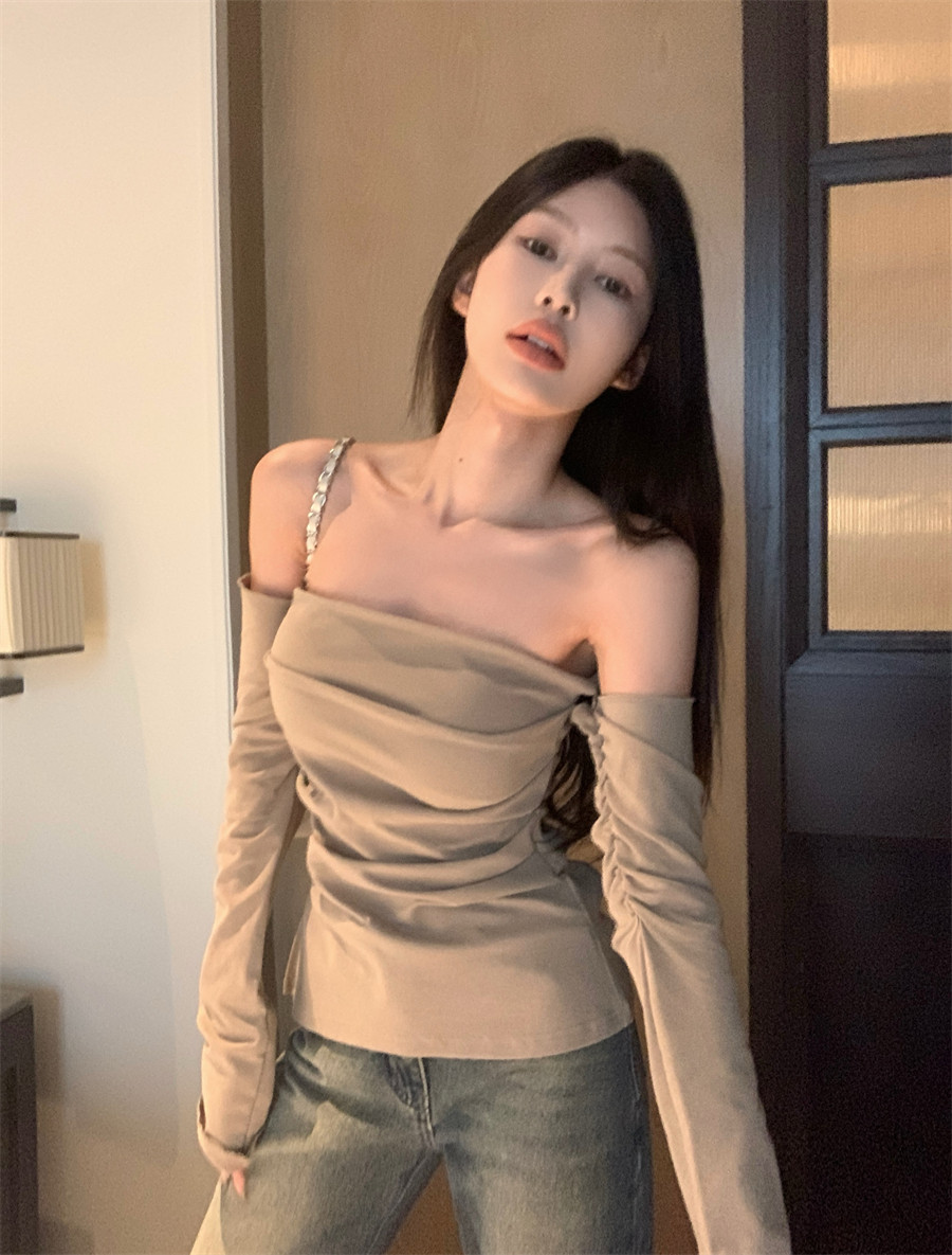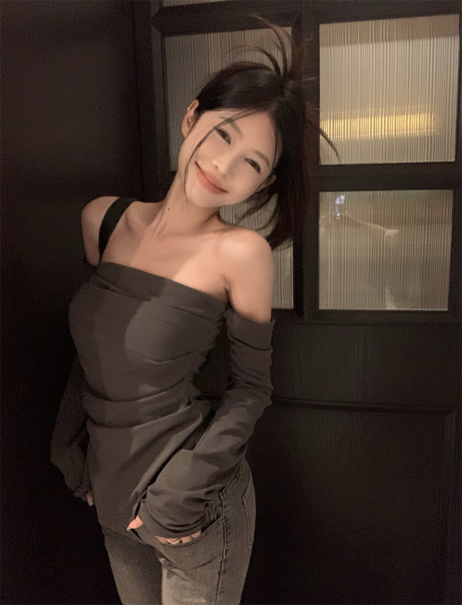 純欲甜辣妹抹胸一字肩上衣女秋冬美拉德不規則開叉長袖打底衫內搭