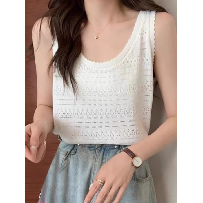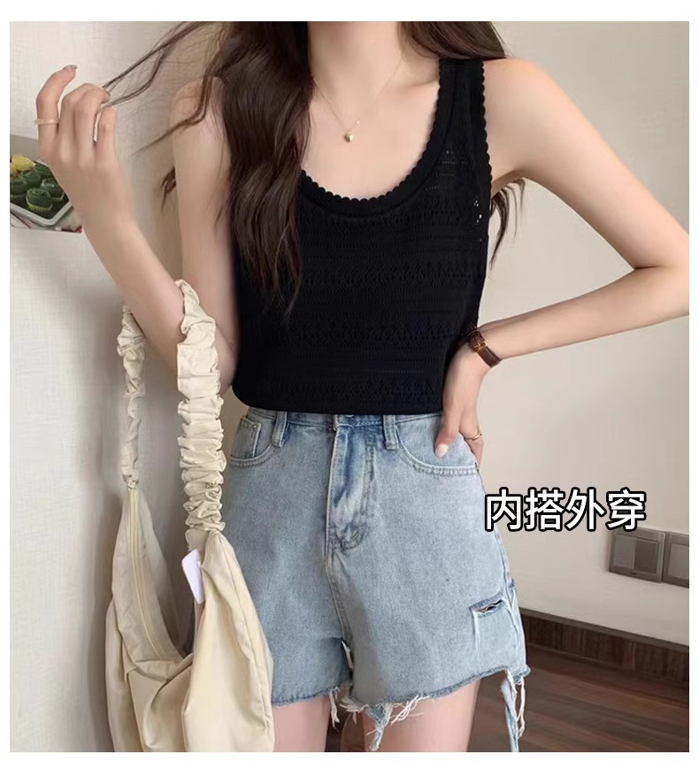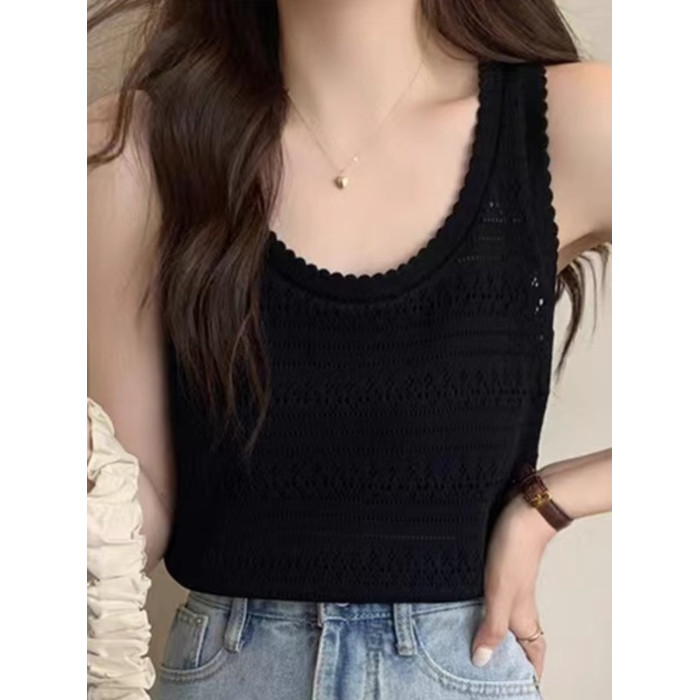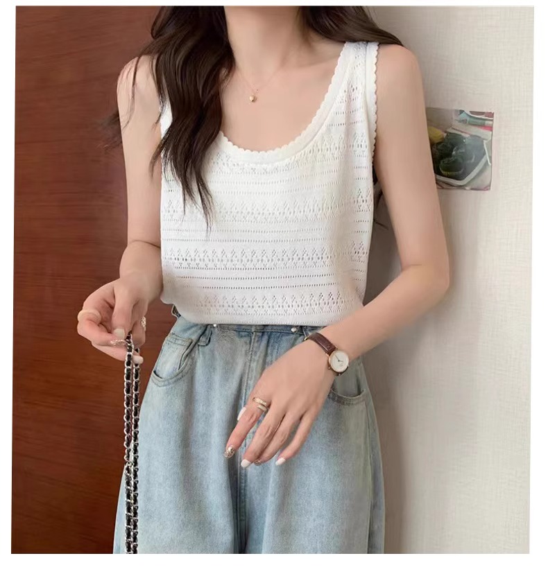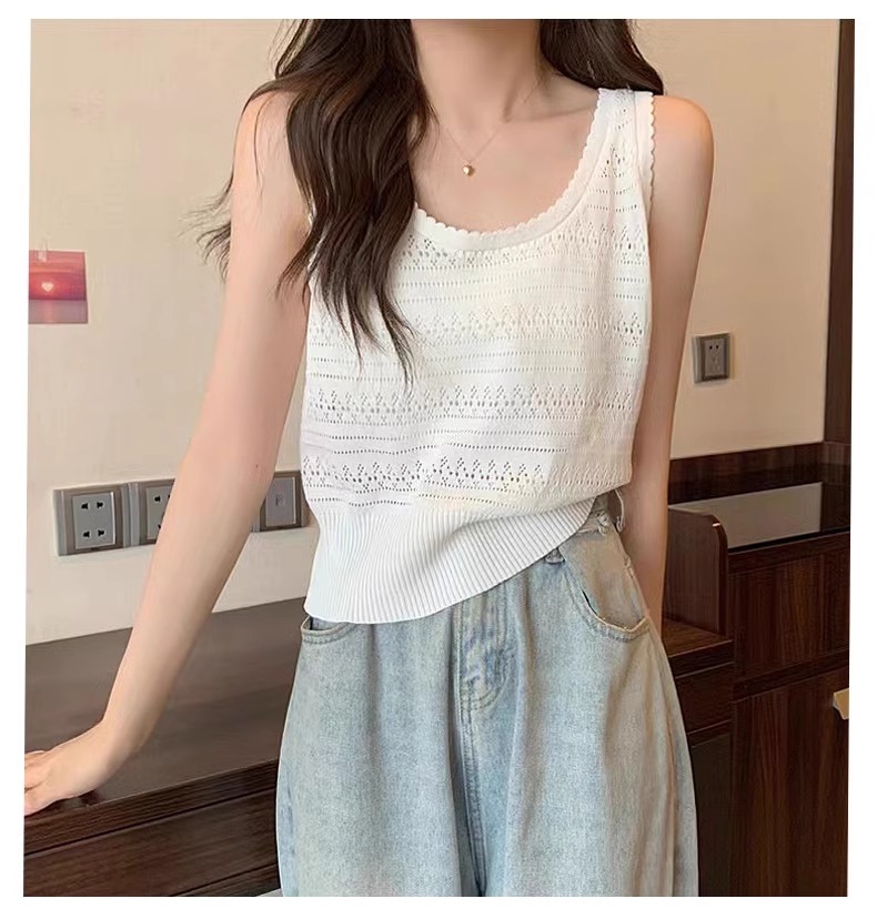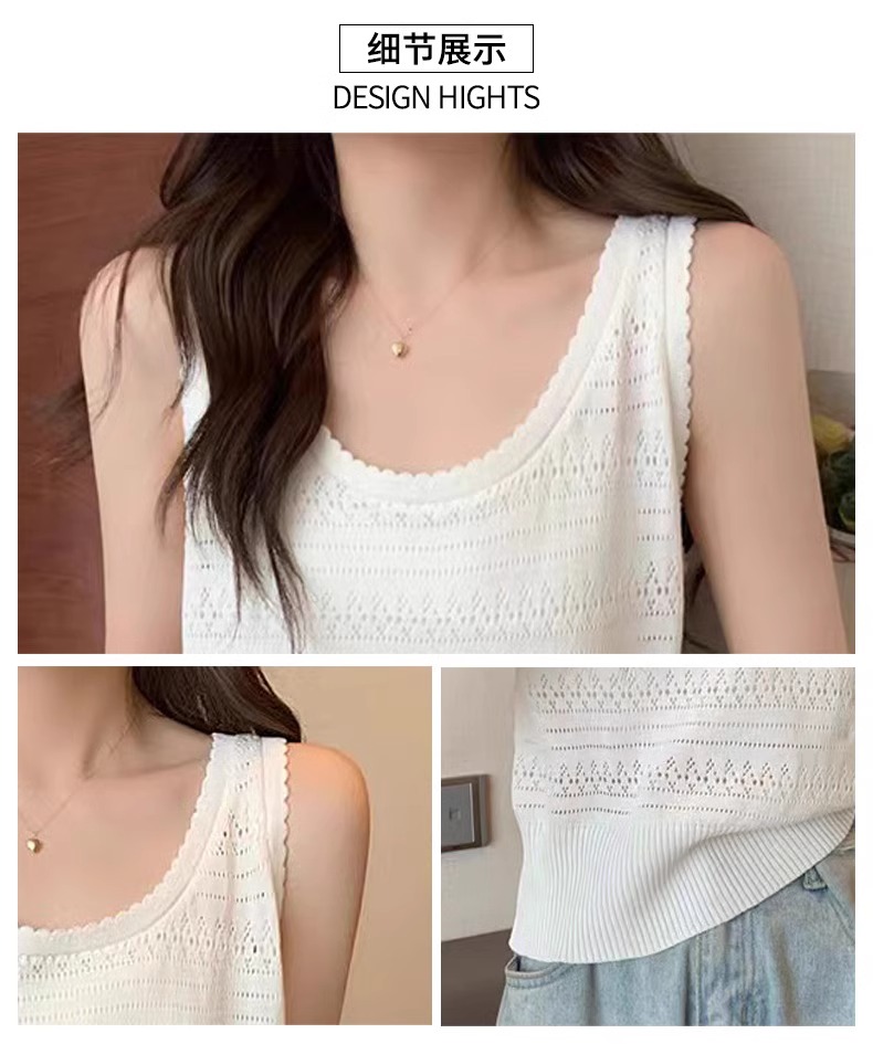 法式U領鏤空針織白色吊帶女薄款外穿上衣夏季設計感冰絲鉤花背心