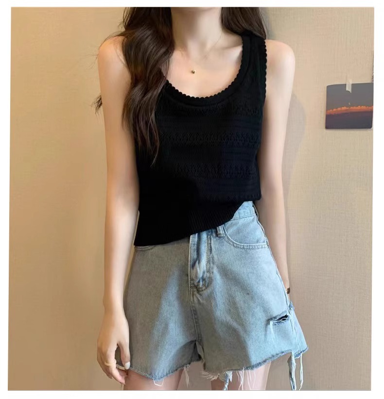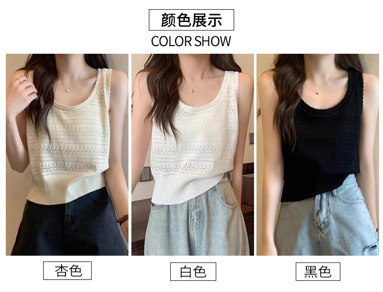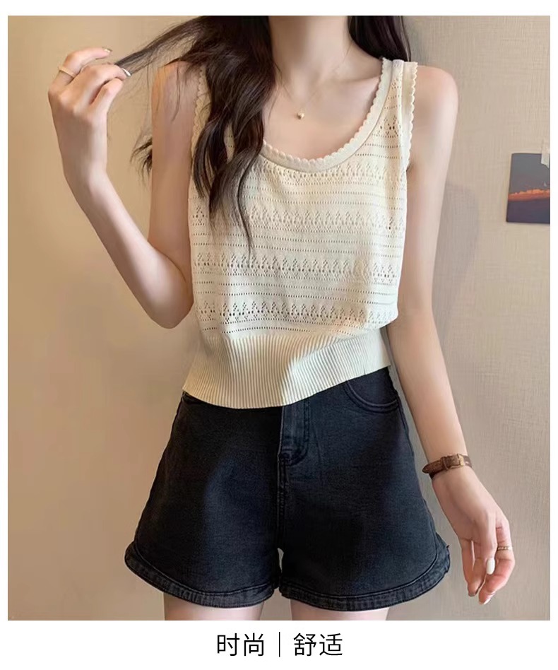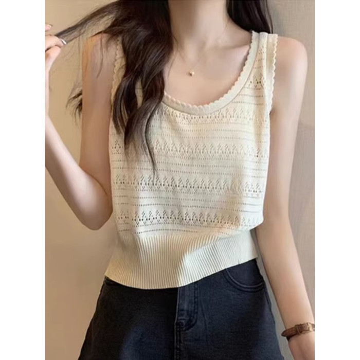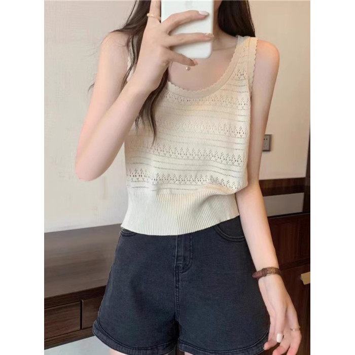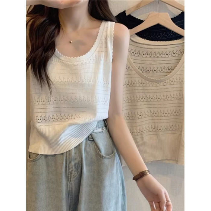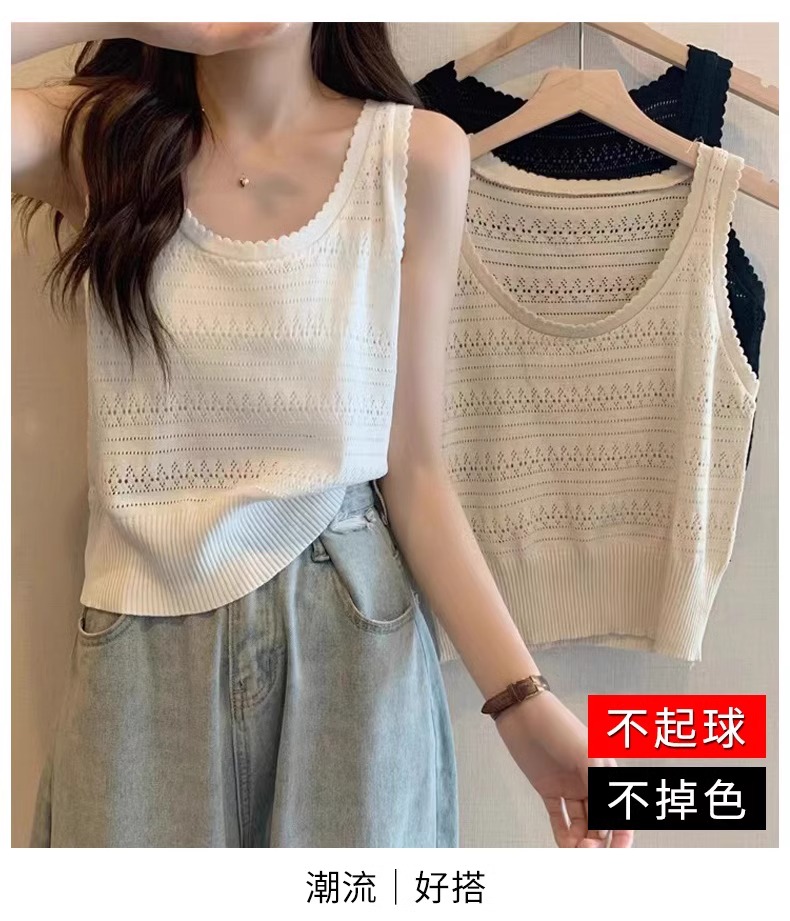 法式U領鏤空針織白色吊帶女薄款外穿上衣夏季設計感冰絲鉤花背心