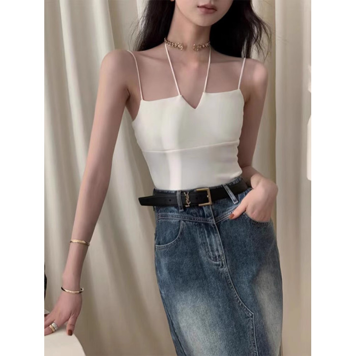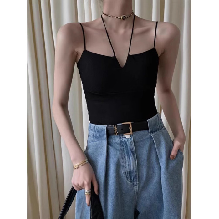 法式別致設計感黑色掛脖吊帶背心女夏外穿內搭打底帶胸墊無袖上衣