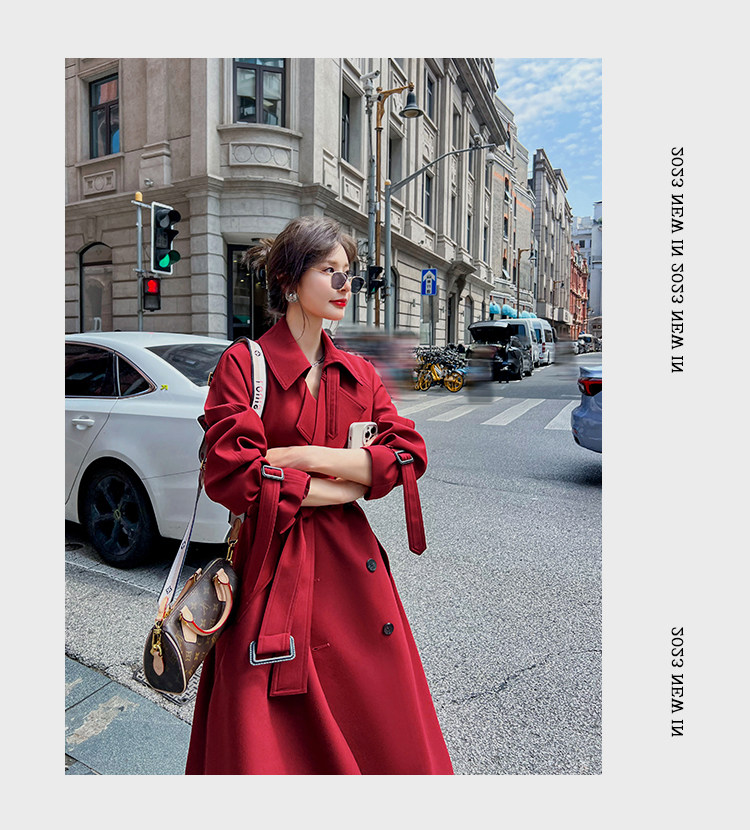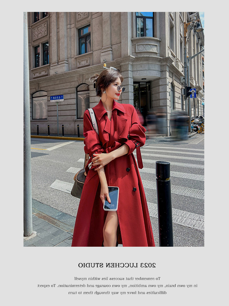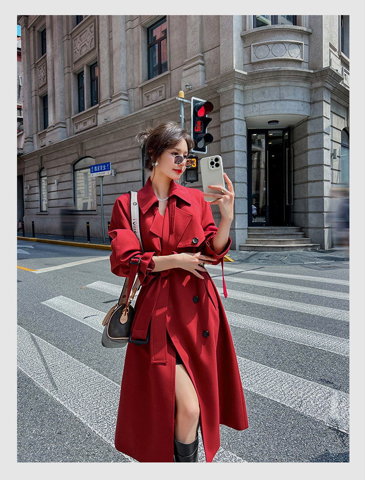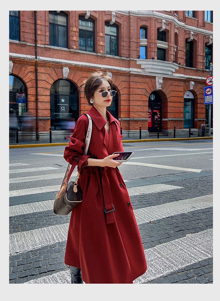 紅色風衣外套女中長款2025春秋新款韓系英倫風垂感小個子氣質大衣