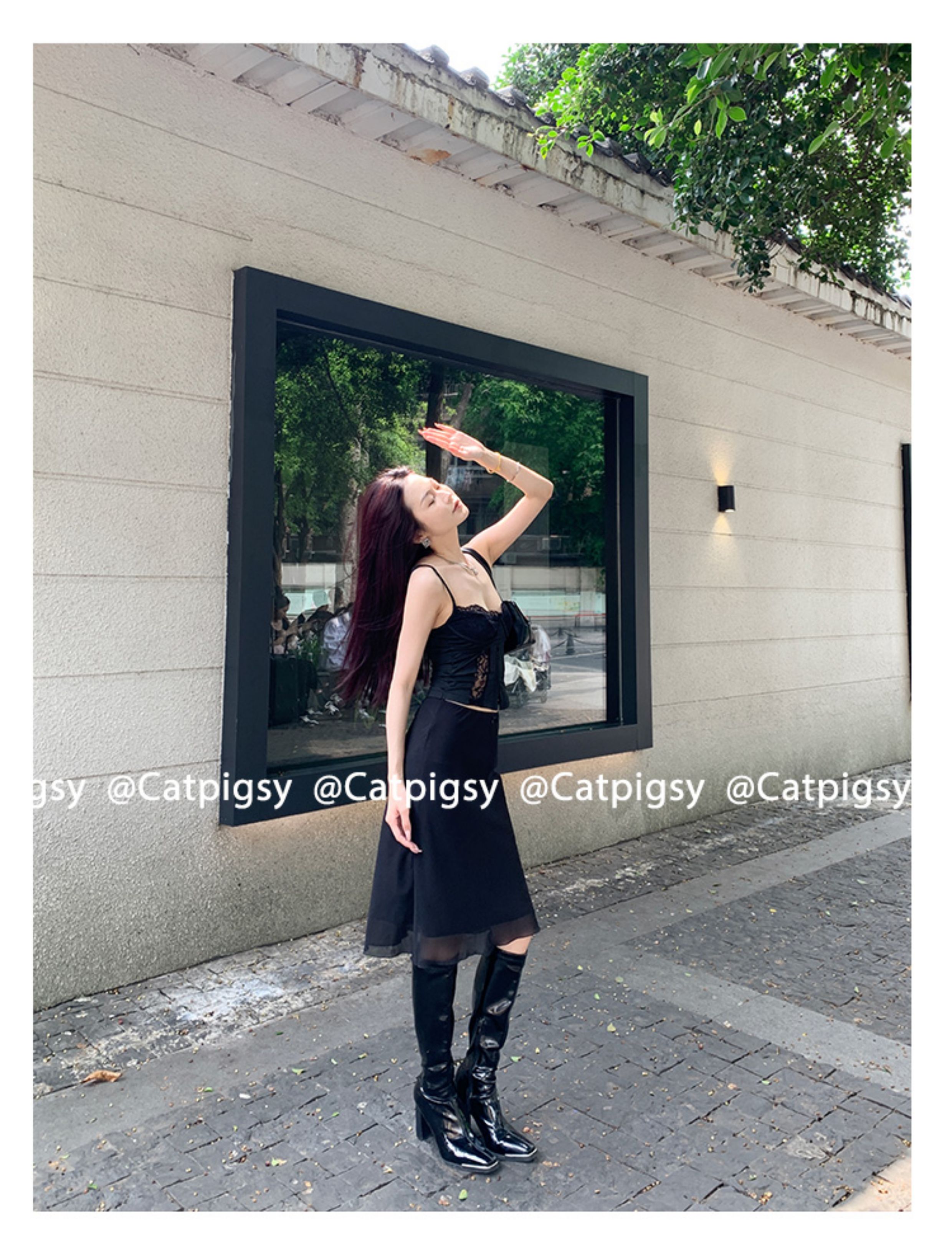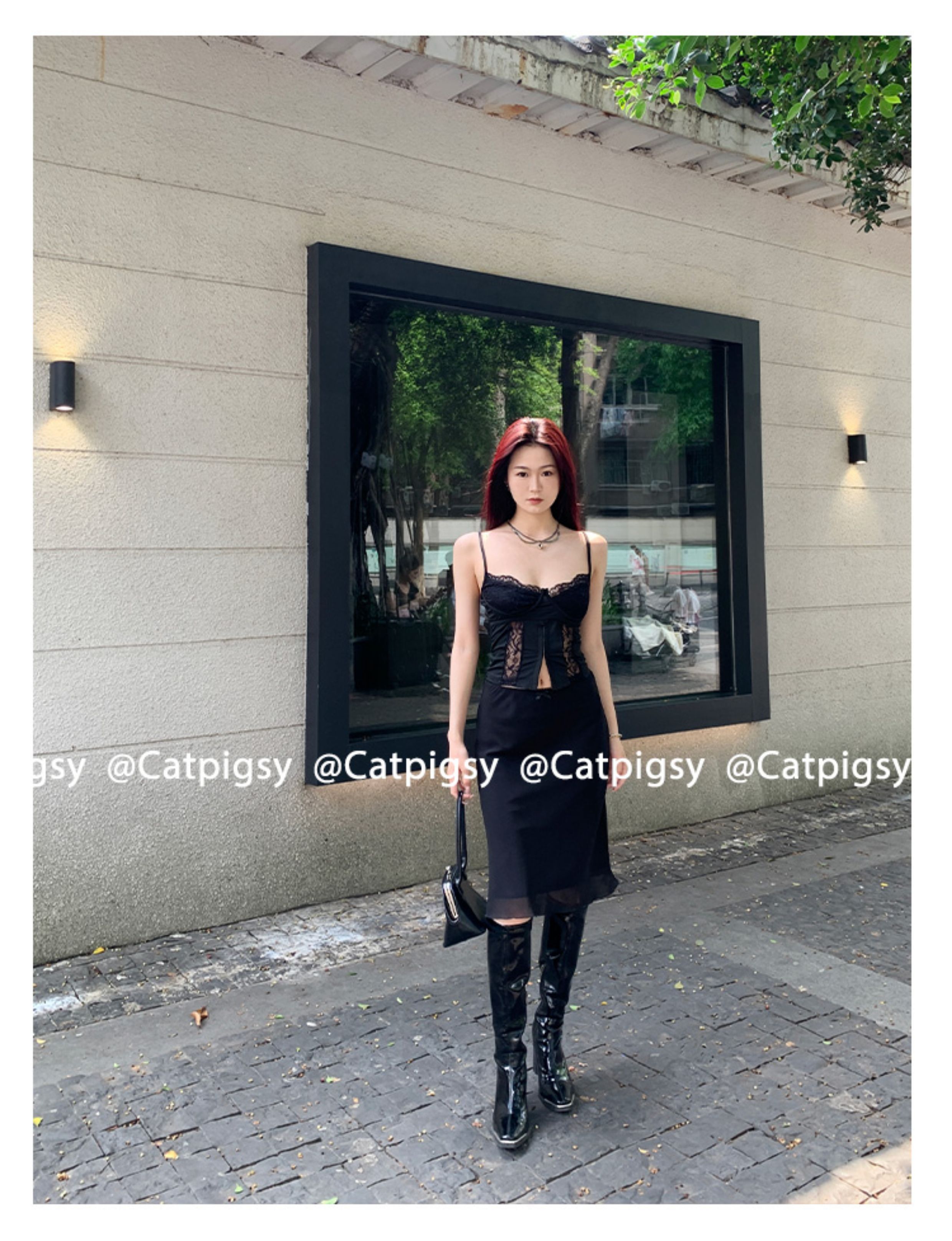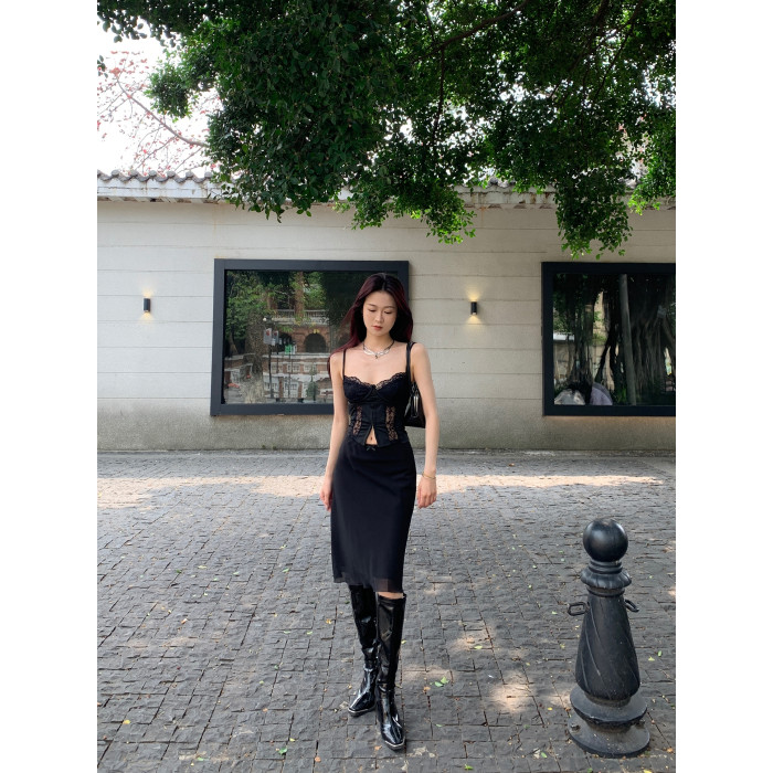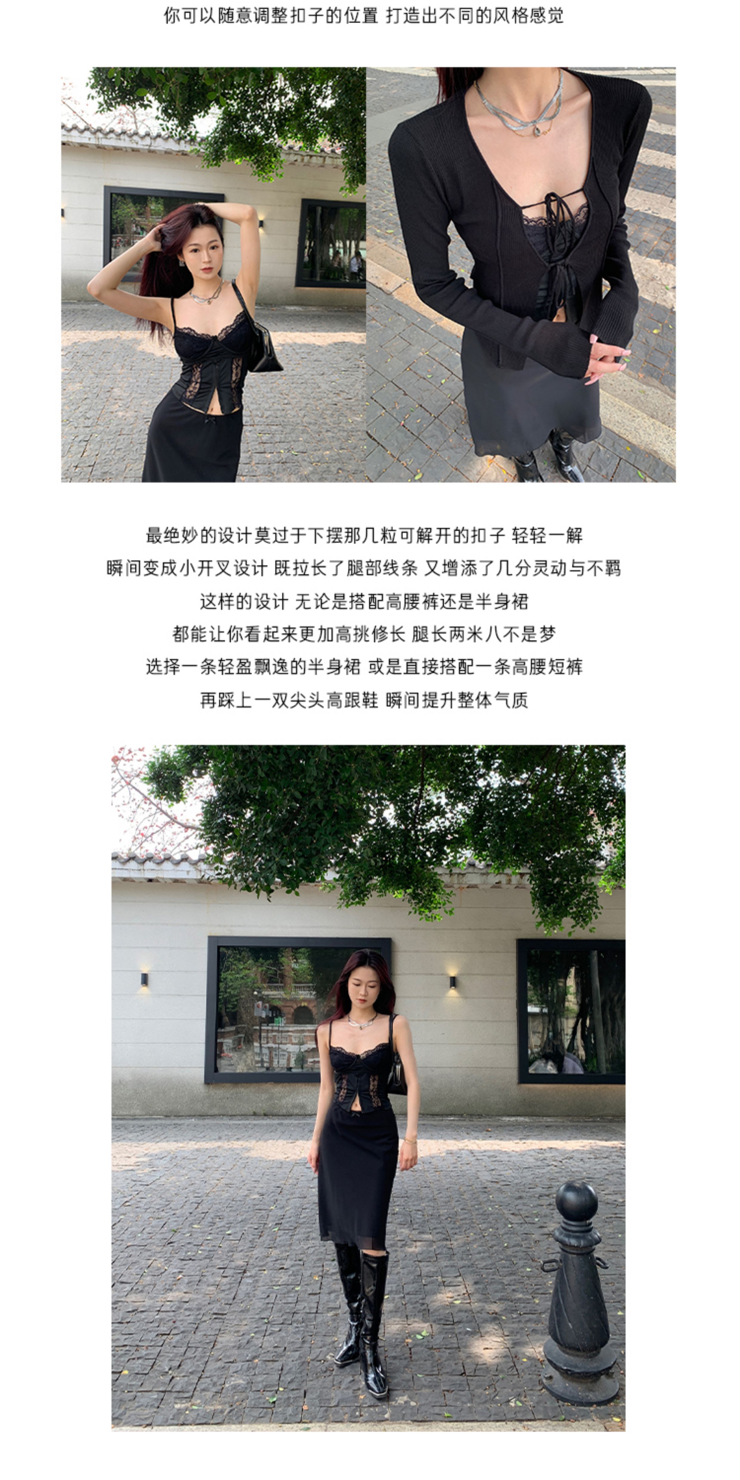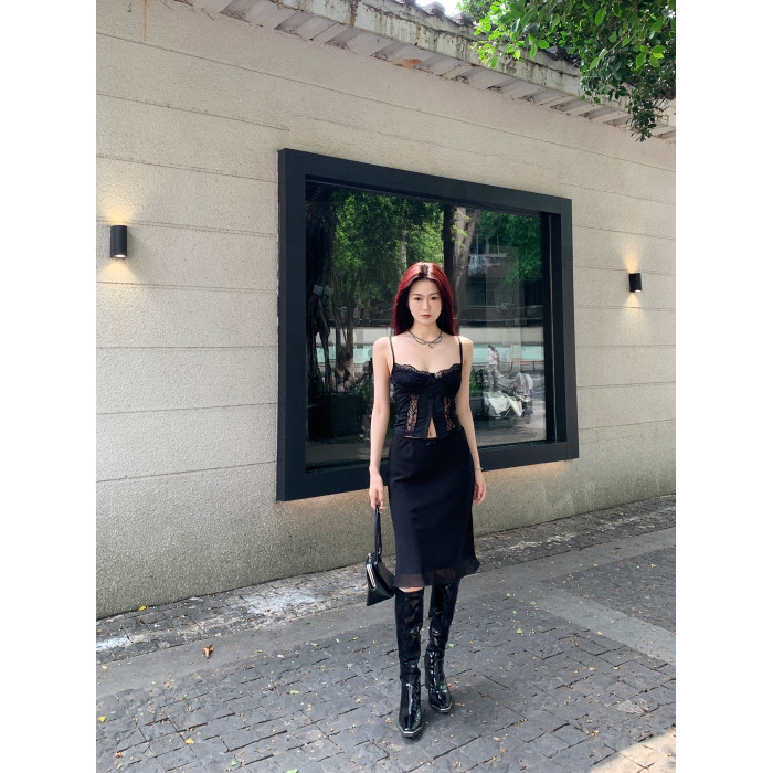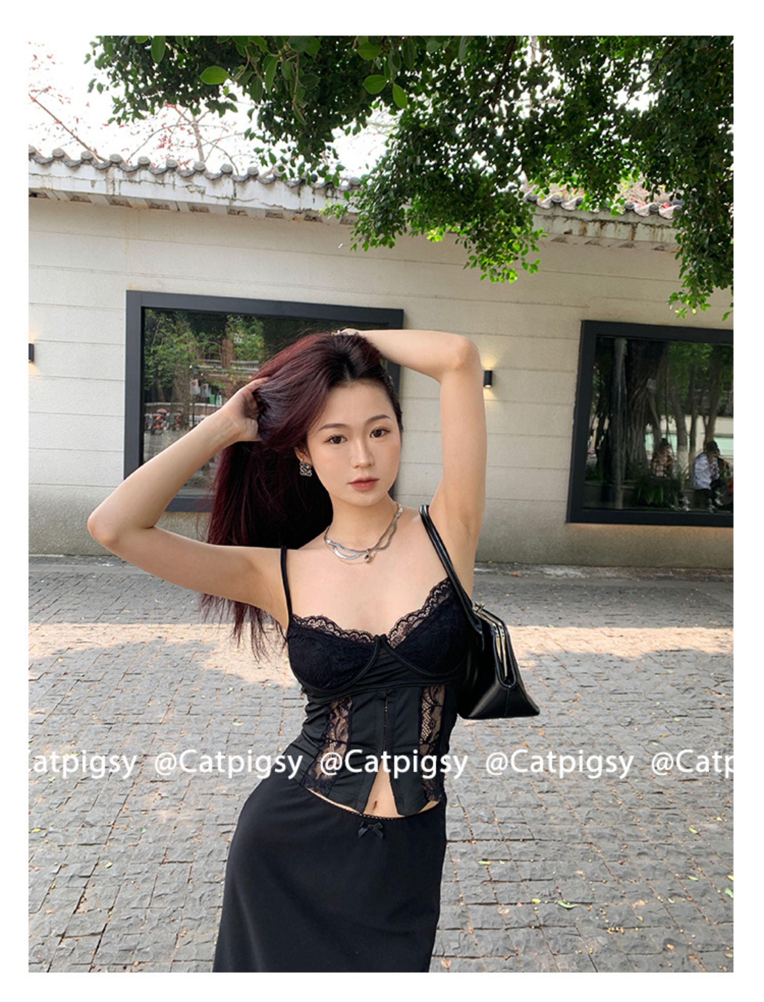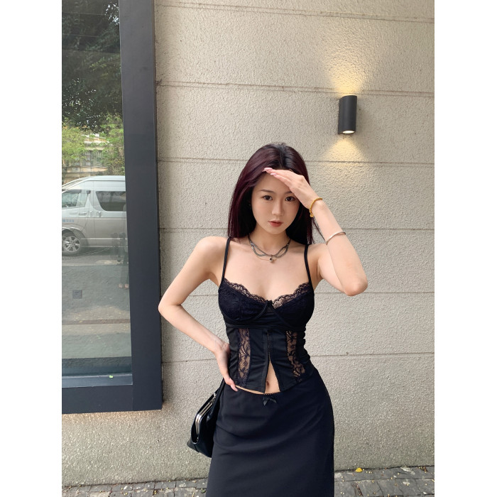 Wild Kiwi 黑色蕾絲吊帶背心女新款辣妹修身顯瘦內搭外穿短款上衣