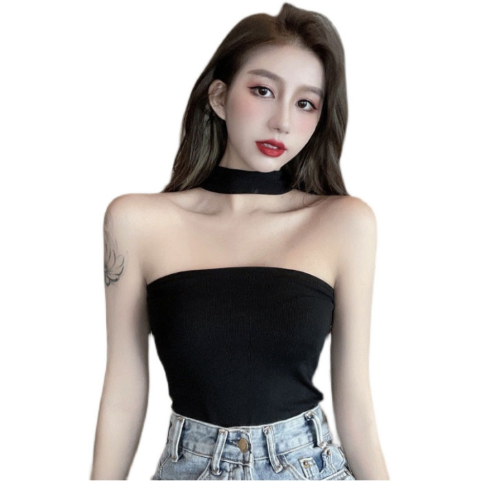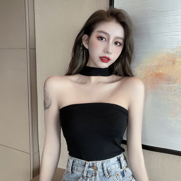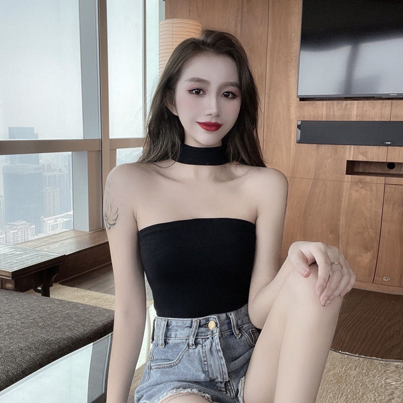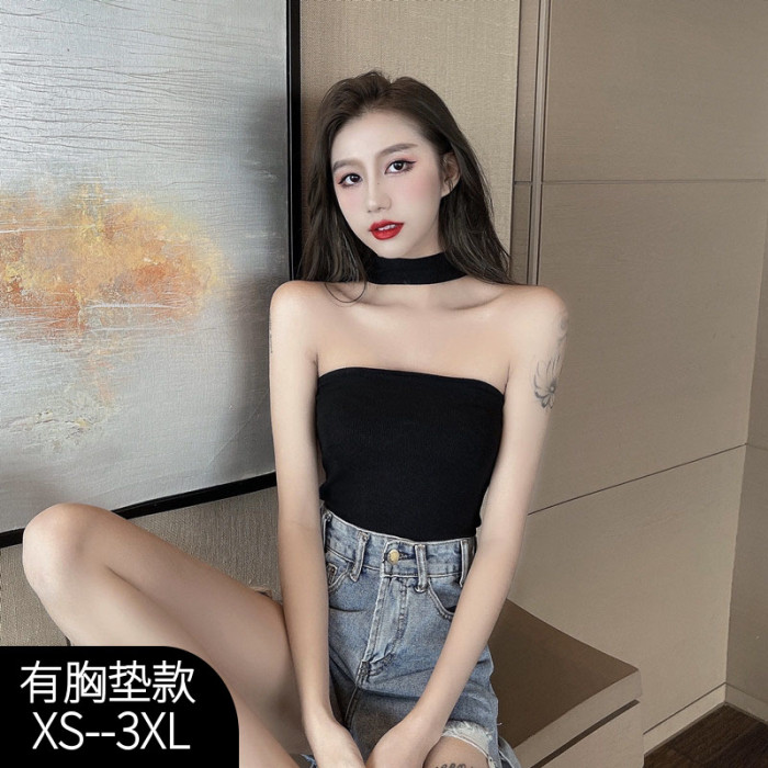 帶胸墊掛脖吊帶女設計感美式妹外穿黑色抹胸上衣夏季性感大碼背心