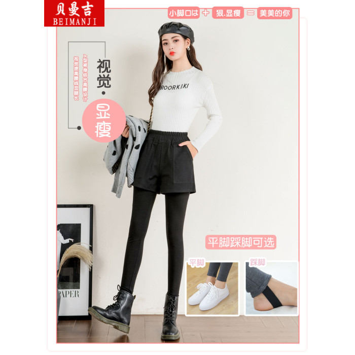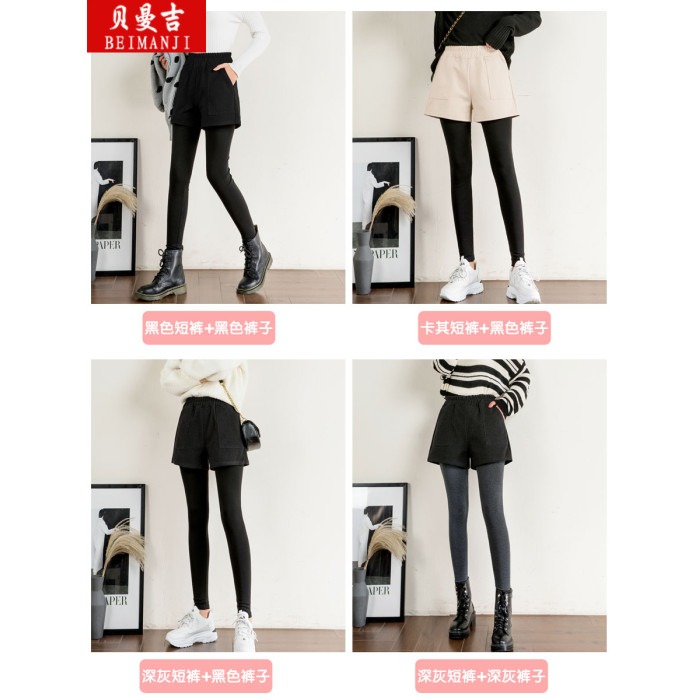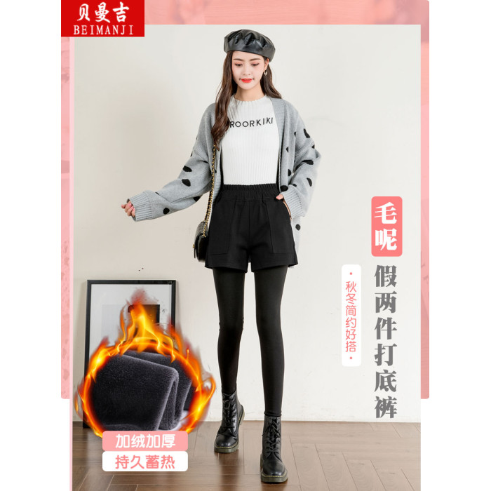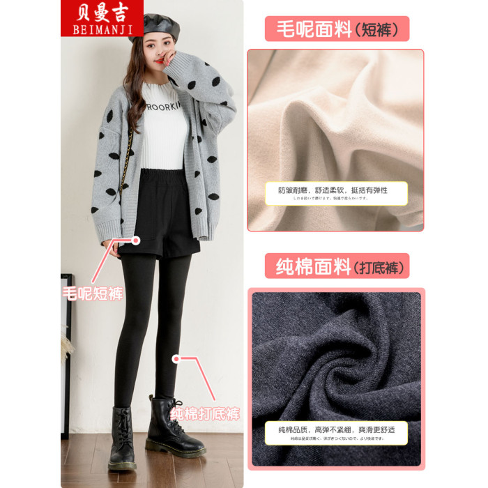 假兩件打底褲女毛呢短褲純棉褲子春秋冬薄款外穿高腰彈力加絨加厚