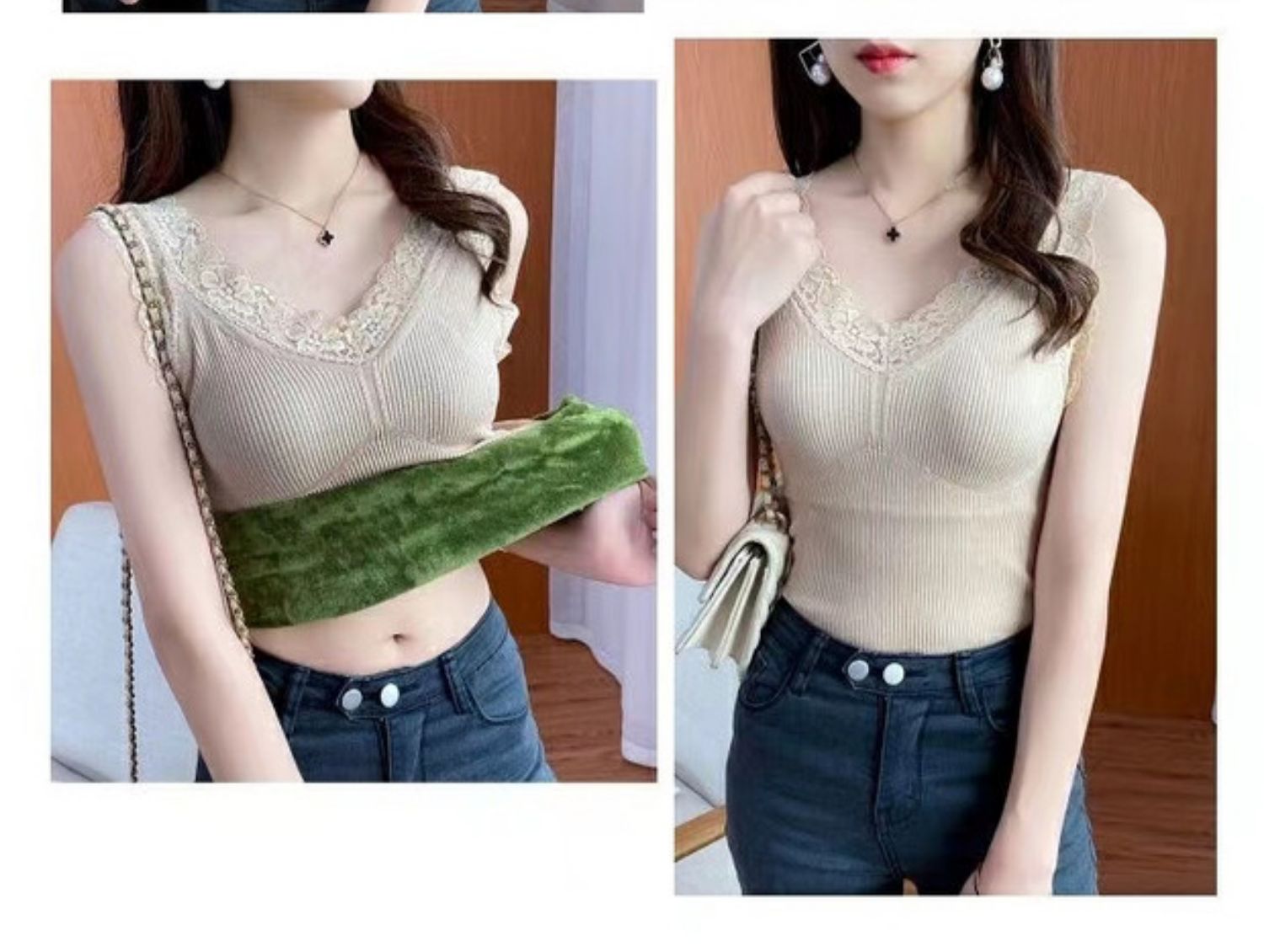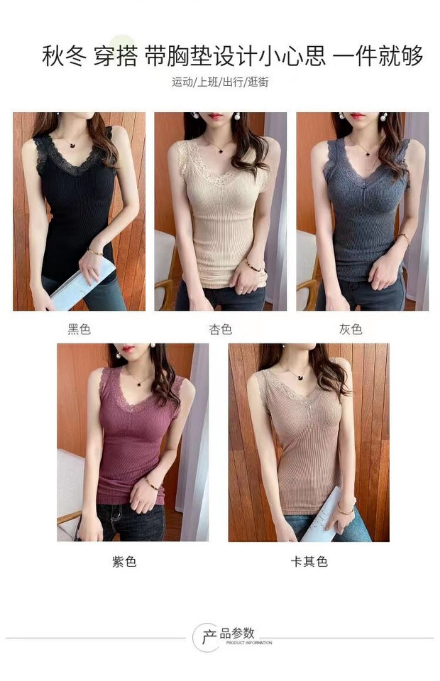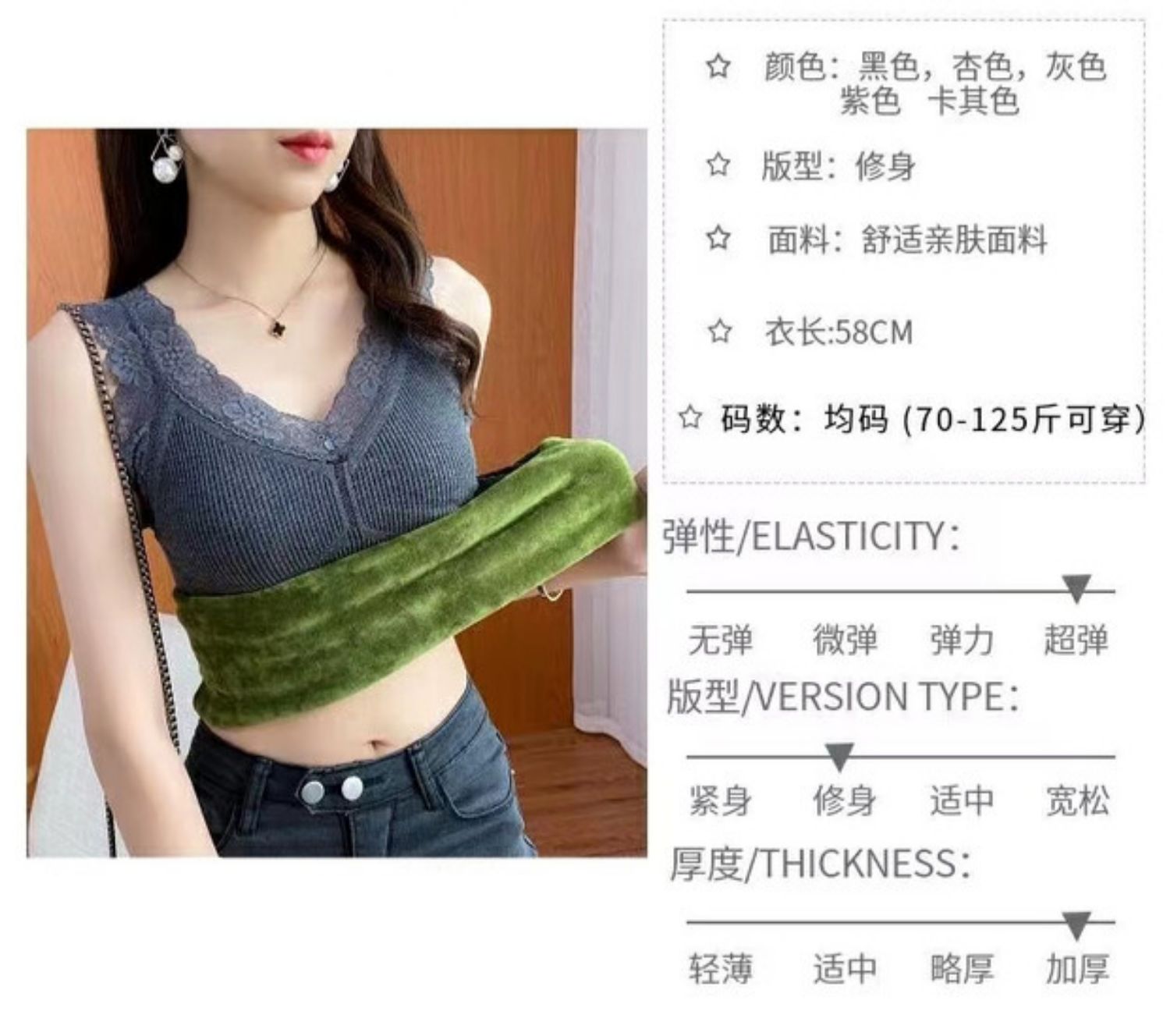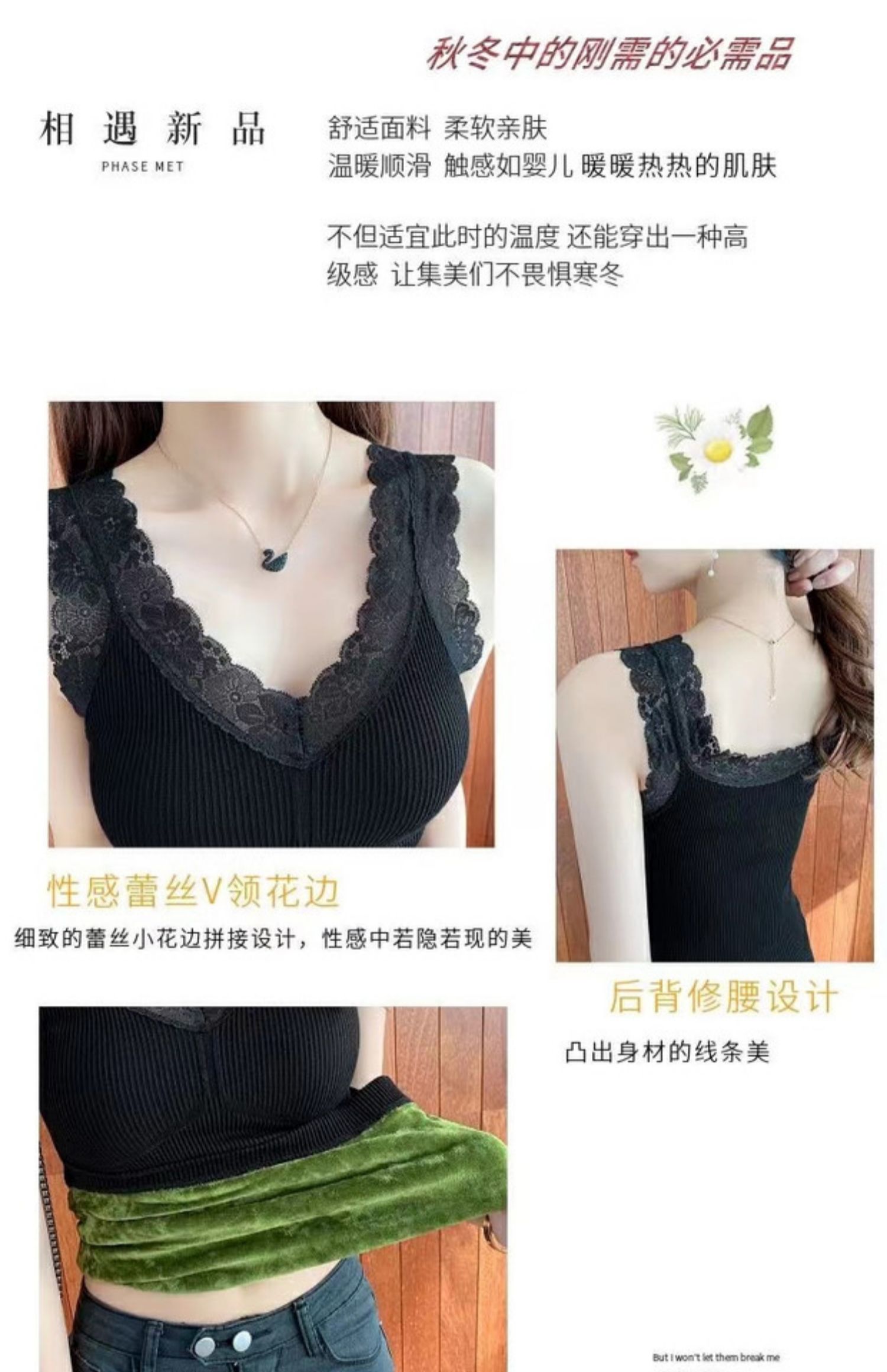 保暖加厚加絨背心女秋冬帶胸墊蕾絲V領內搭吊帶打底衫女上衣性感