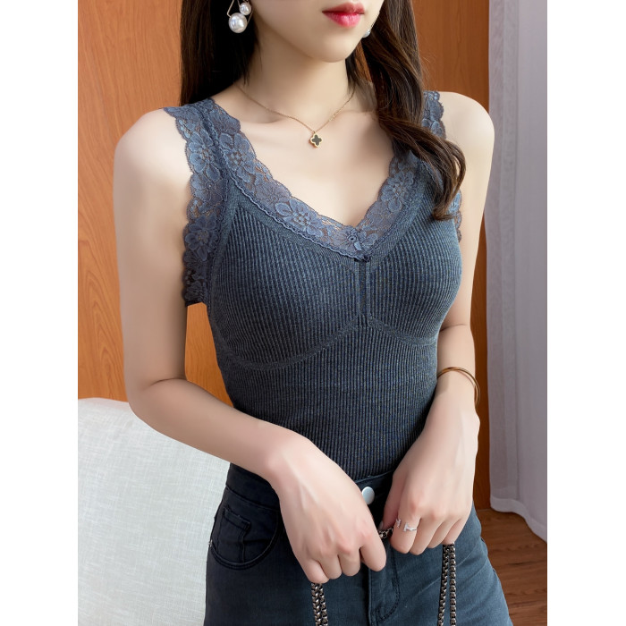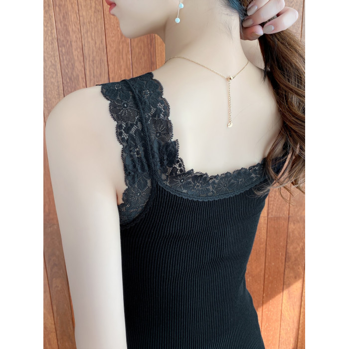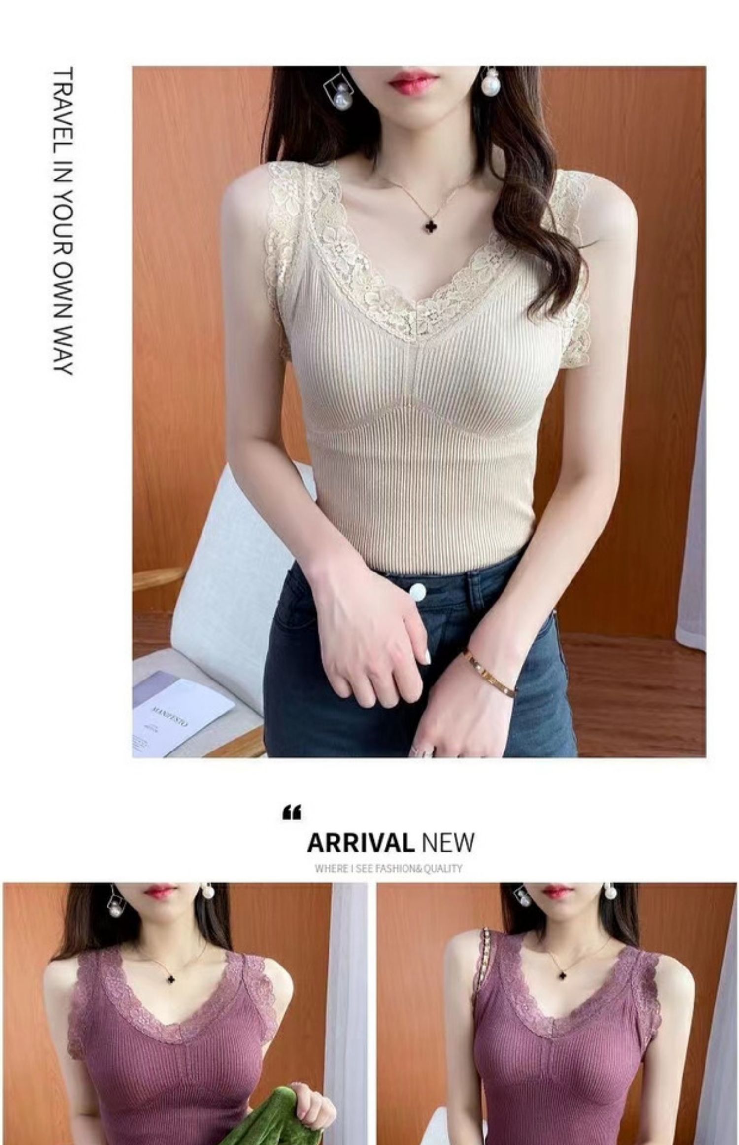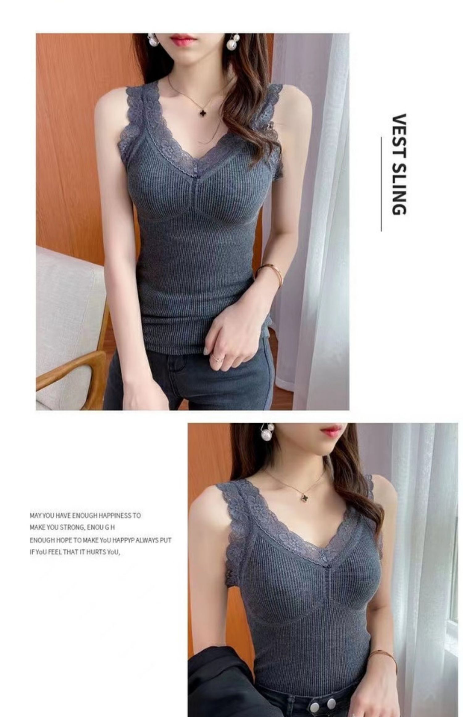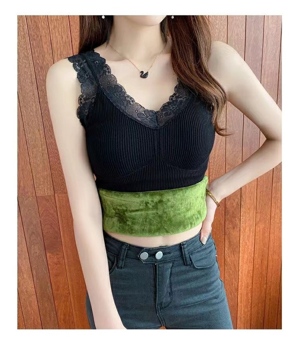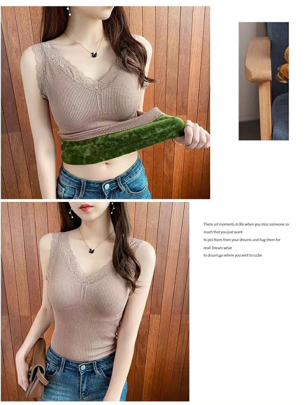 保暖加厚加絨背心女秋冬帶胸墊蕾絲V領內搭吊帶打底衫女上衣性感