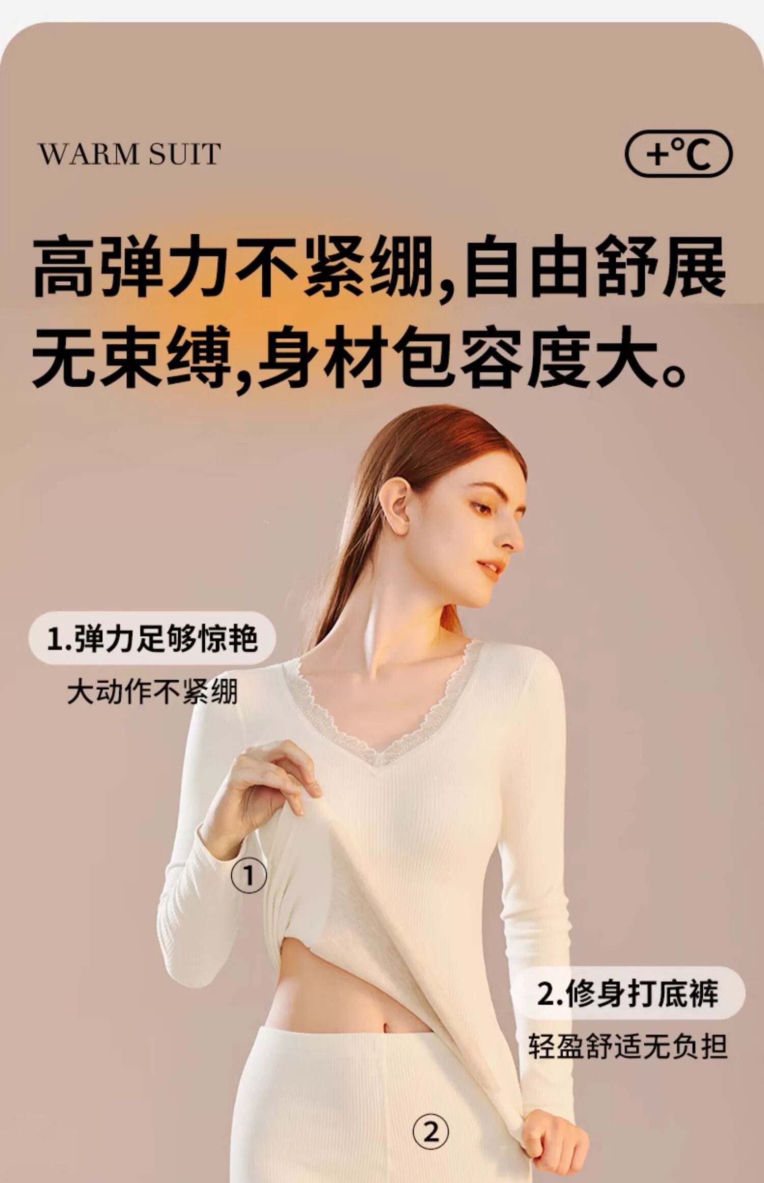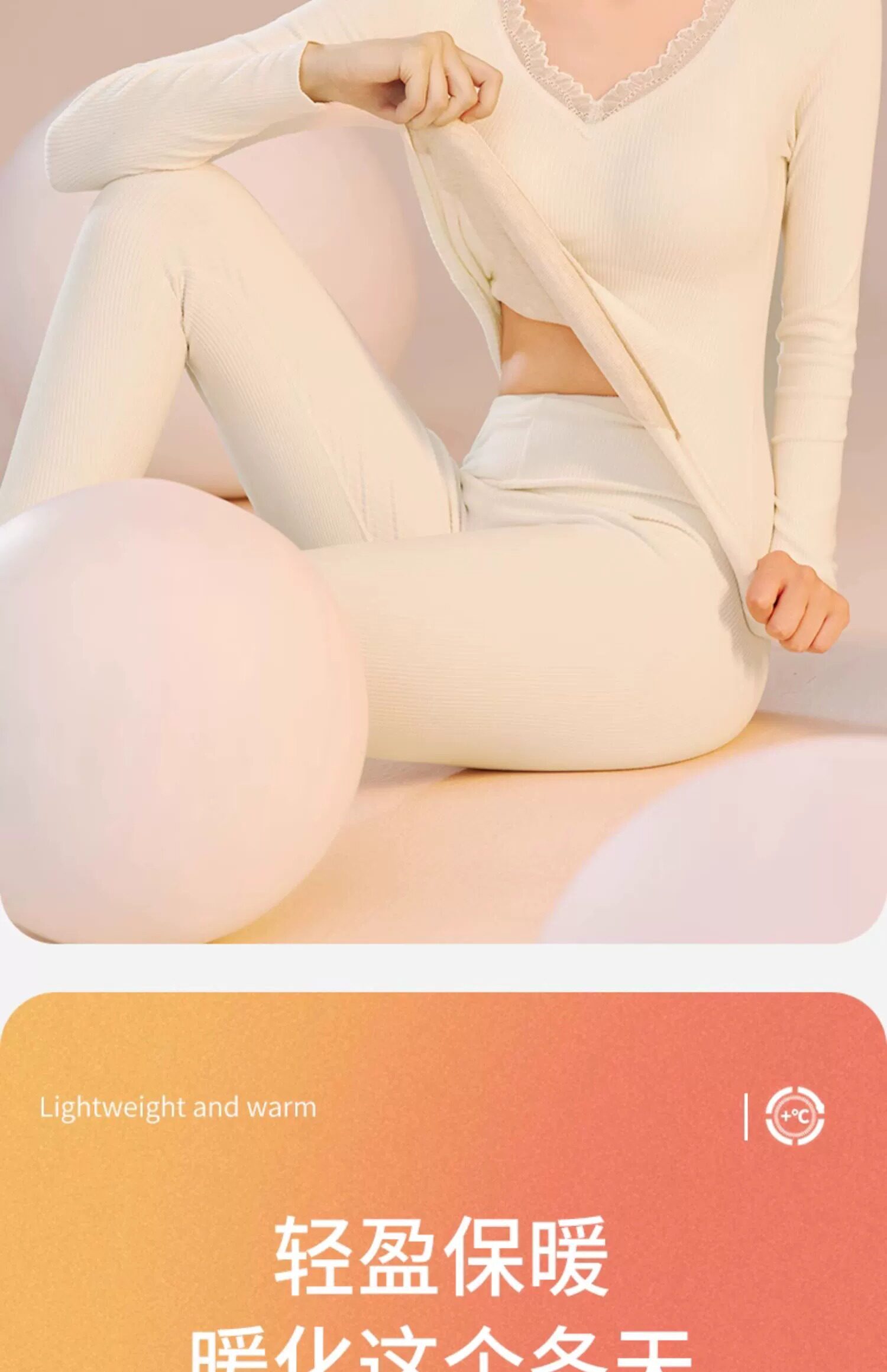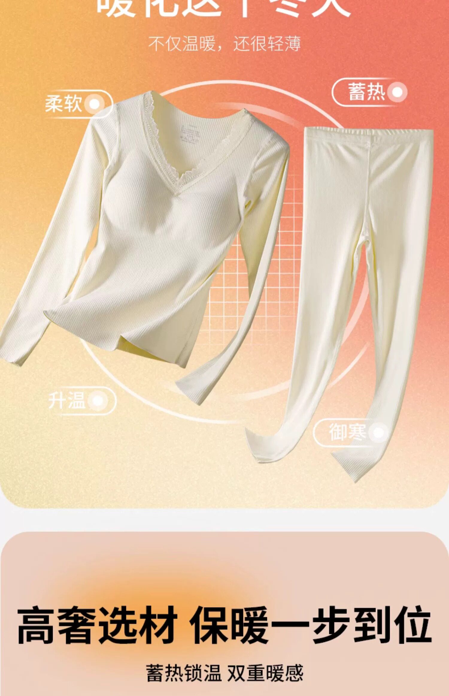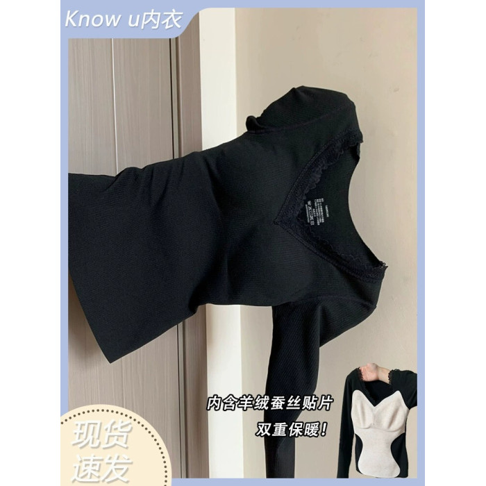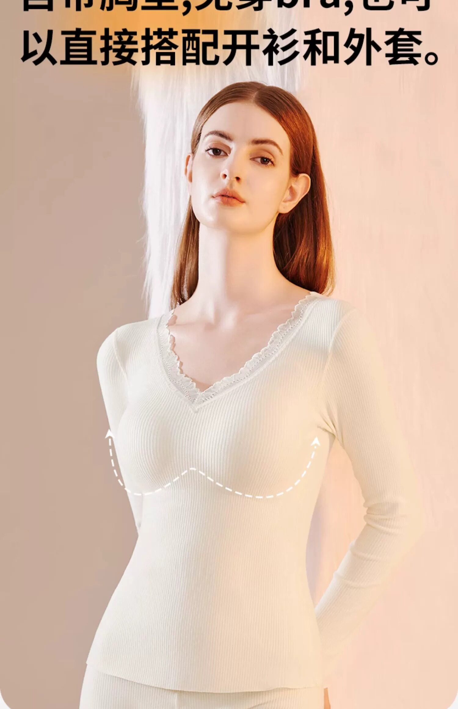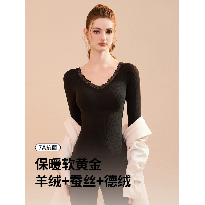 帶胸墊羊絨蠶絲保暖內衣套裝女秋冬髮熱秋衣秋褲蕾絲V領內搭打底