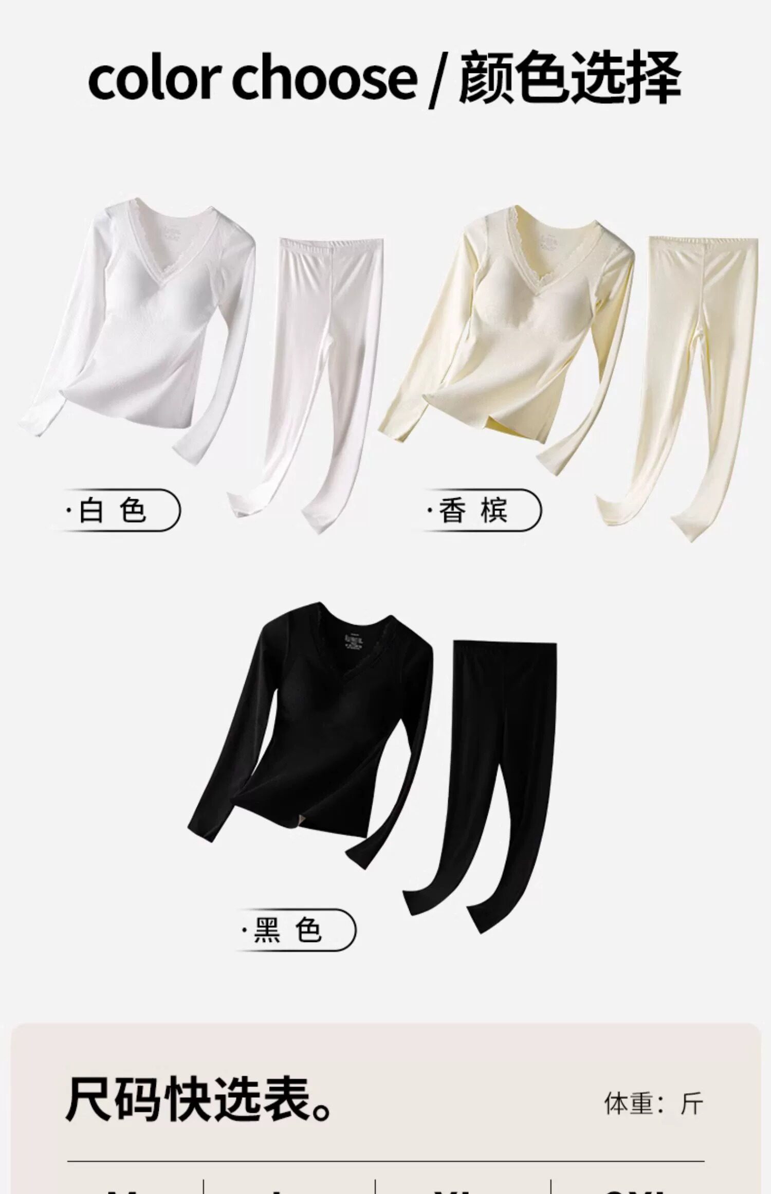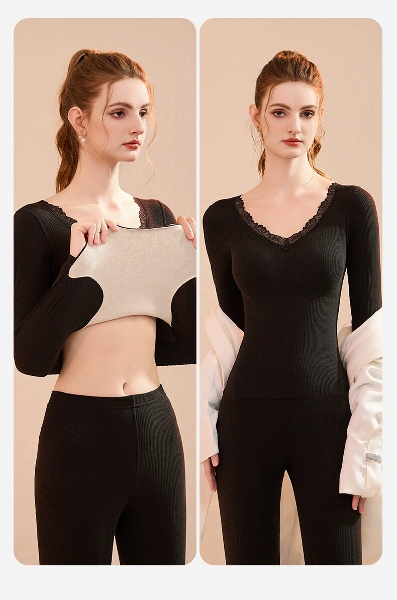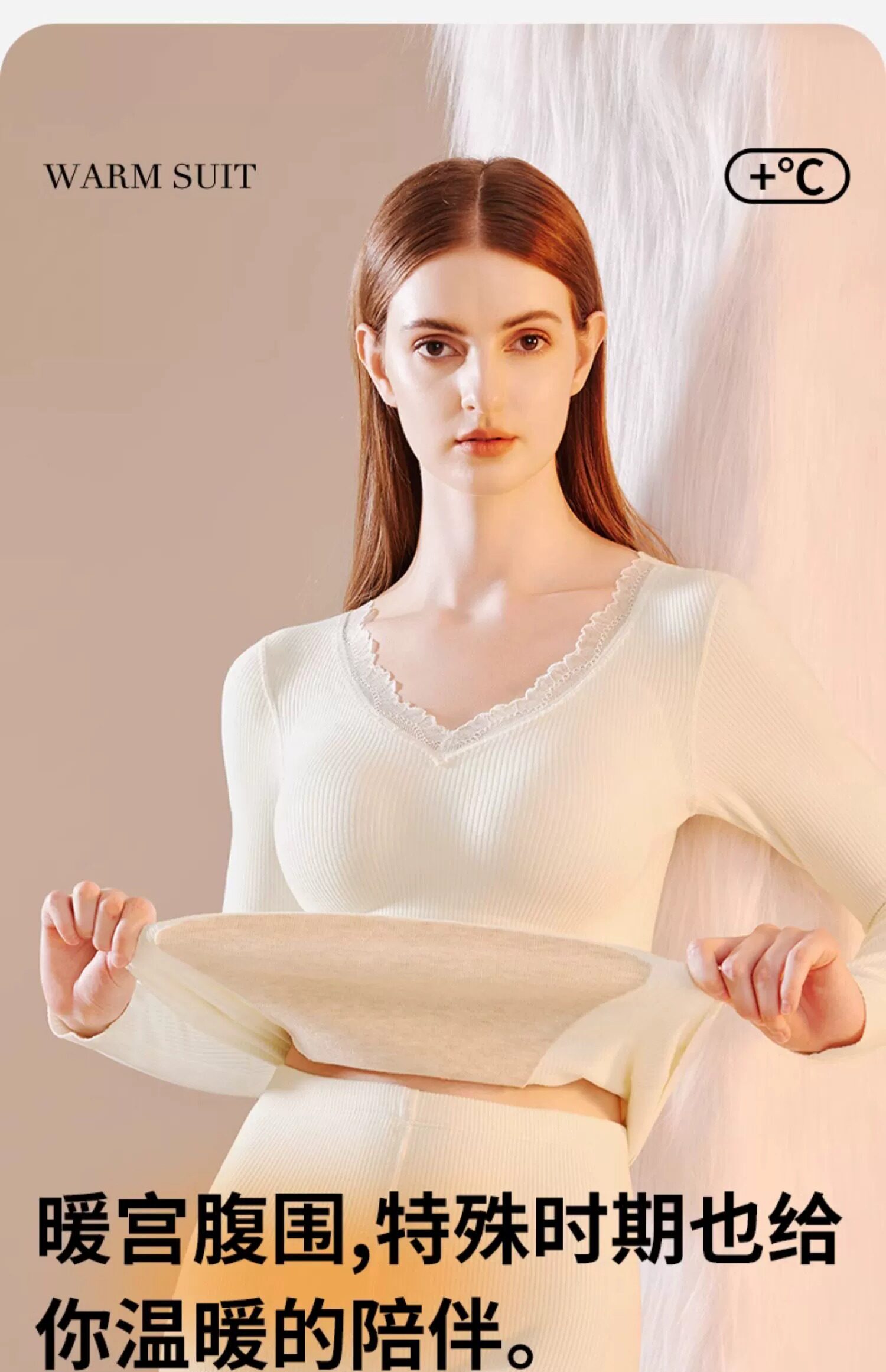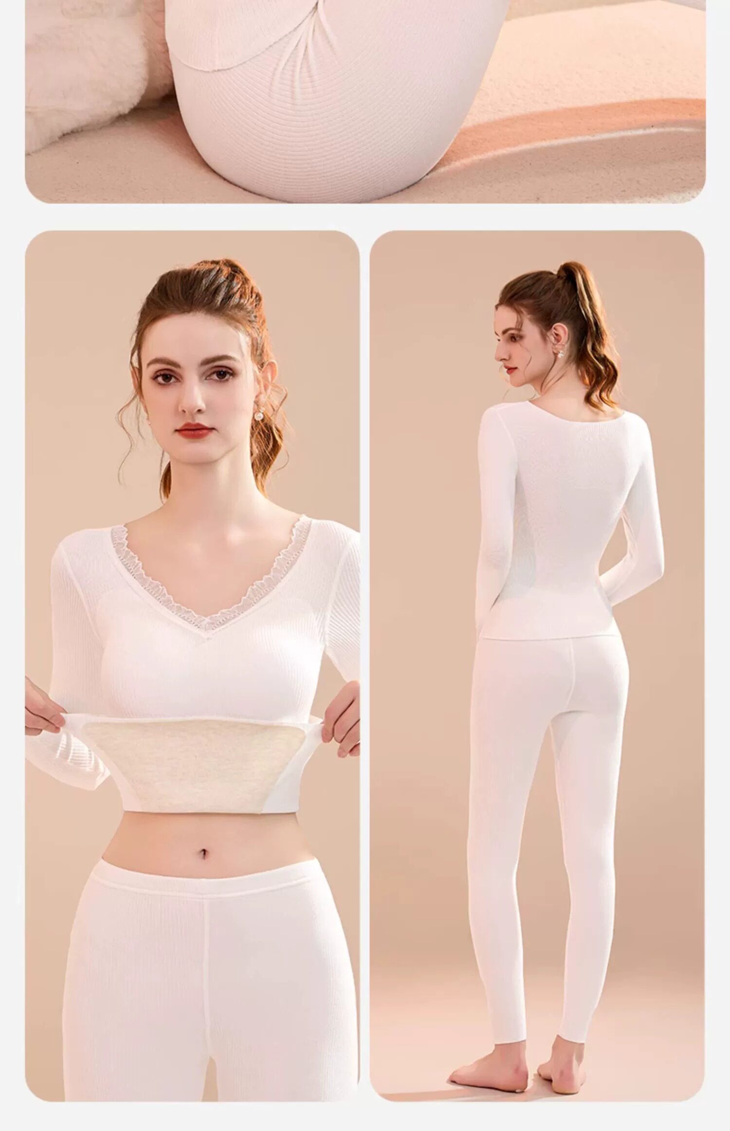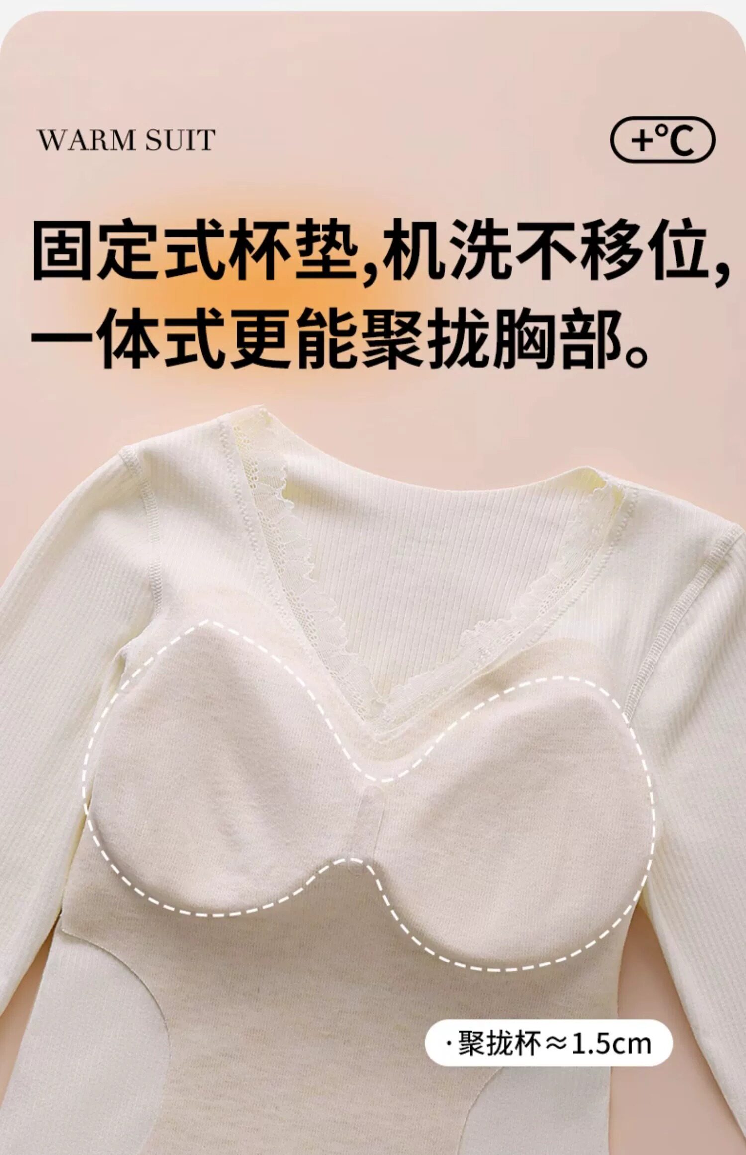 帶胸墊羊絨蠶絲保暖內衣套裝女秋冬髮熱秋衣秋褲蕾絲V領內搭打底