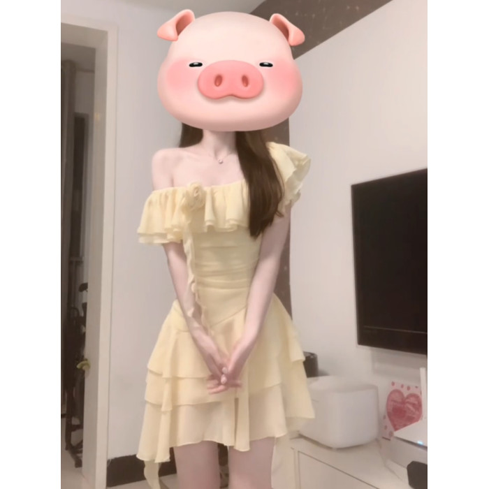純欲風辣妹高級感一字肩連衣裙女夏黃色立體花朵不規則小個子短裙
