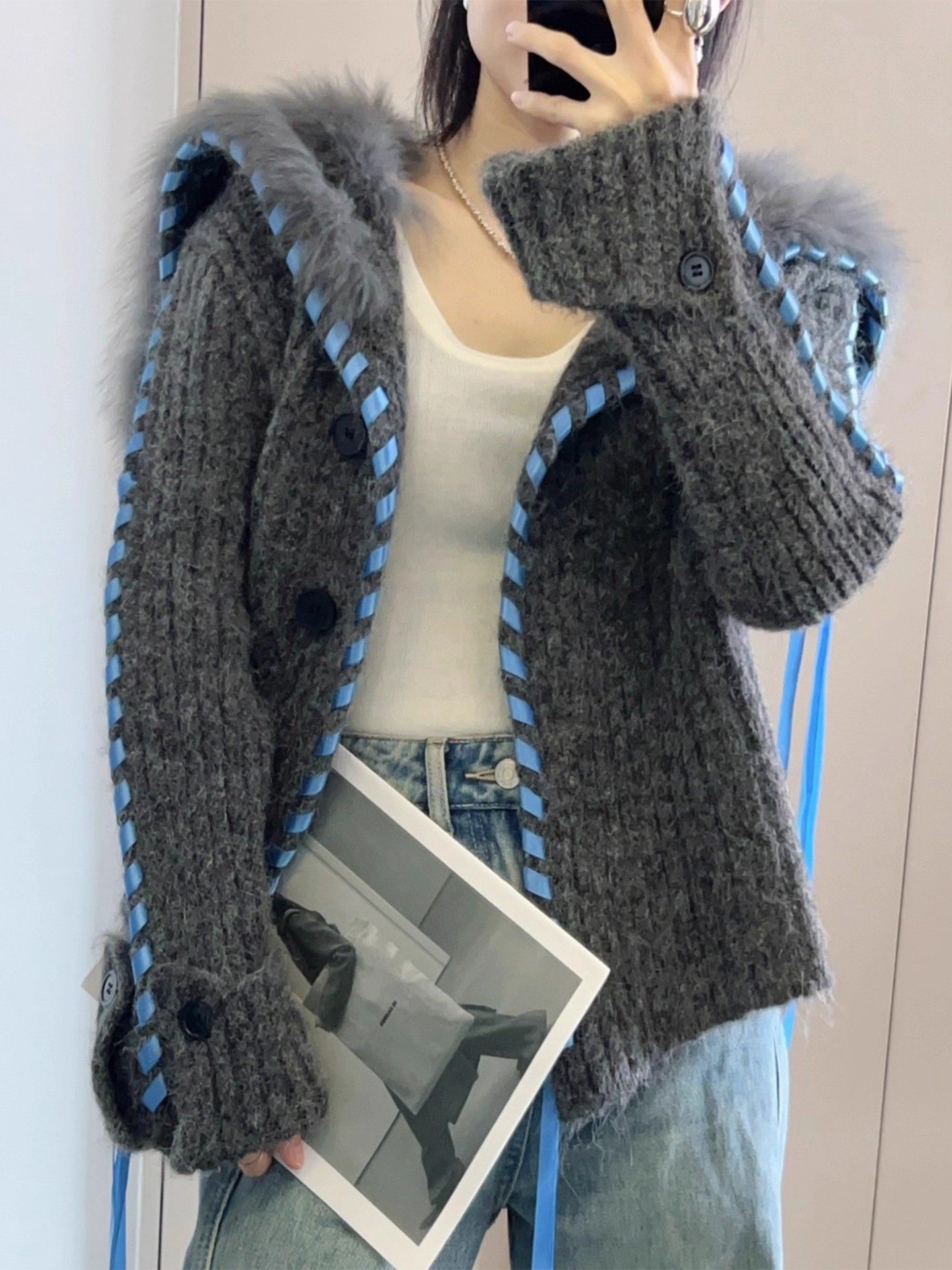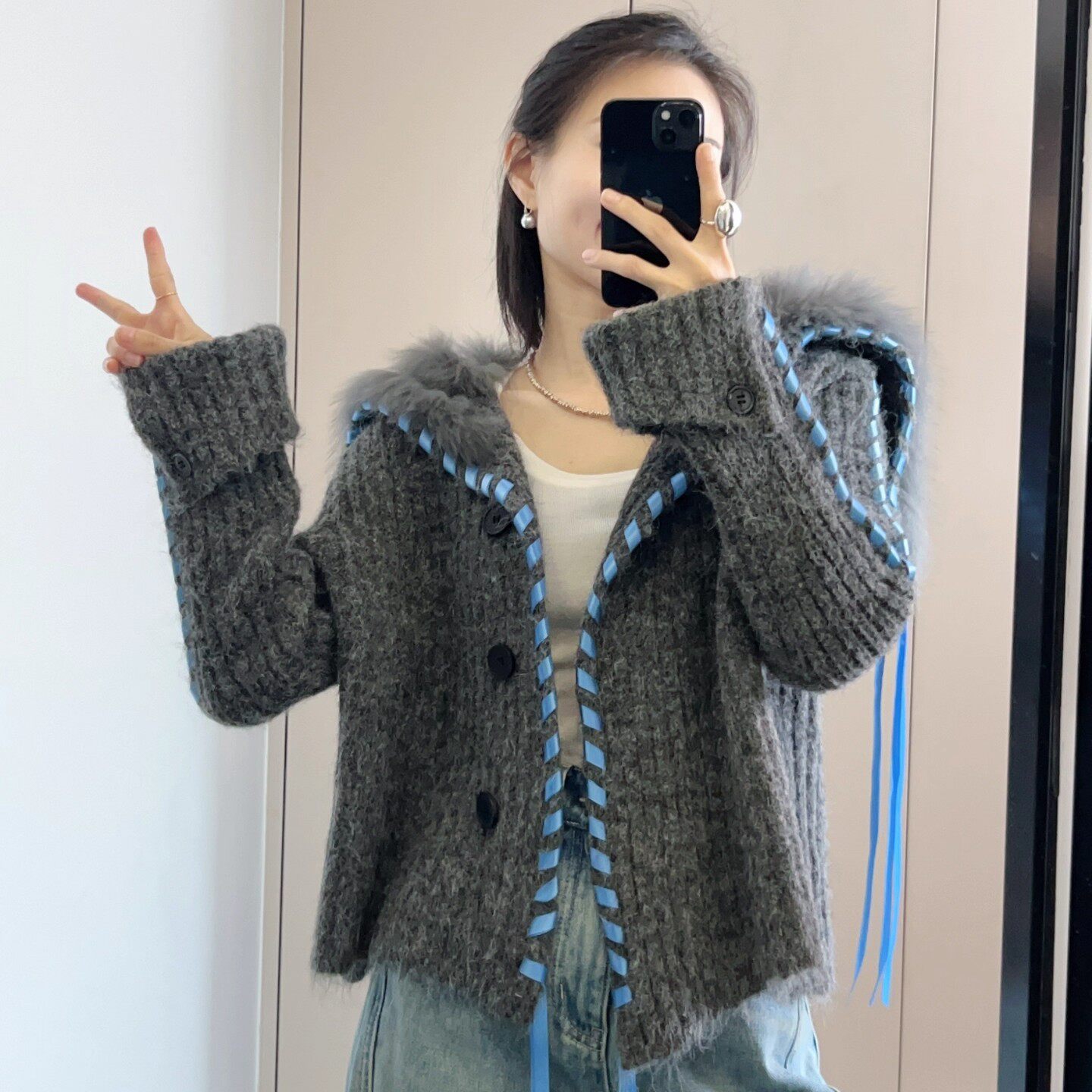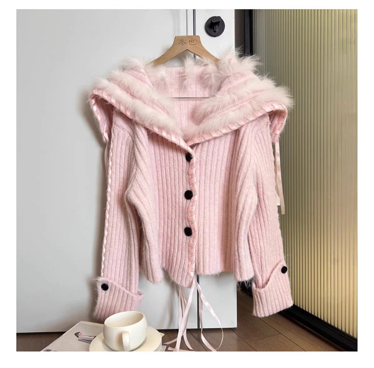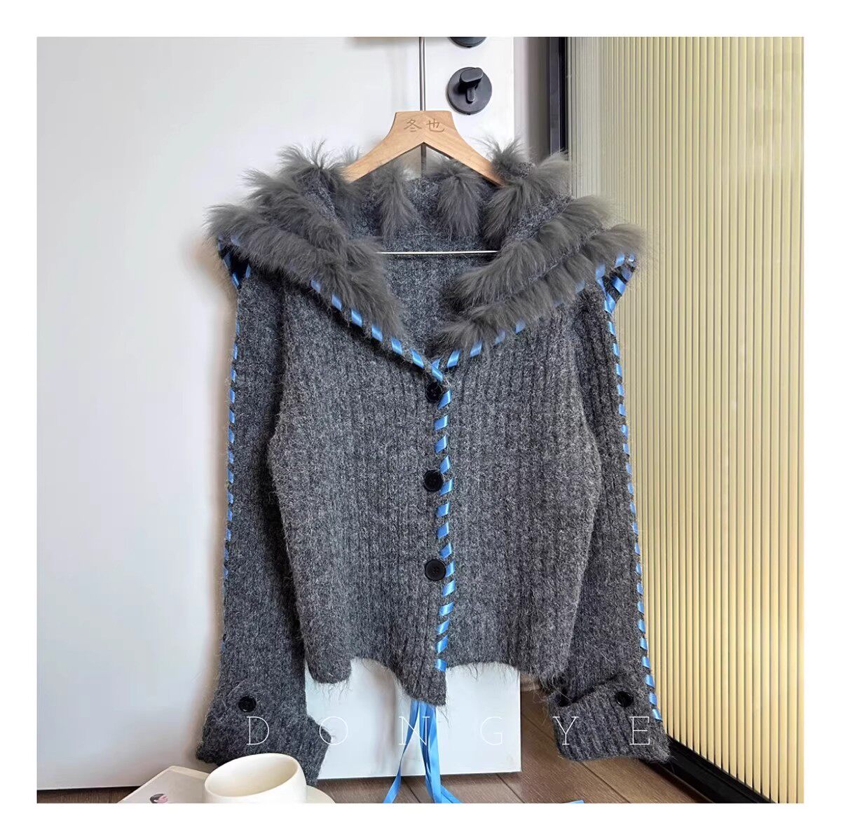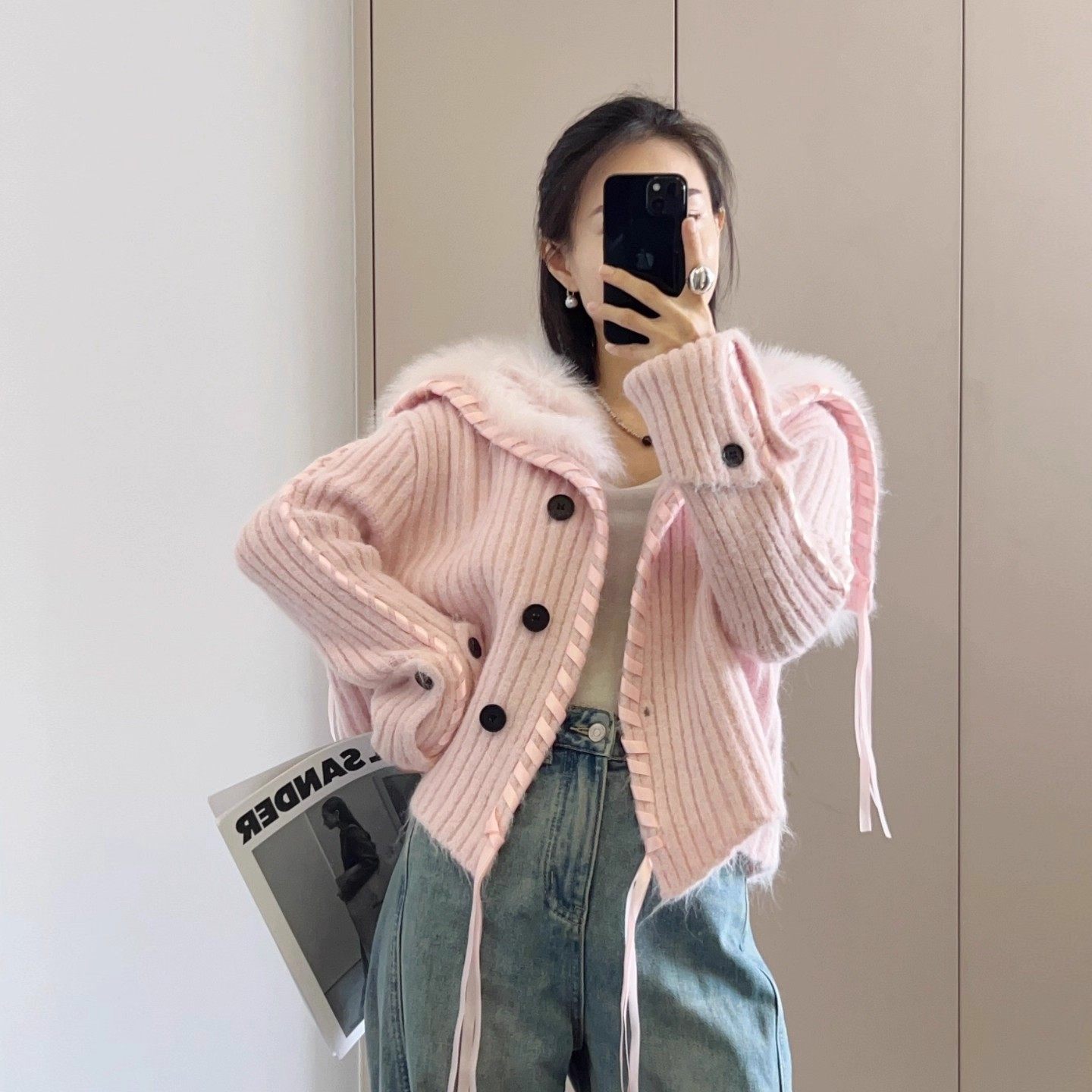 海軍領毛毛編織絲帶針織開衫女2025秋冬新款時尚洋氣短款毛衣外套