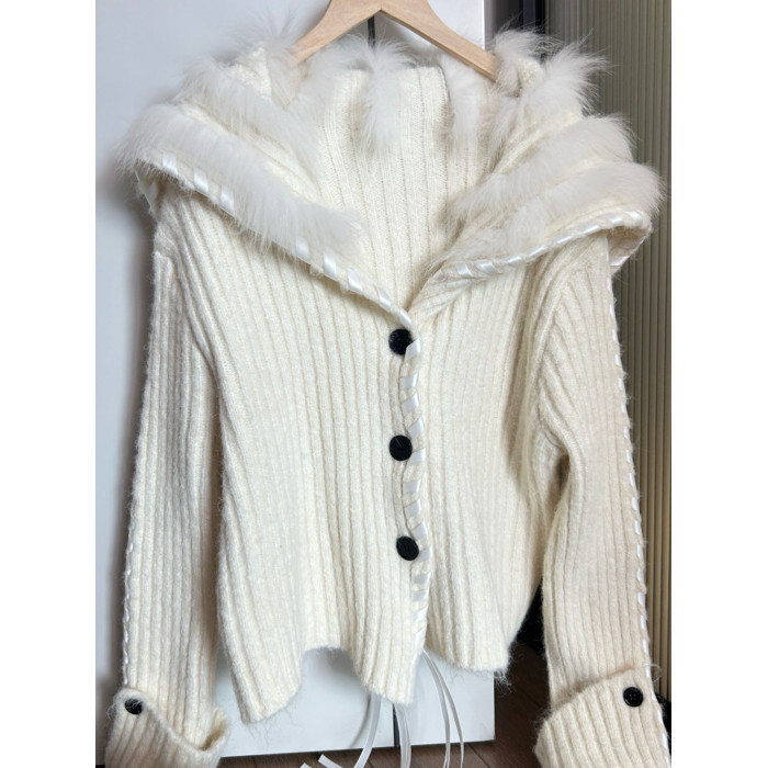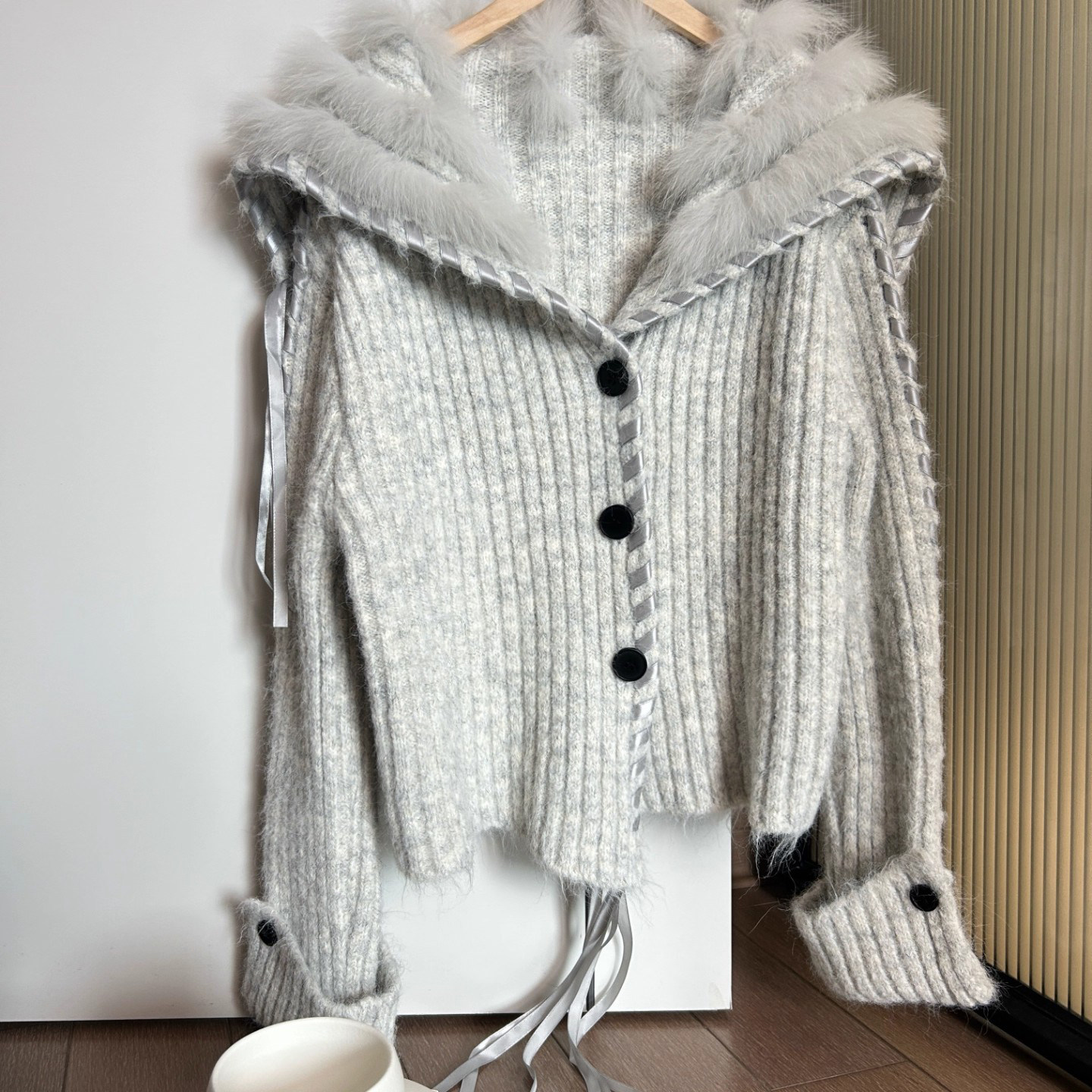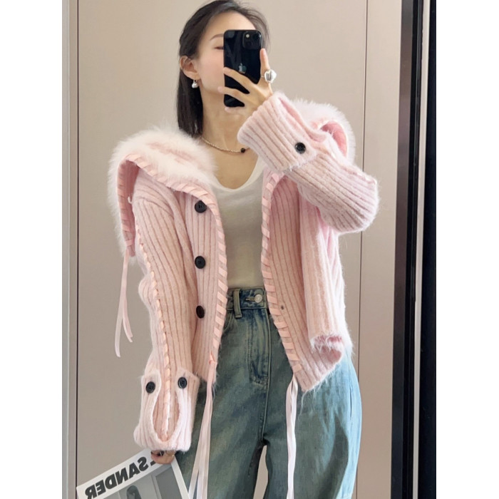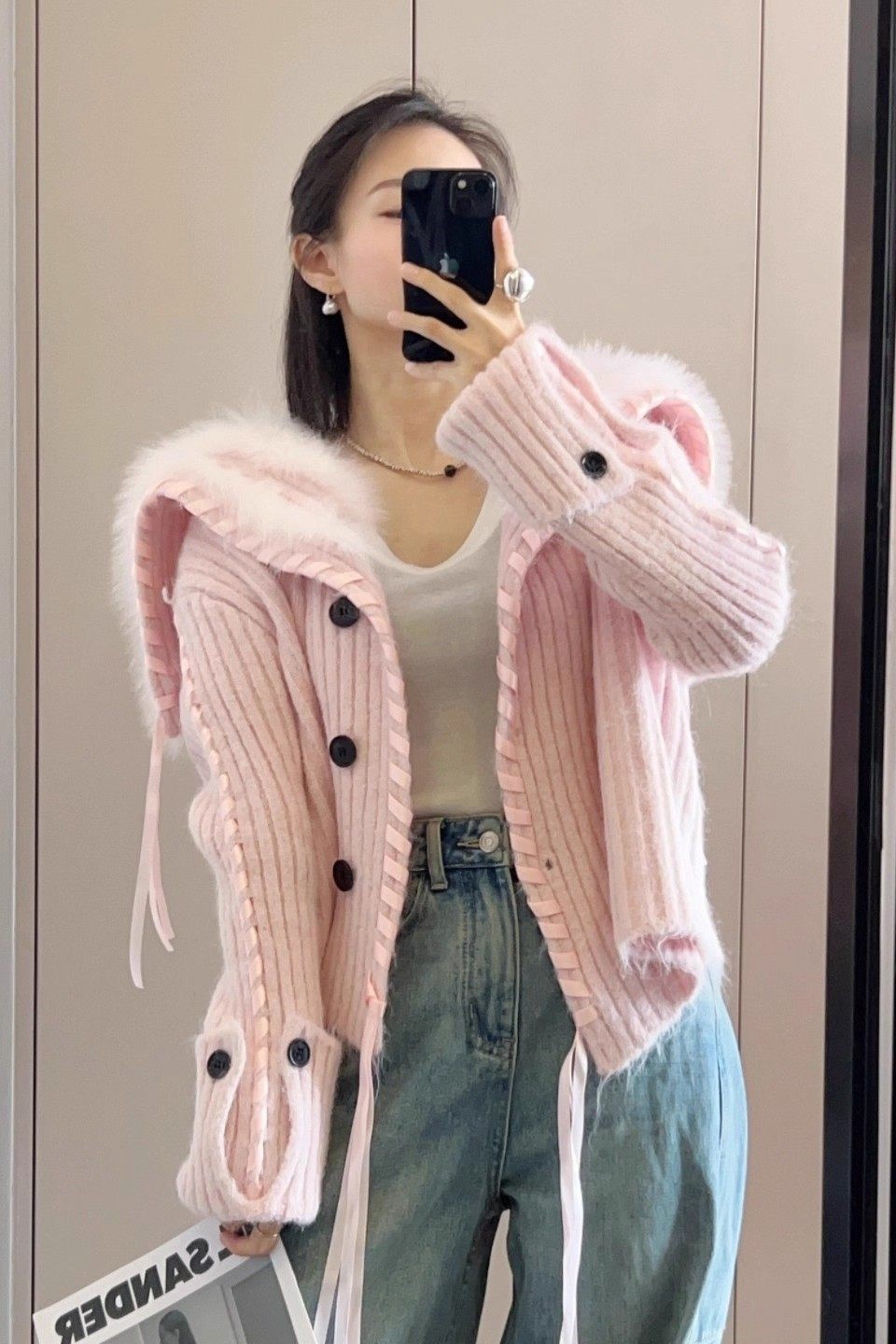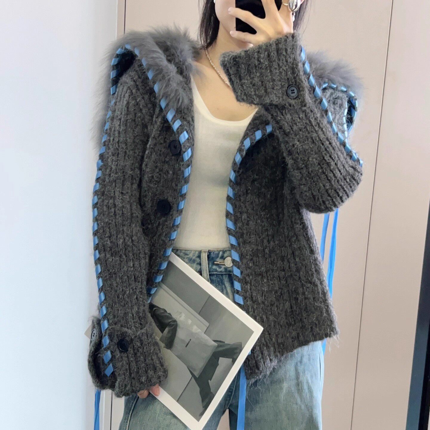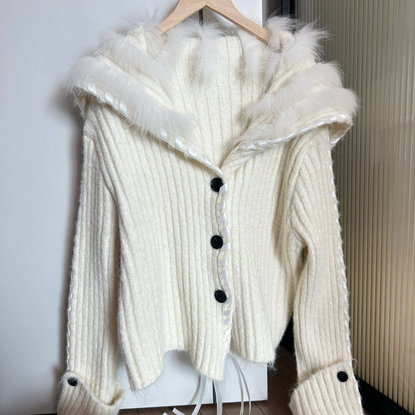 海軍領毛毛編織絲帶針織開衫女2025秋冬新款時尚洋氣短款毛衣外套