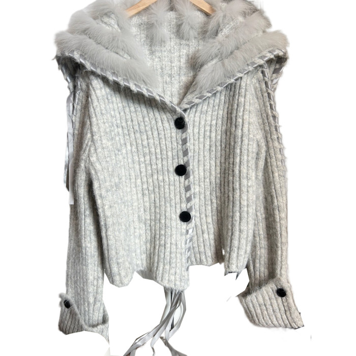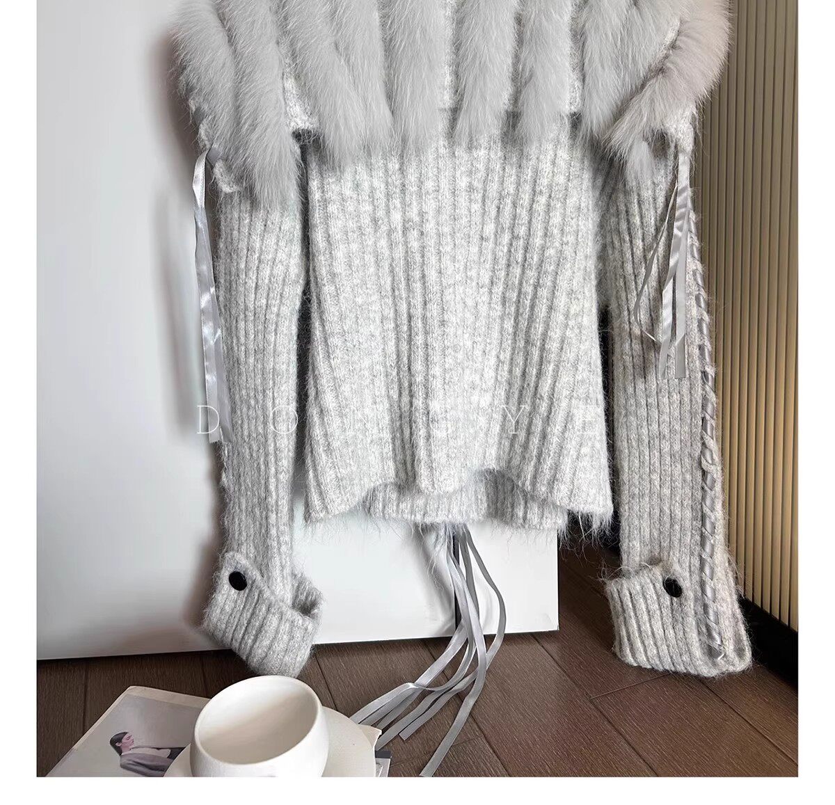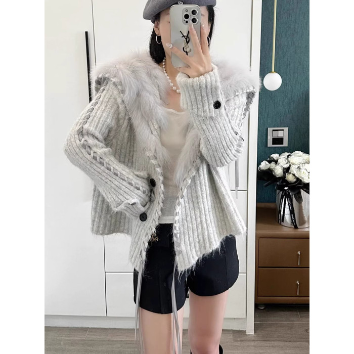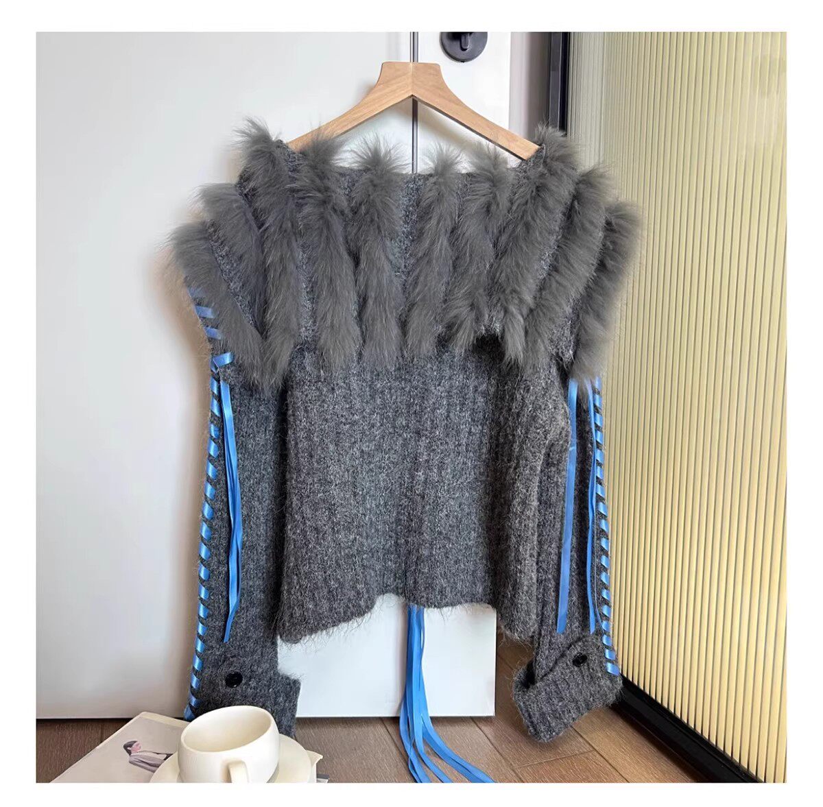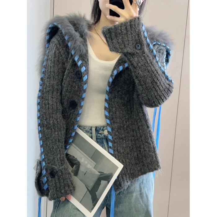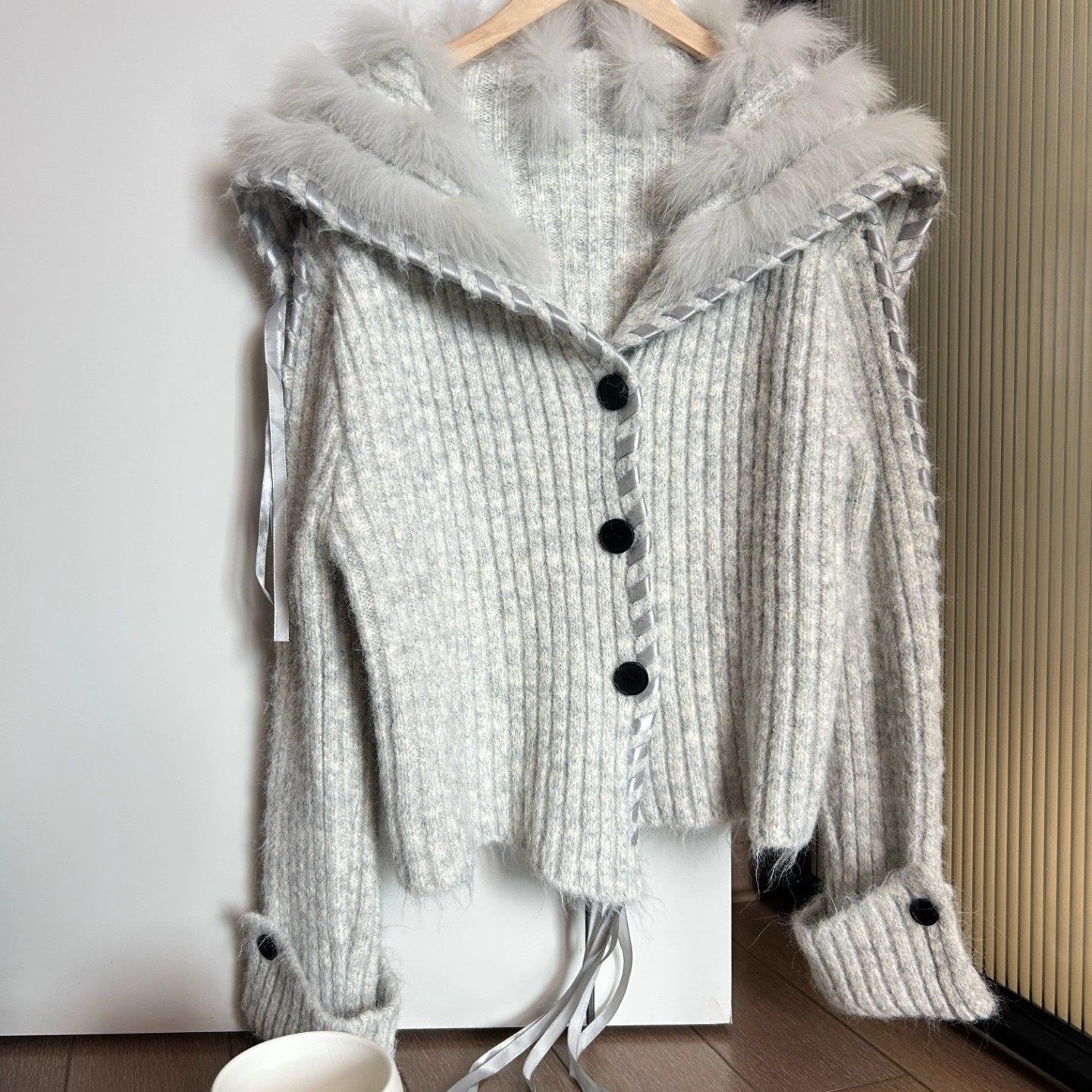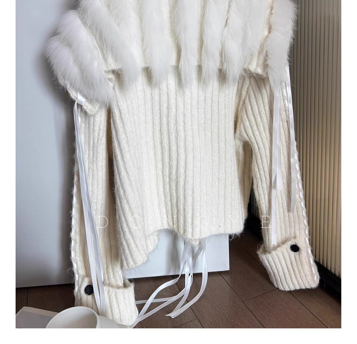 海軍領毛毛編織絲帶針織開衫女2025秋冬新款時尚洋氣短款毛衣外套