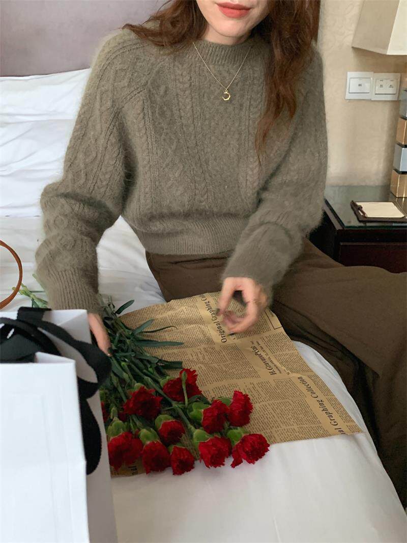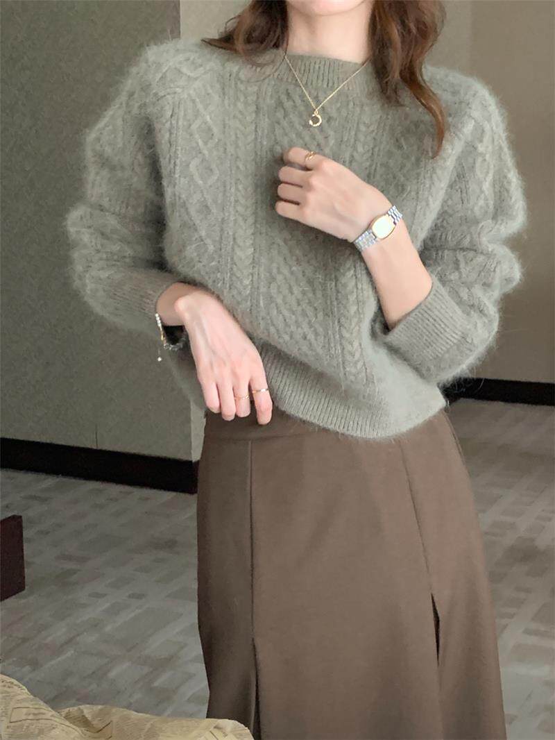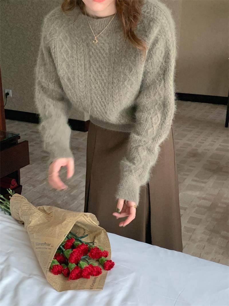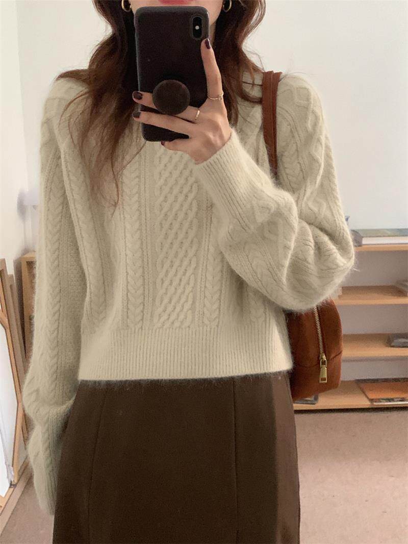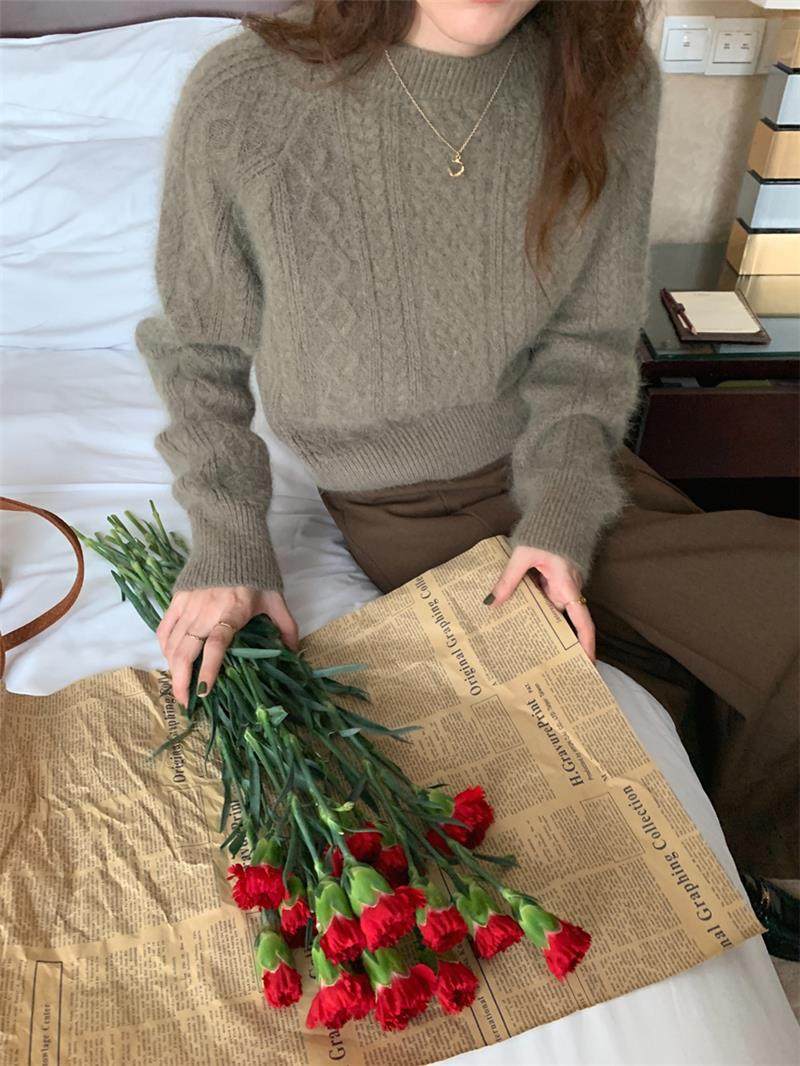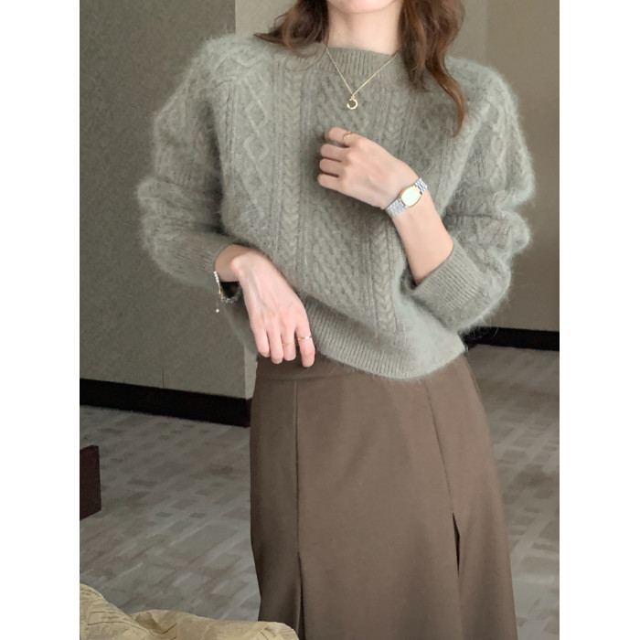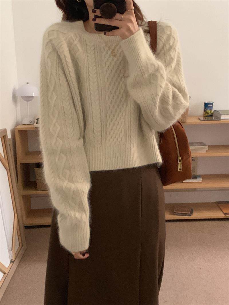 馬海毛麻花毛衣女秋冬新款復古慵懶風加厚仿浣熊絨短款上衣針織衫
