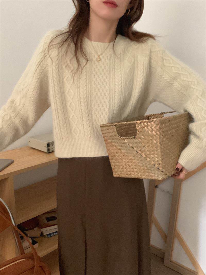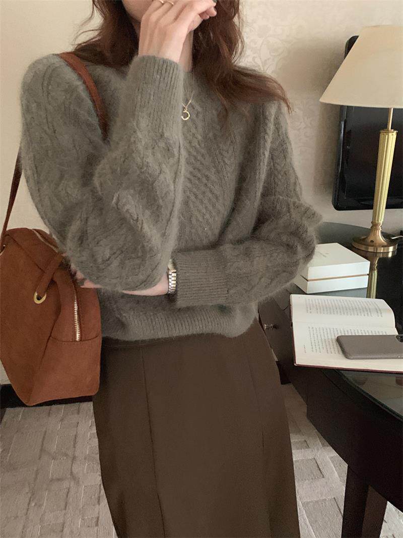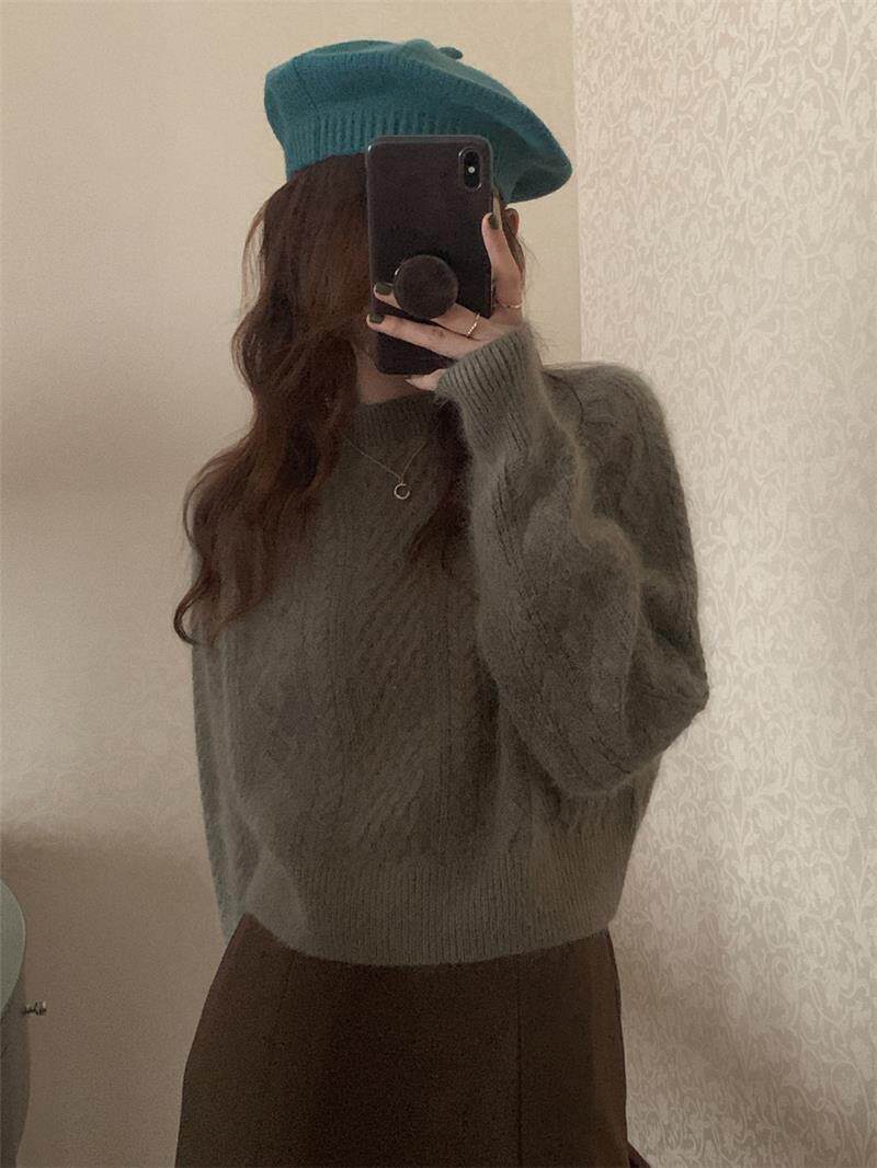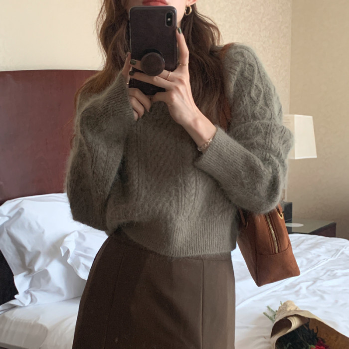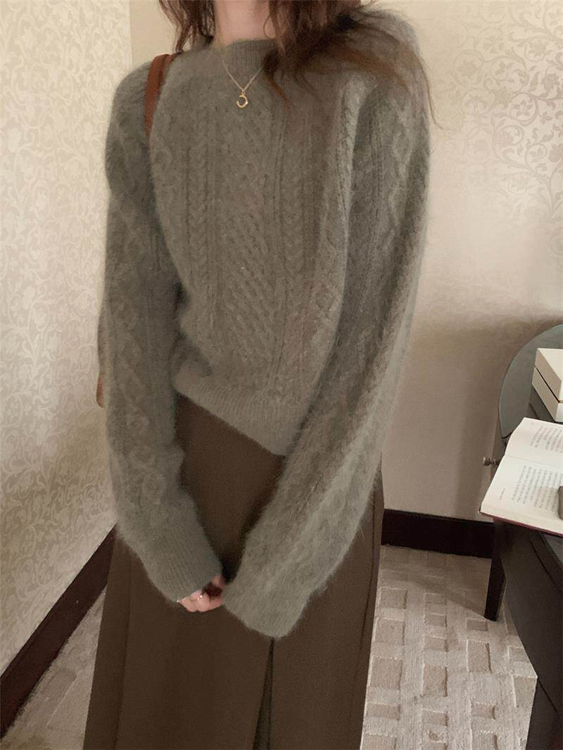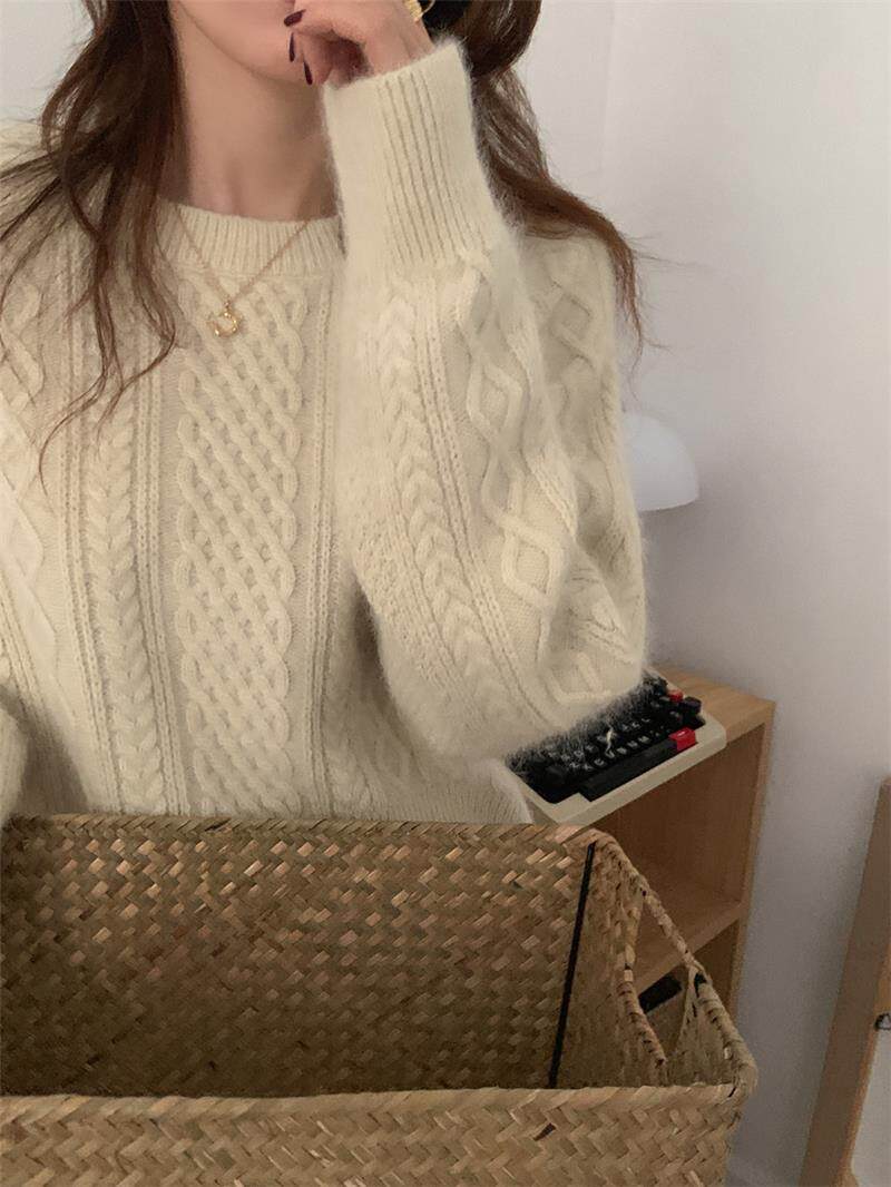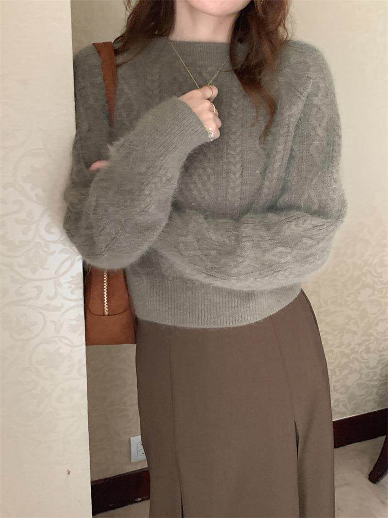 馬海毛麻花毛衣女秋冬新款復古慵懶風加厚仿浣熊絨短款上衣針織衫