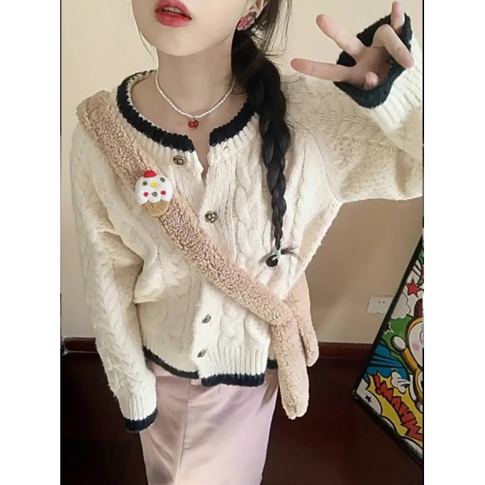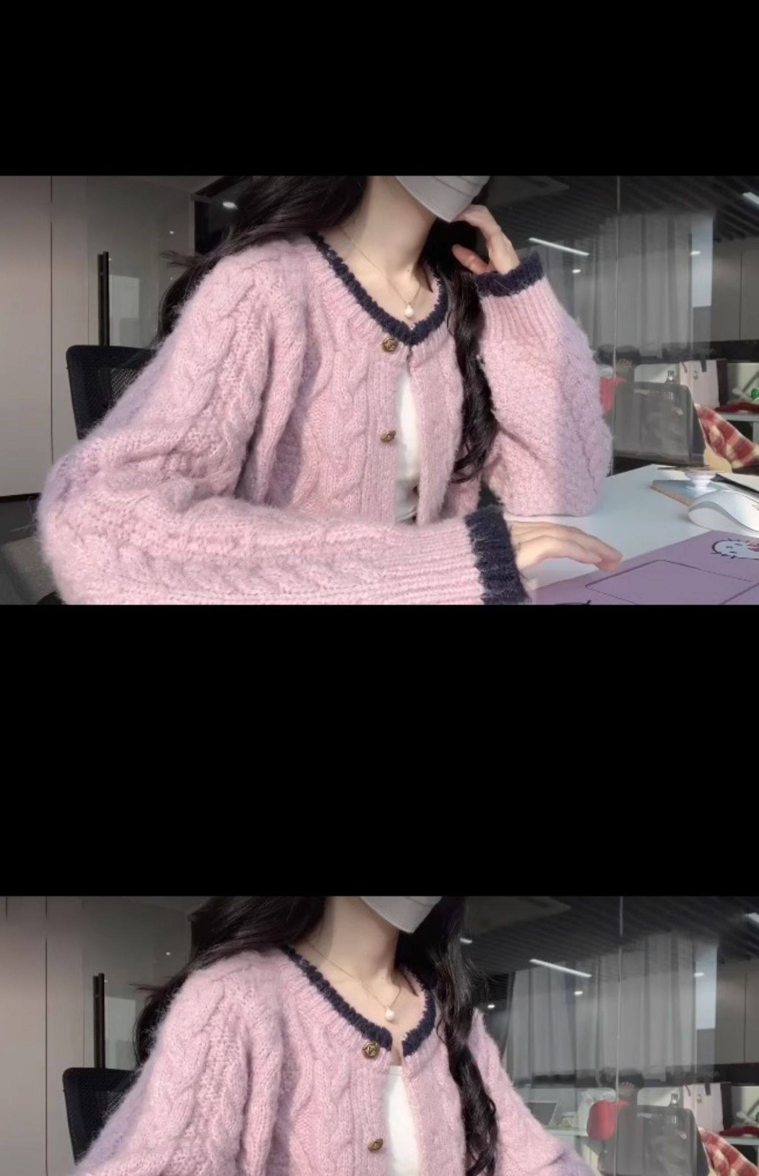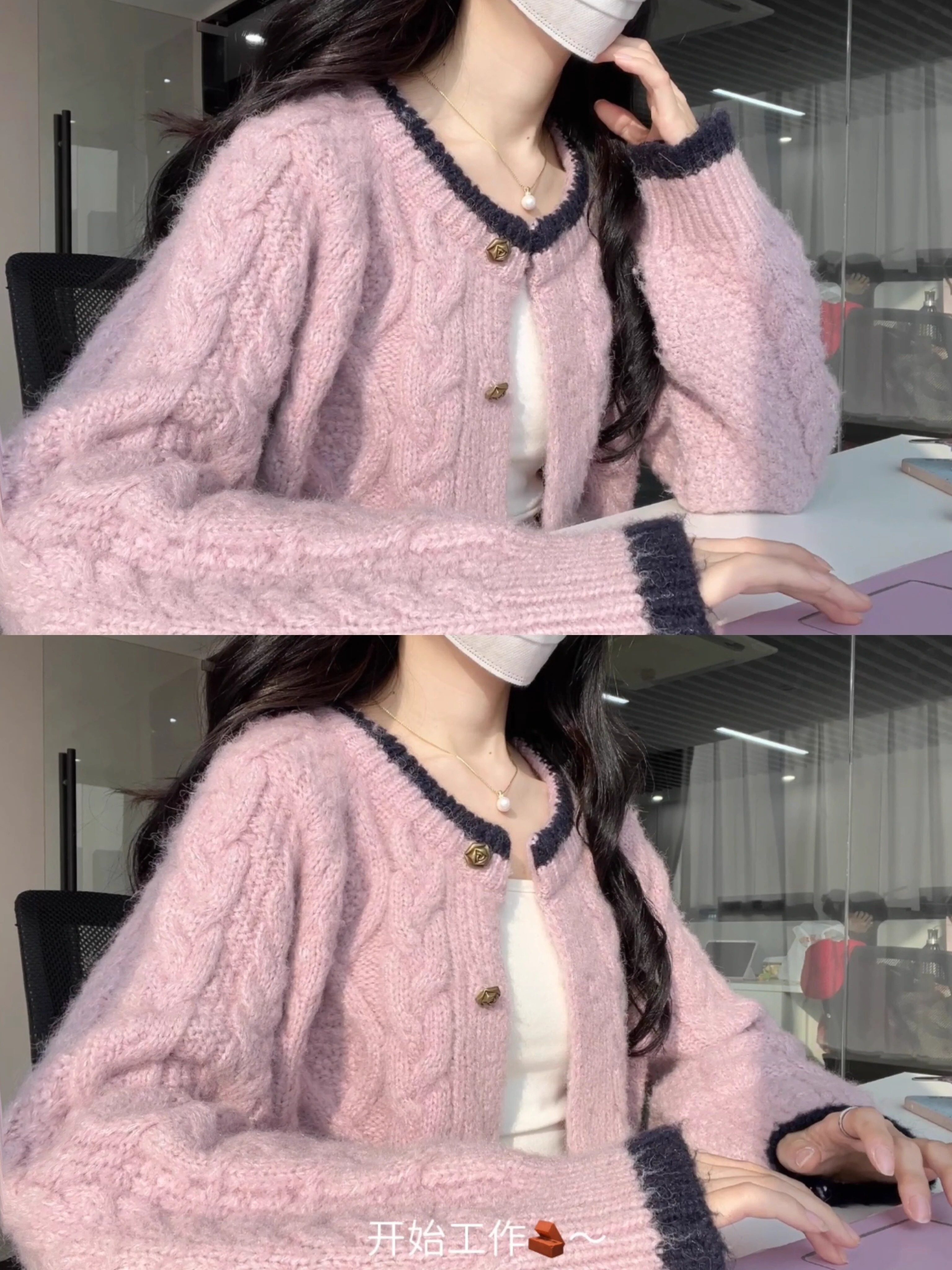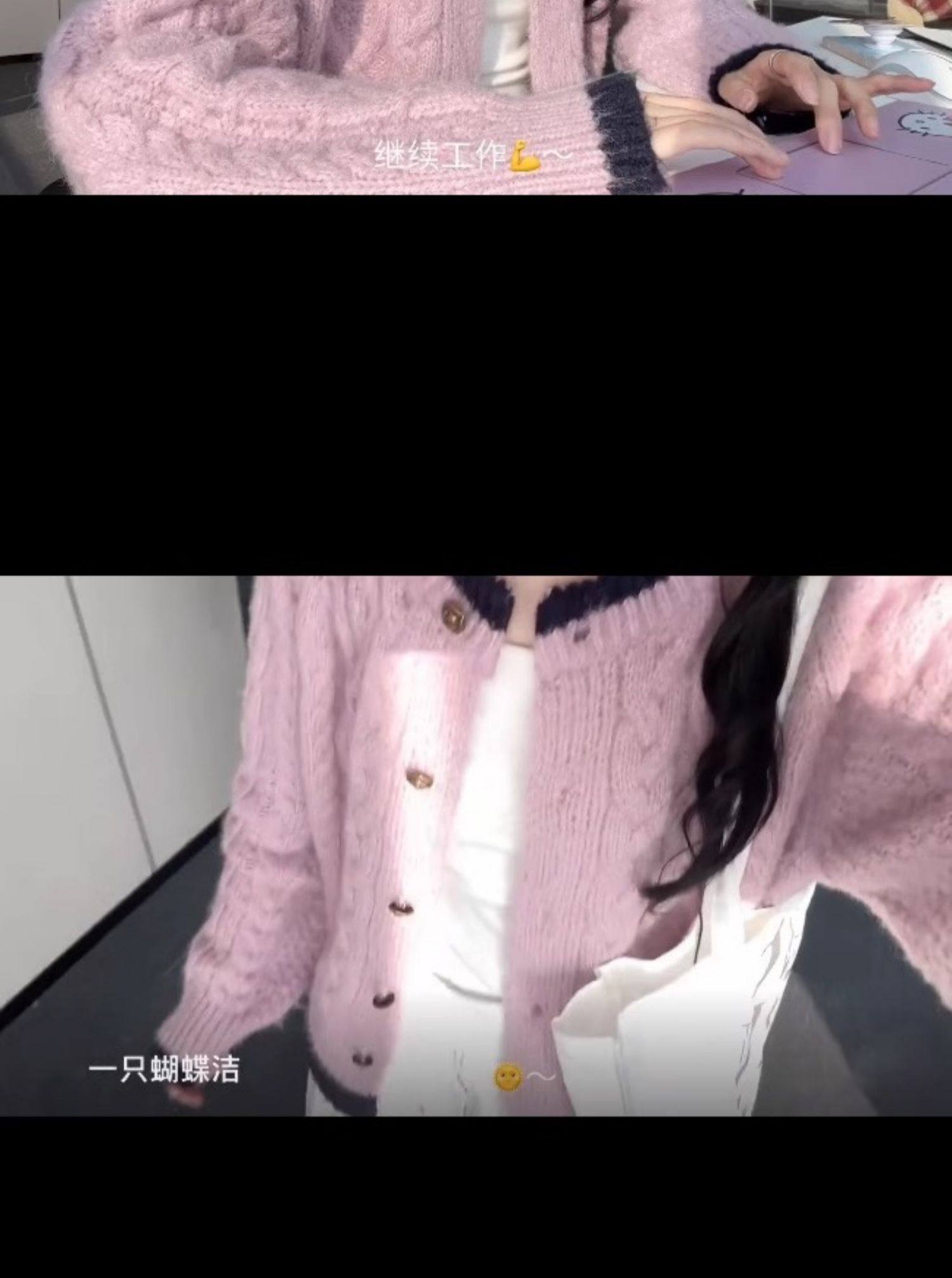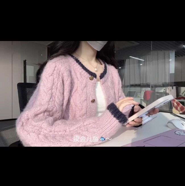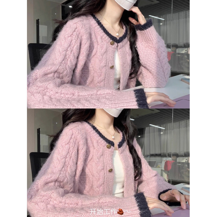 韓系小香風粉色毛衣外套女秋冬軟糯溫柔慵懶風麻花針織開衫短上衣
