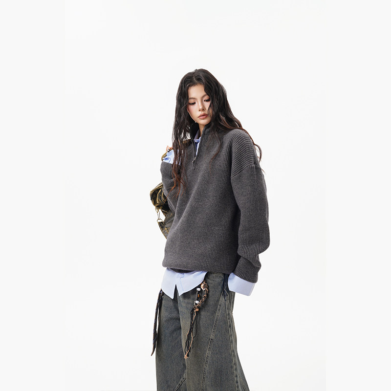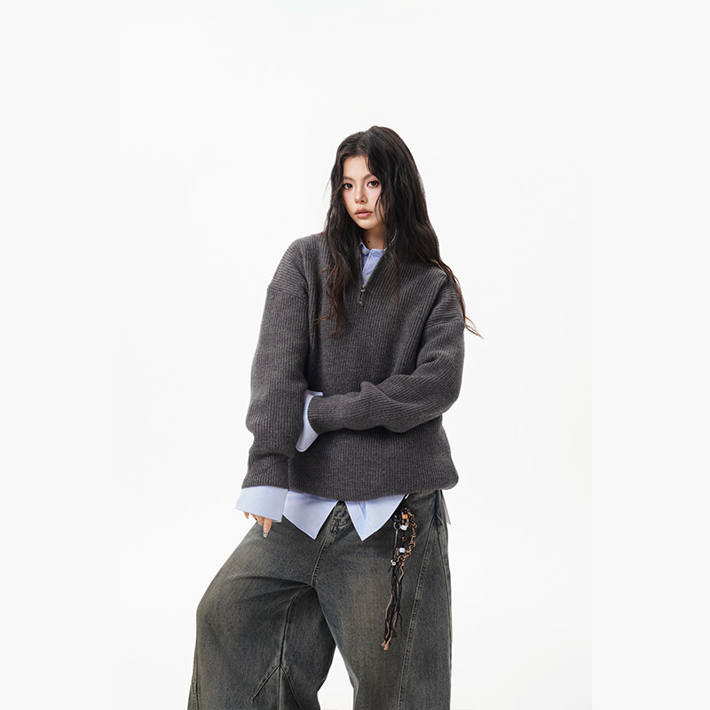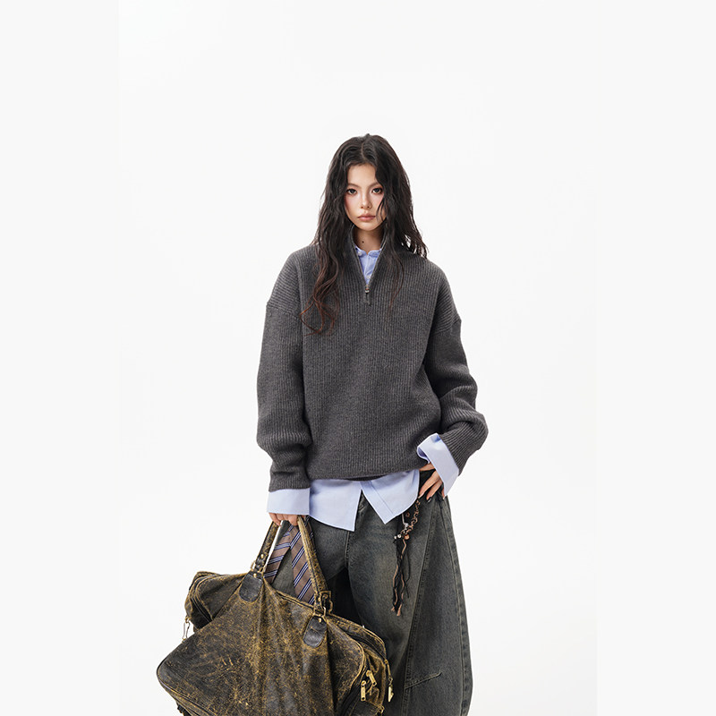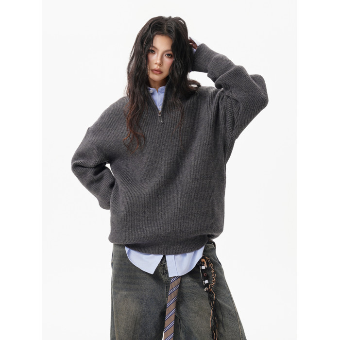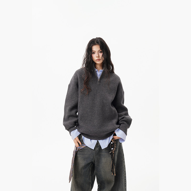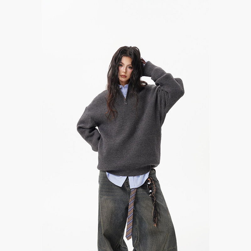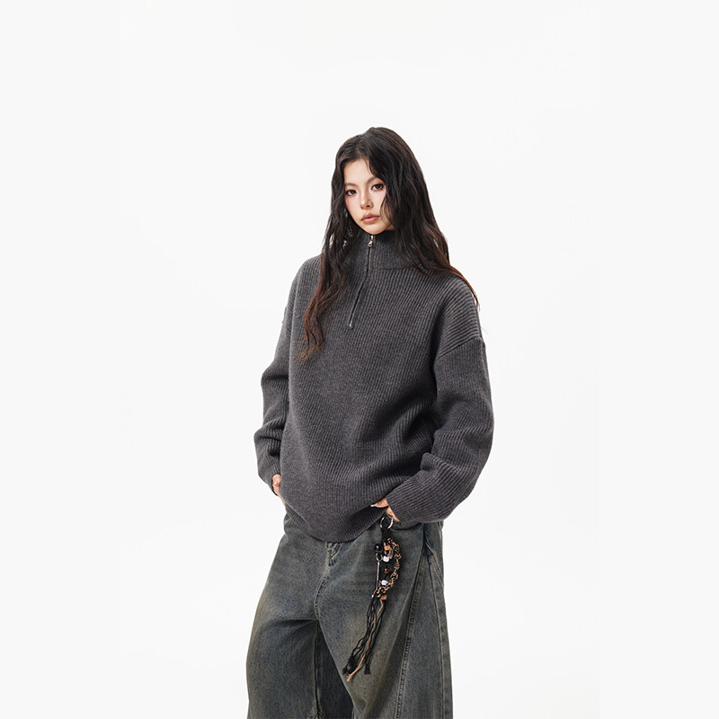 灰色重磅半拉鍊高領毛衣女男秋季寬松慵懶風針織衫高級感休閒外套