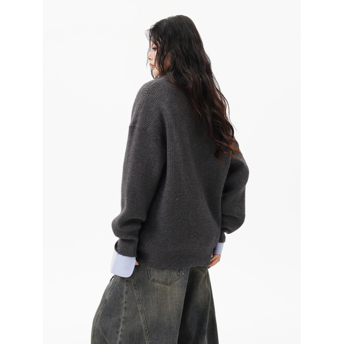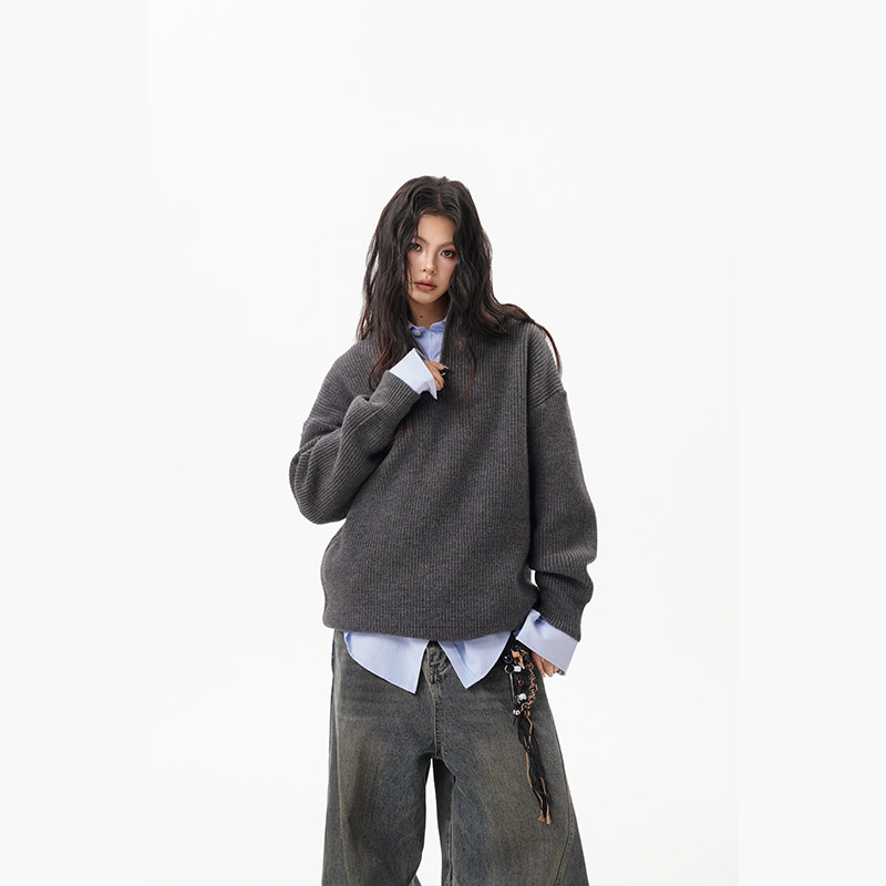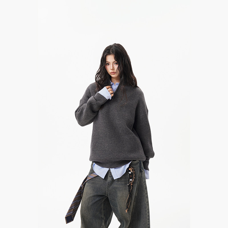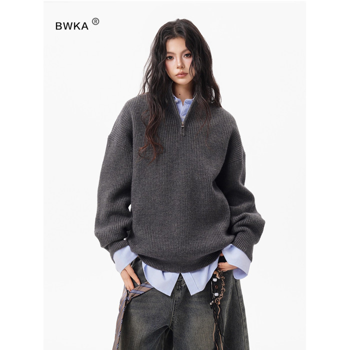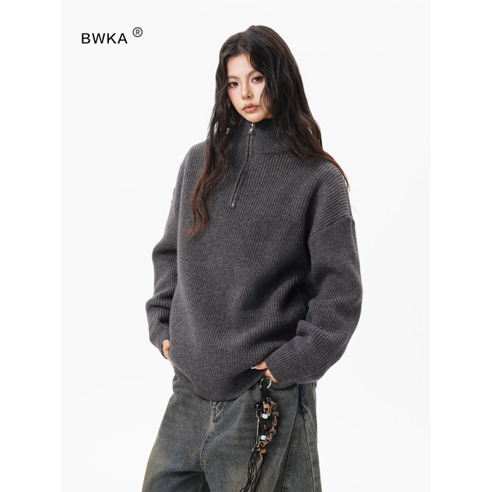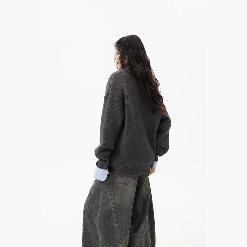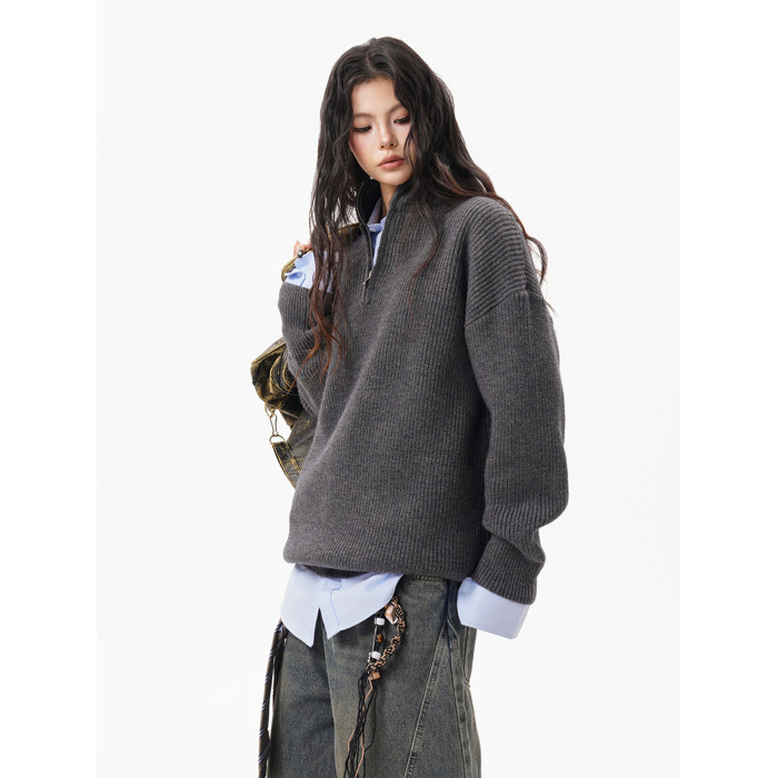 灰色重磅半拉鍊高領毛衣女男秋季寬松慵懶風針織衫高級感休閒外套