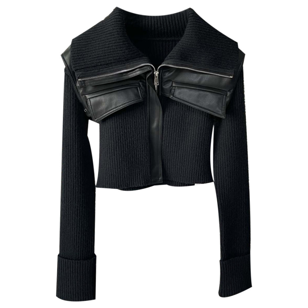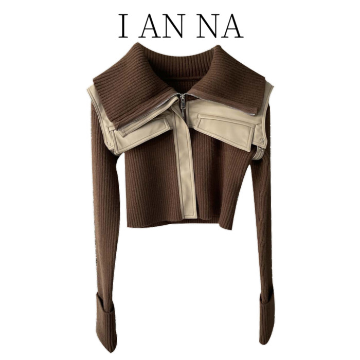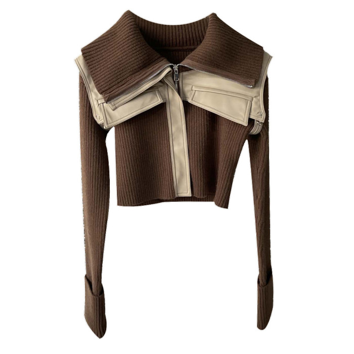 咖啡色假兩件拼接短款拉鍊針織開衫上衣冬季女設計感小衆毛衣外套