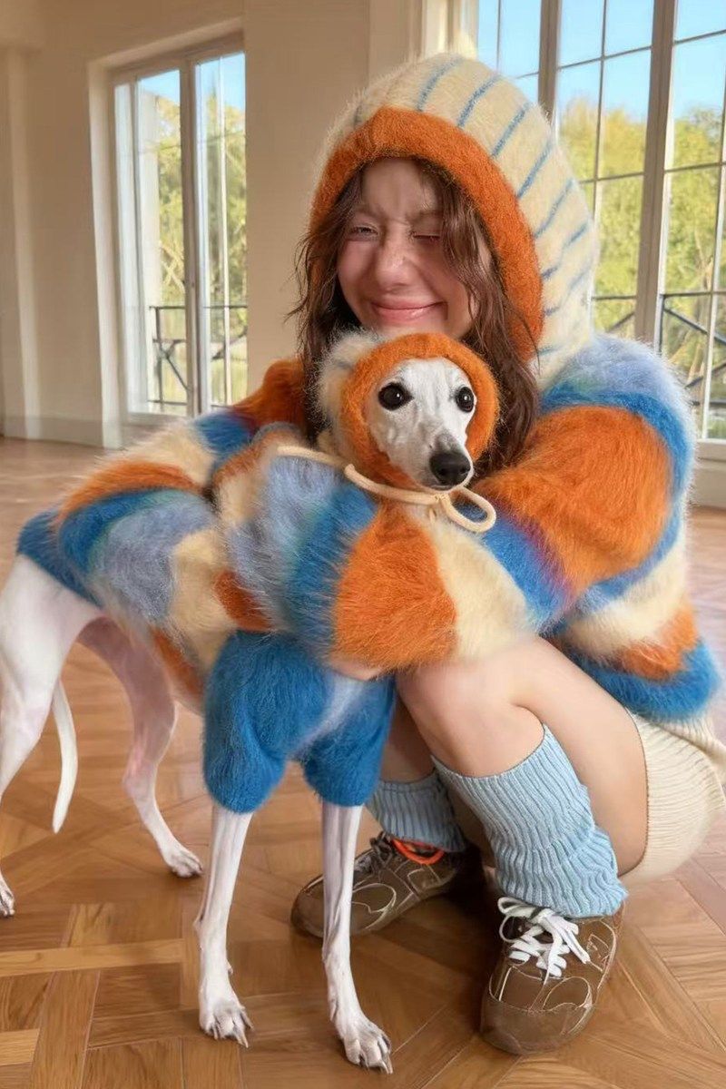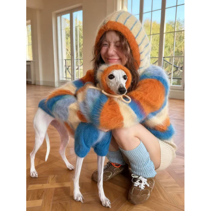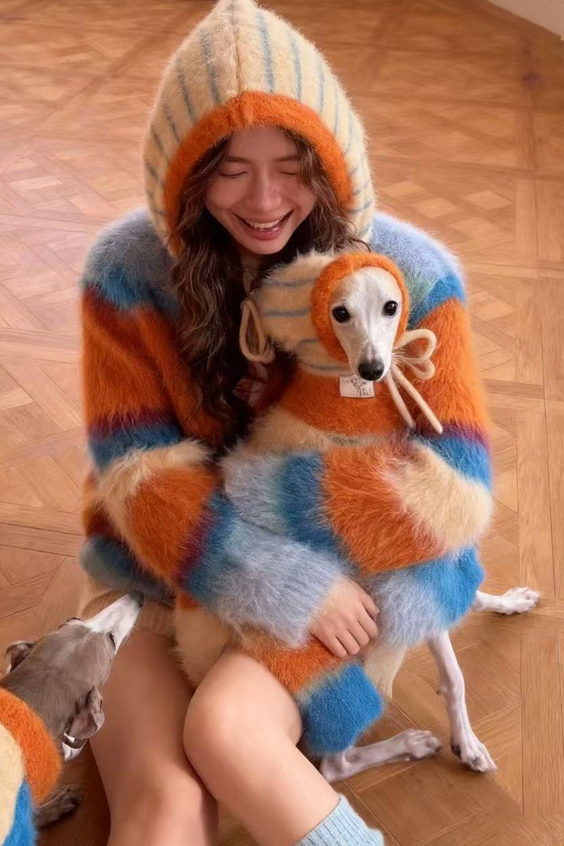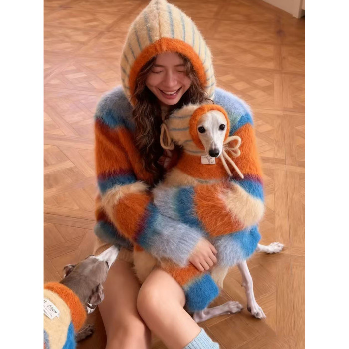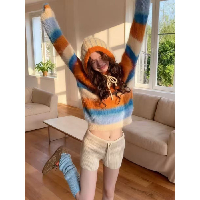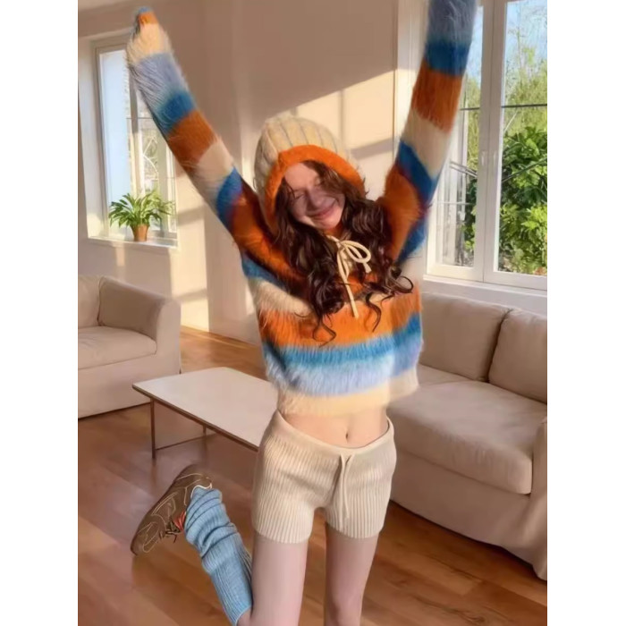 多巴胺彩色條紋水貂絨連帽毛衣女秋冬慵懶高級感馬海毛針織衫上衣