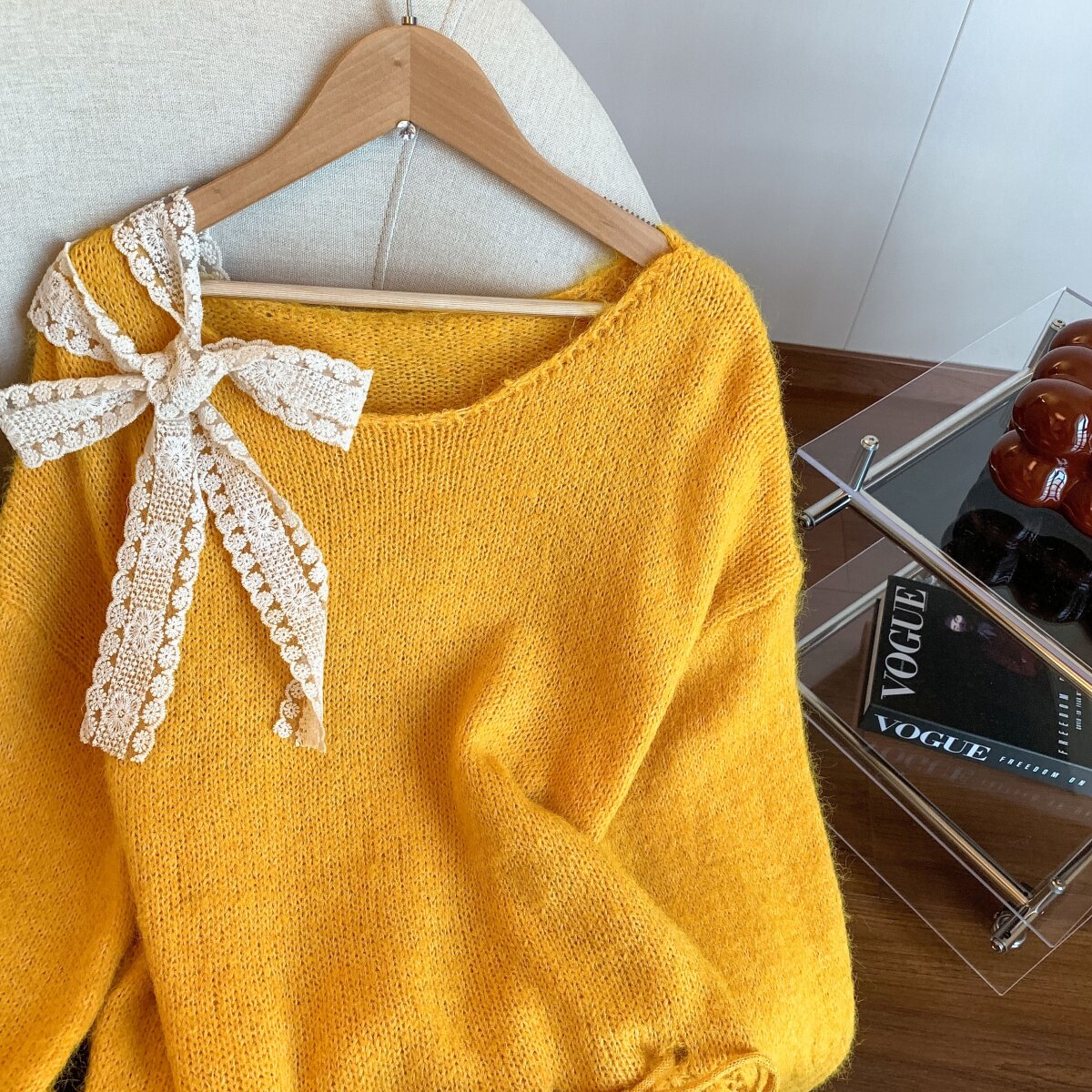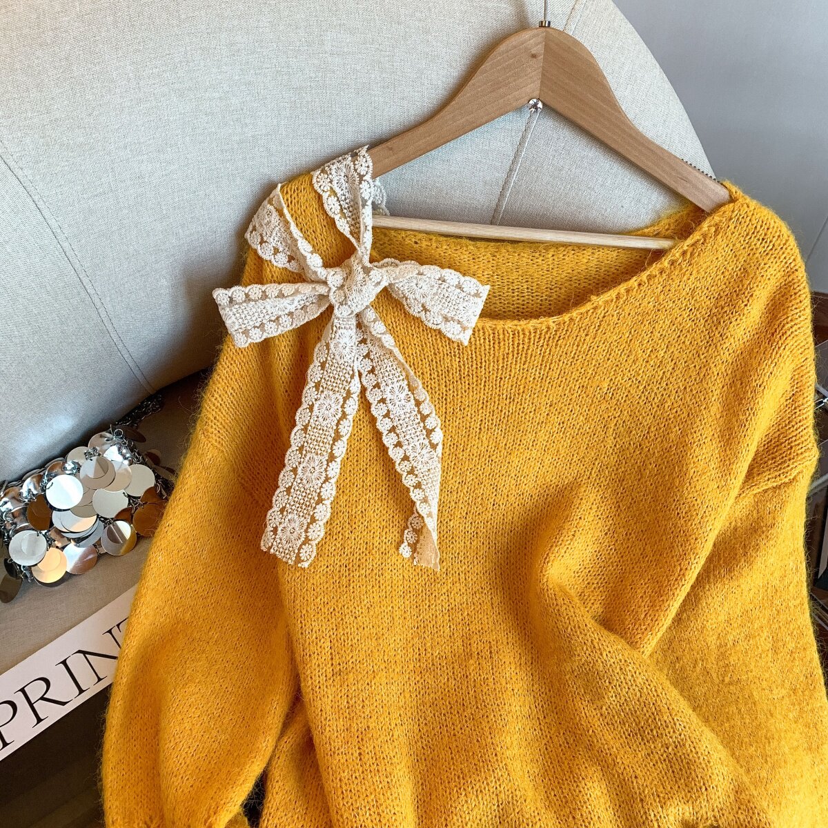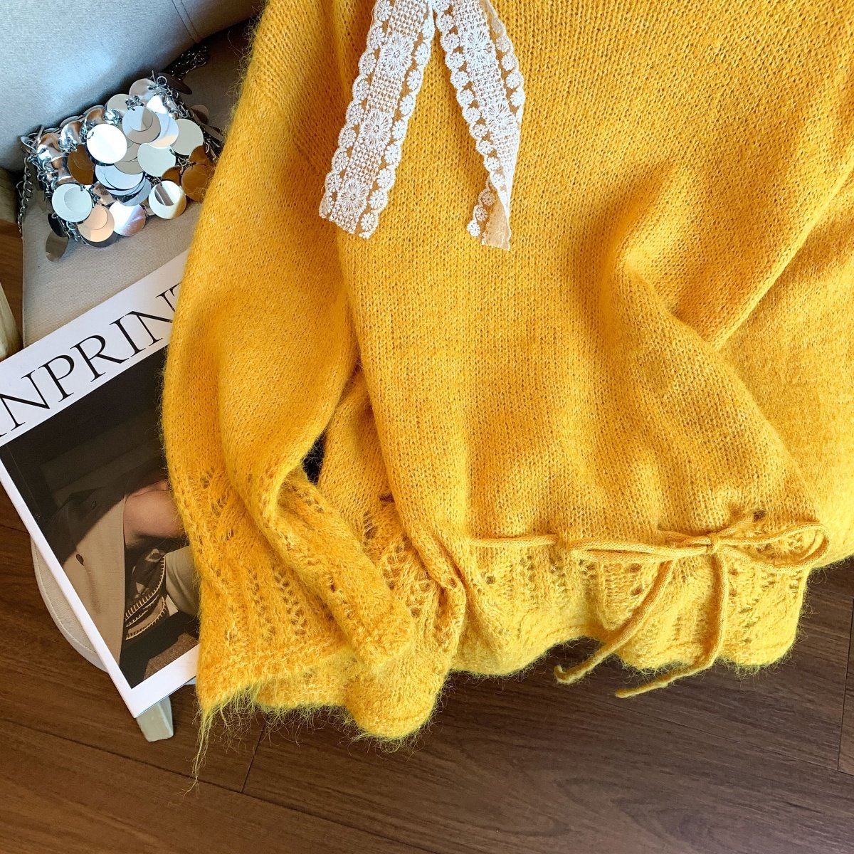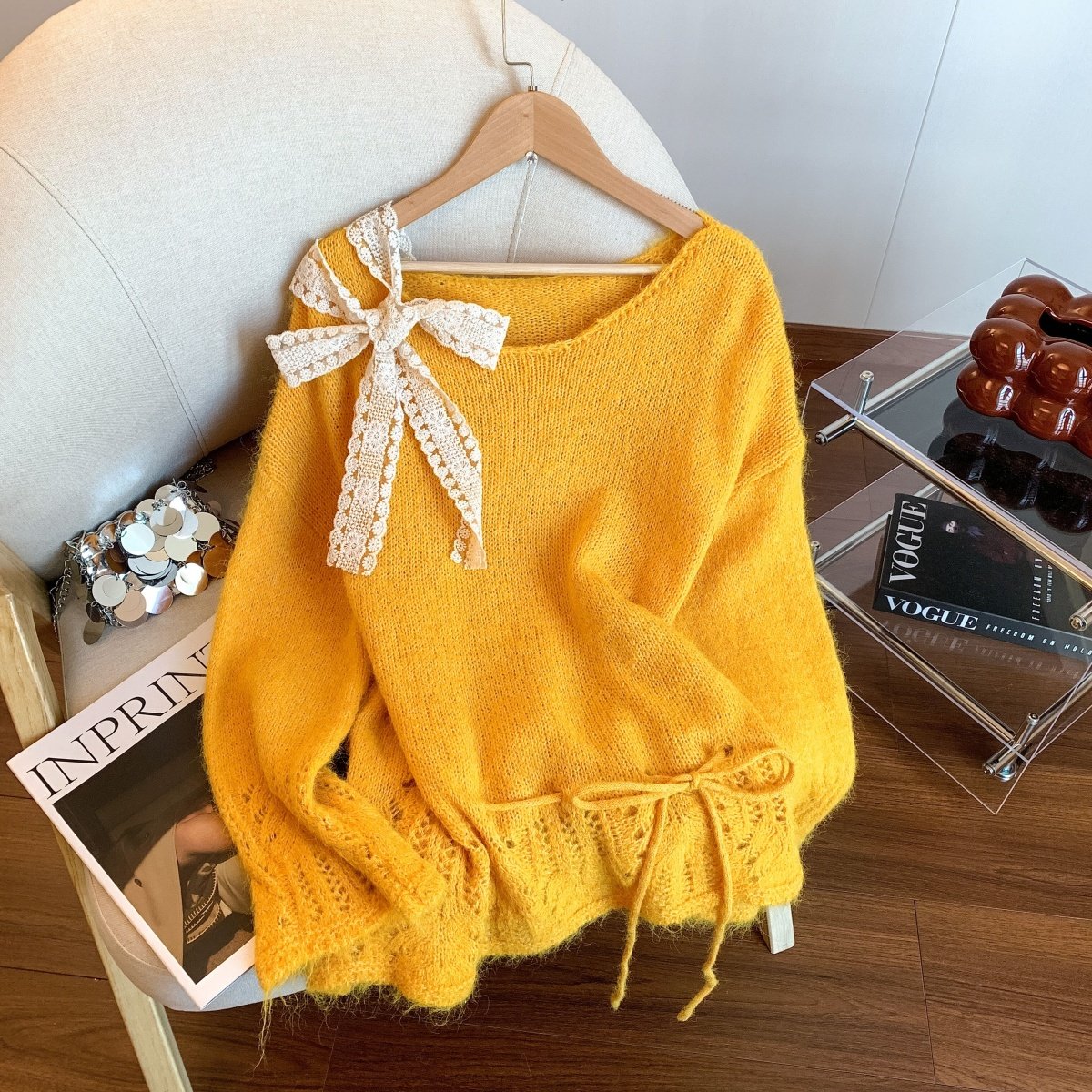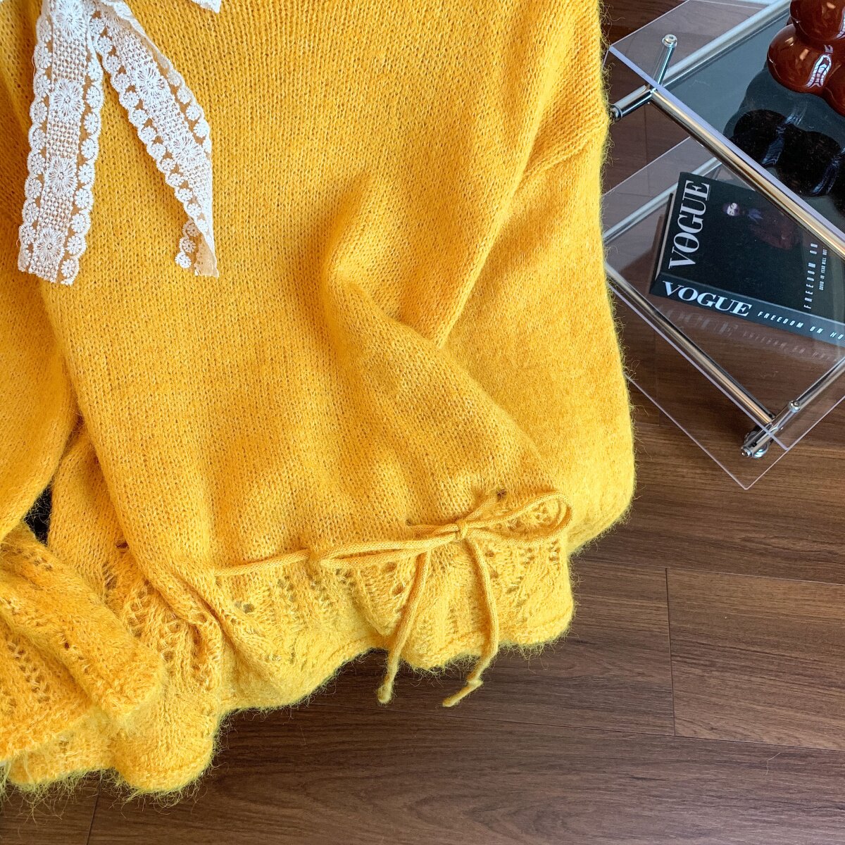 多巴胺黃色針織衫女秋冬季軟糯蝴蝶結系帶長袖寬松慵懶風顯瘦毛衣