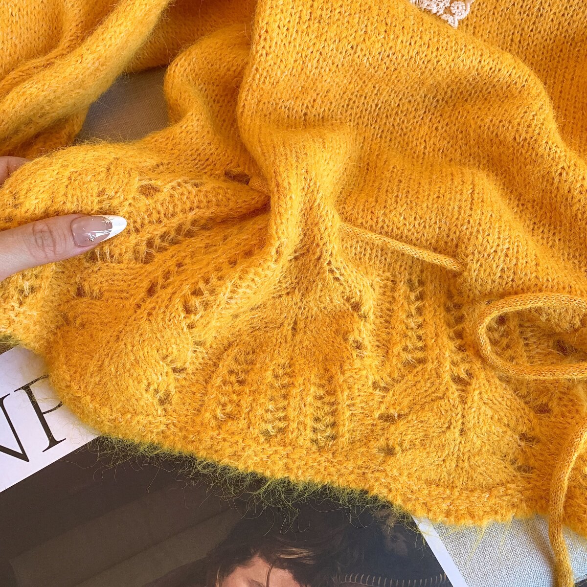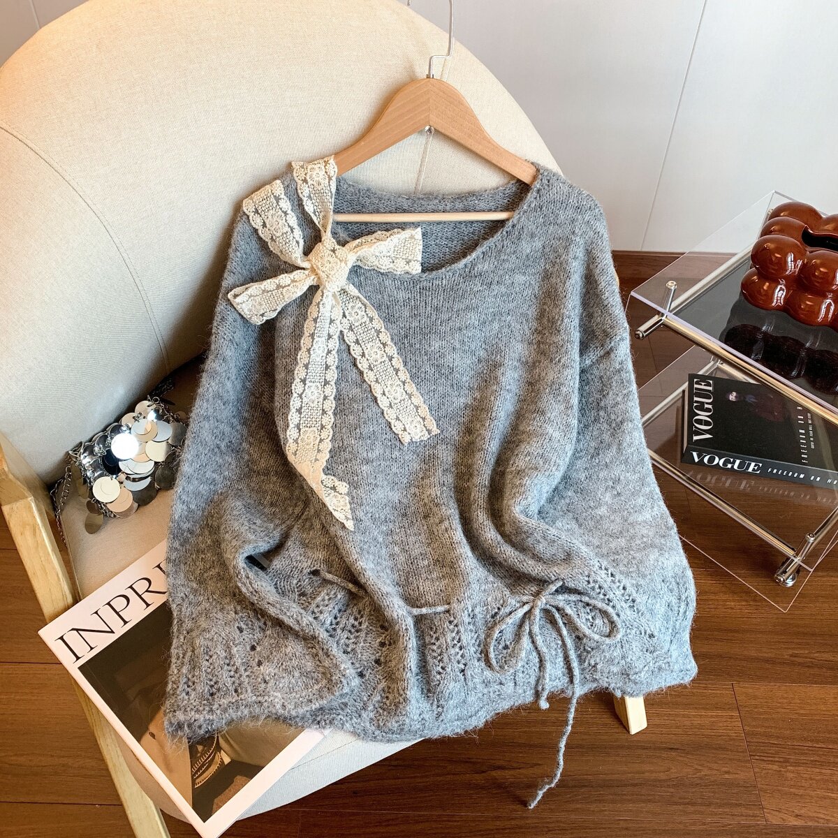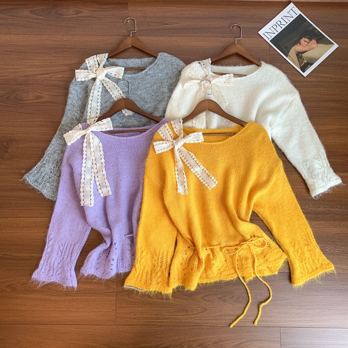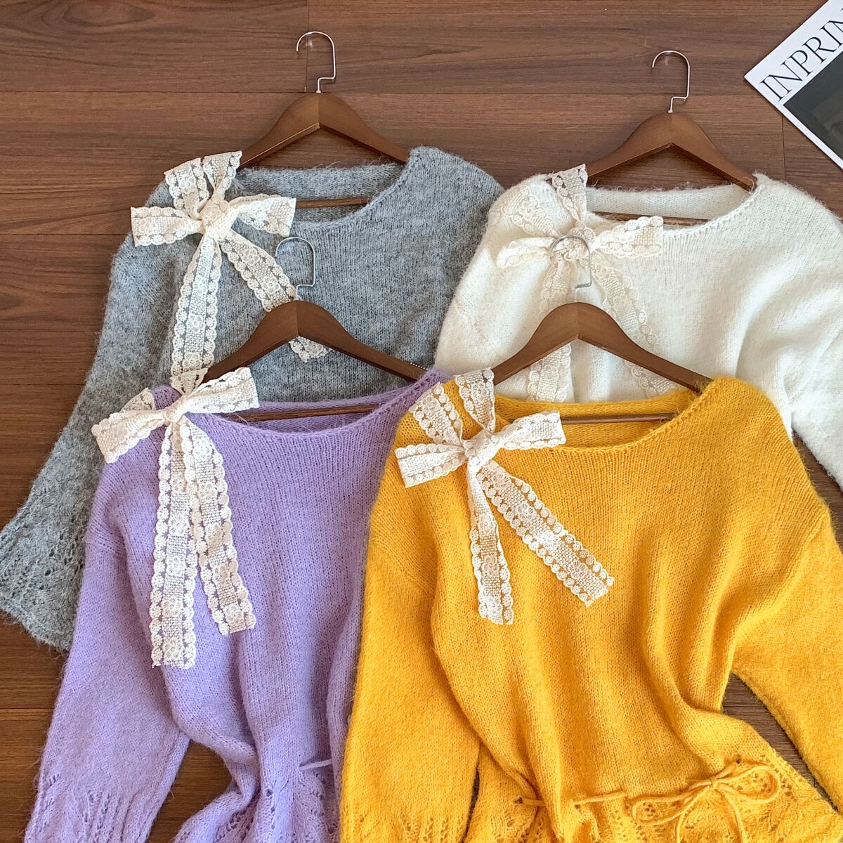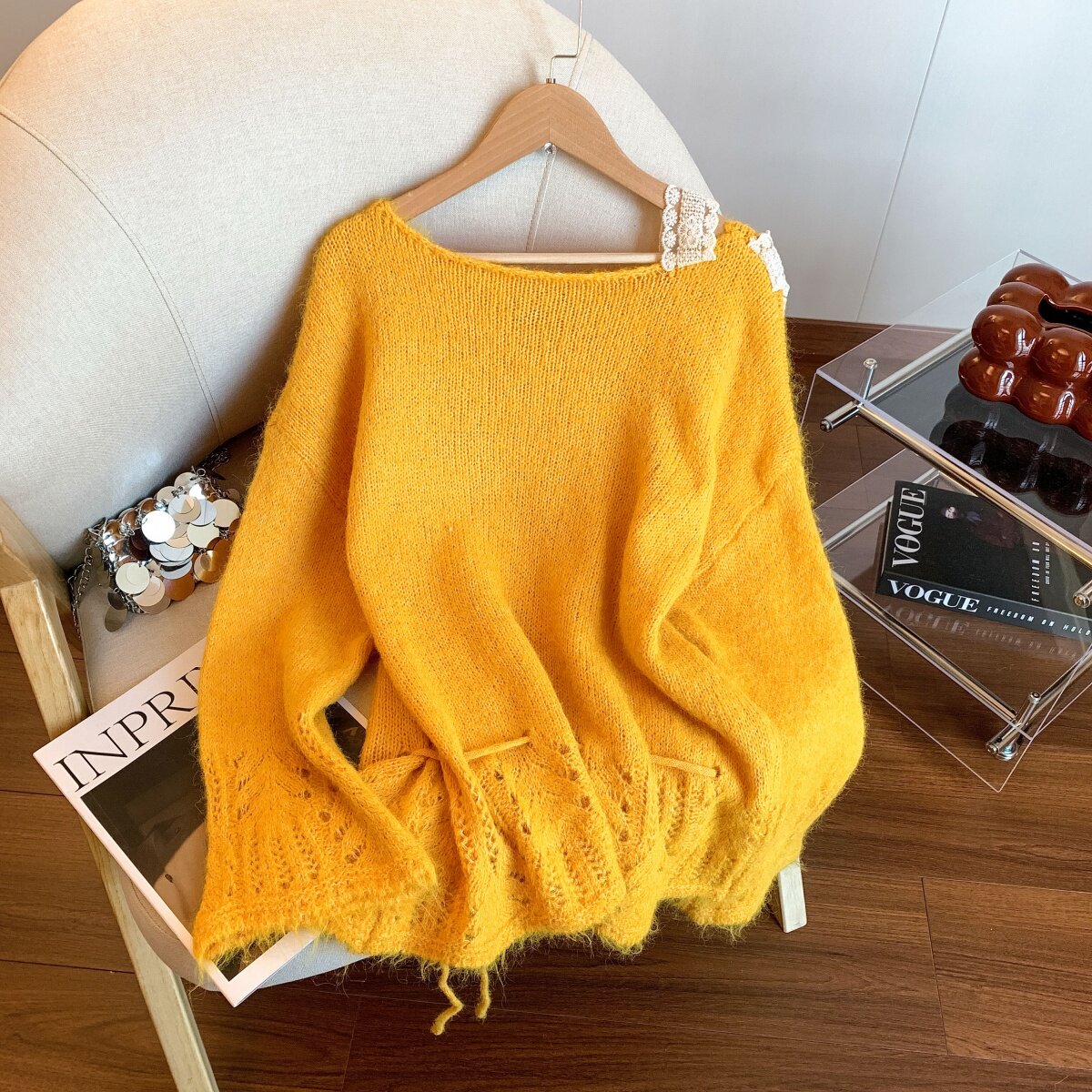 多巴胺黃色針織衫女秋冬季軟糯蝴蝶結系帶長袖寬松慵懶風顯瘦毛衣