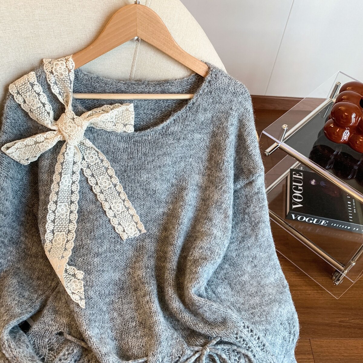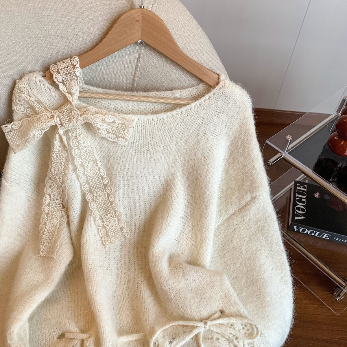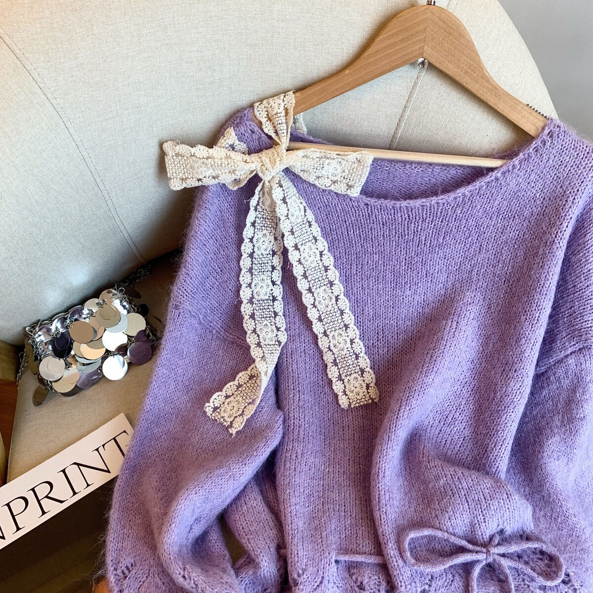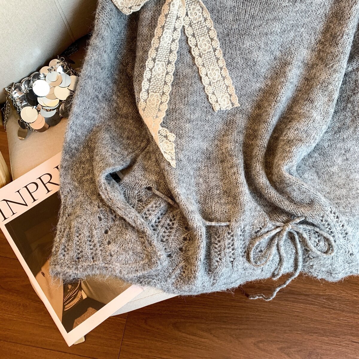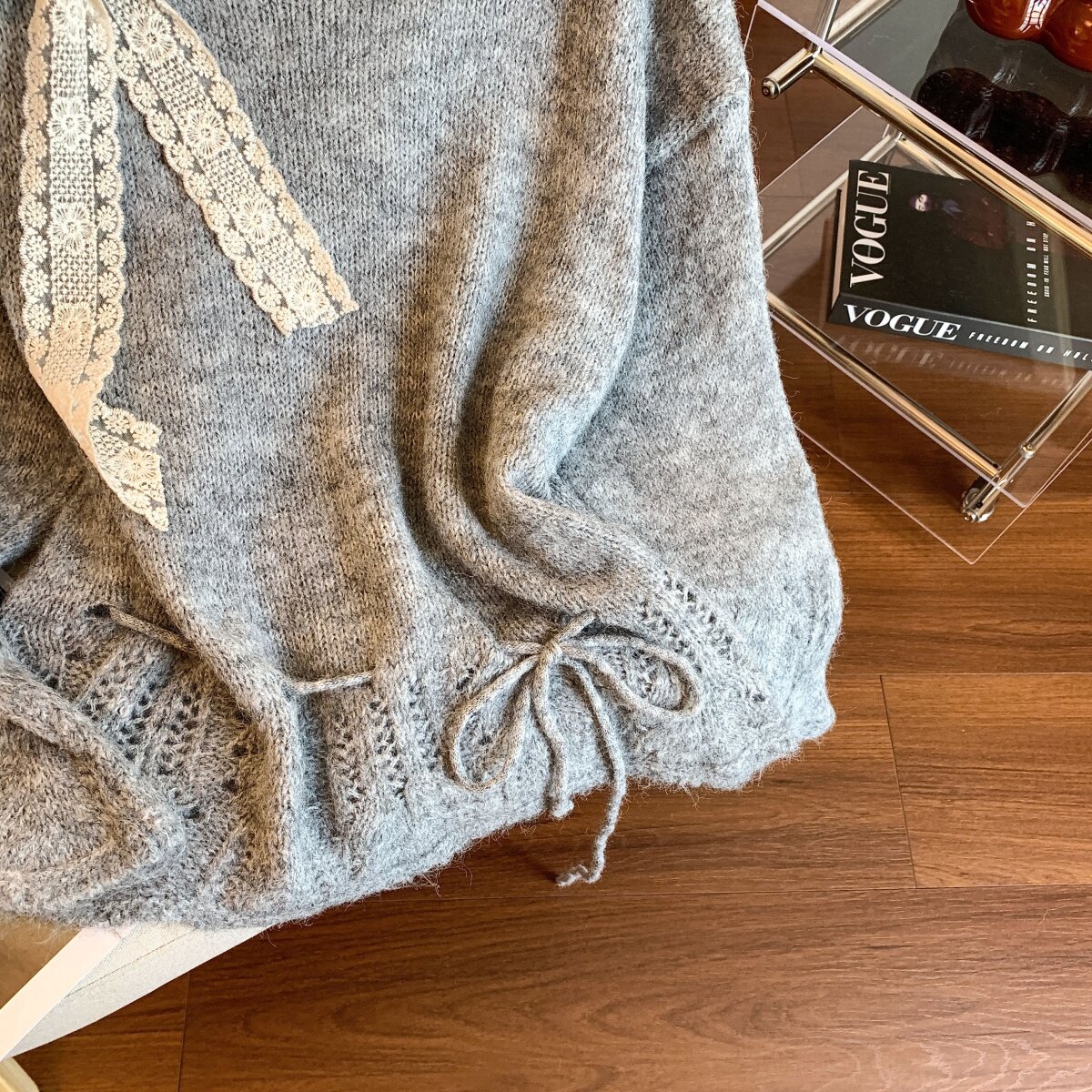 多巴胺黃色針織衫女秋冬季軟糯蝴蝶結系帶長袖寬松慵懶風顯瘦毛衣