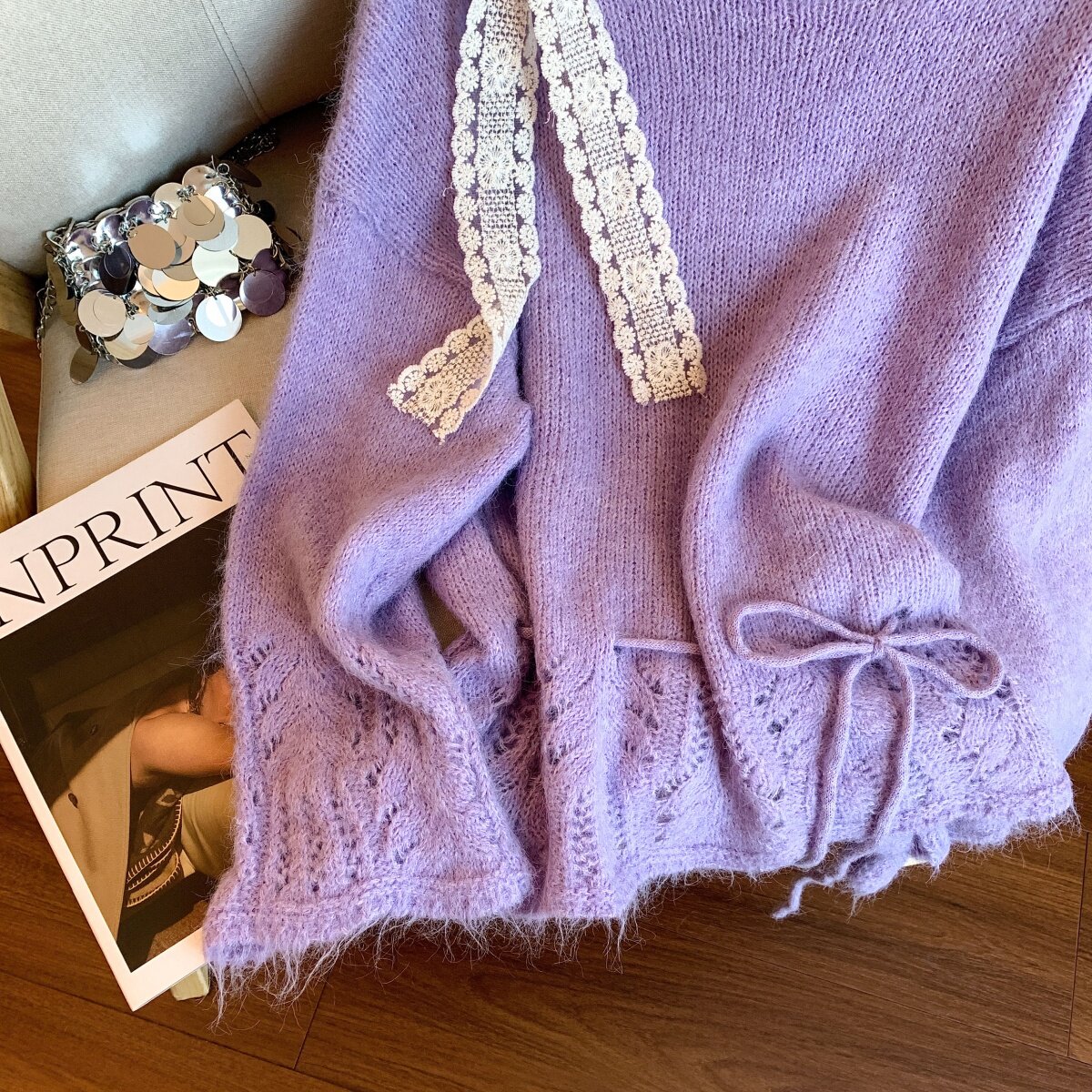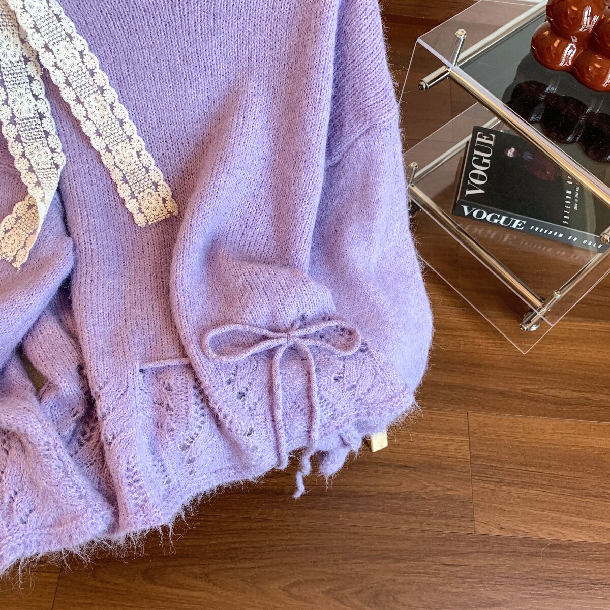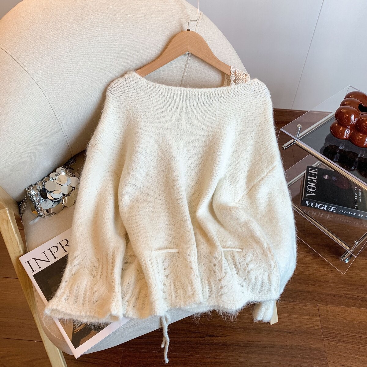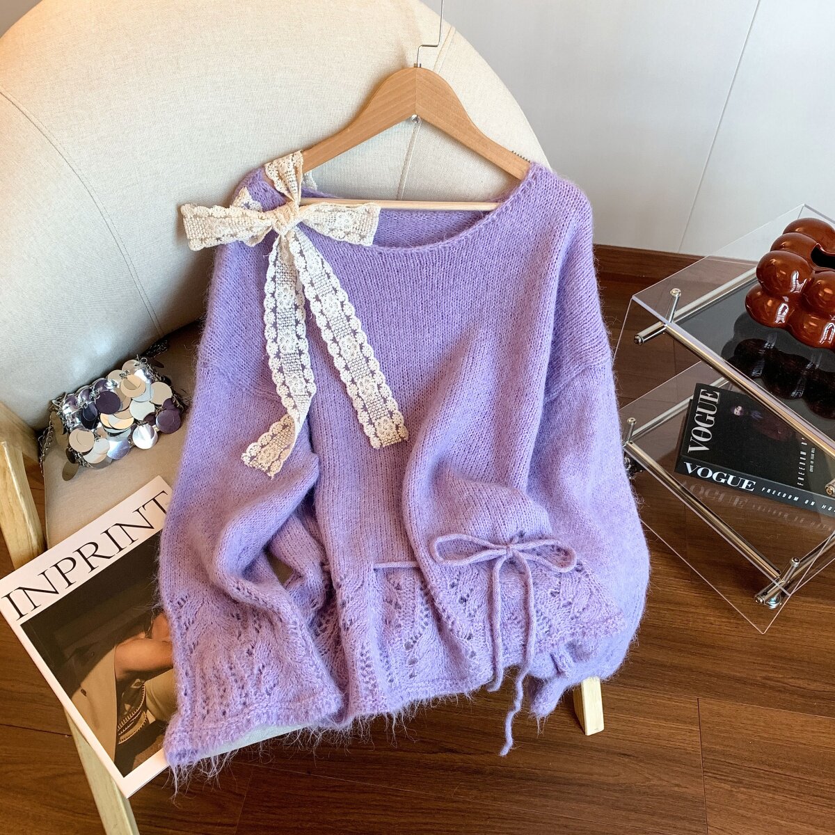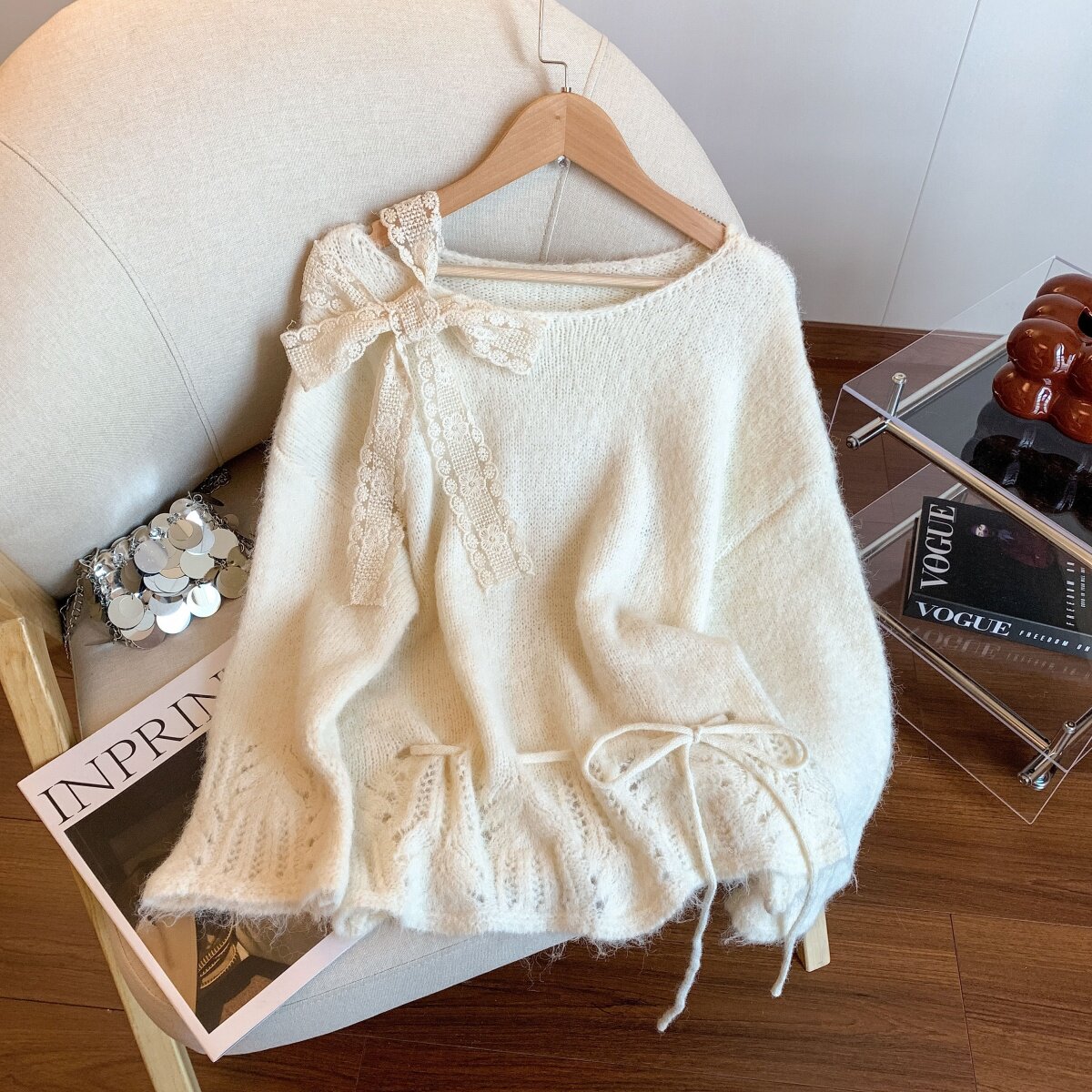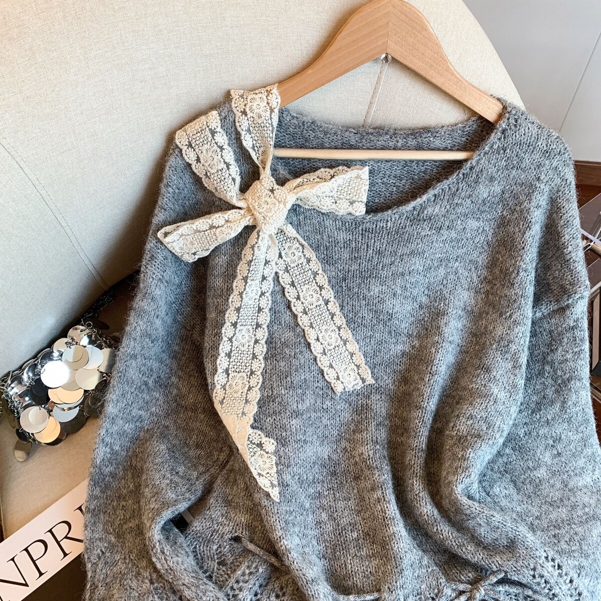 多巴胺黃色針織衫女秋冬季軟糯蝴蝶結系帶長袖寬松慵懶風顯瘦毛衣