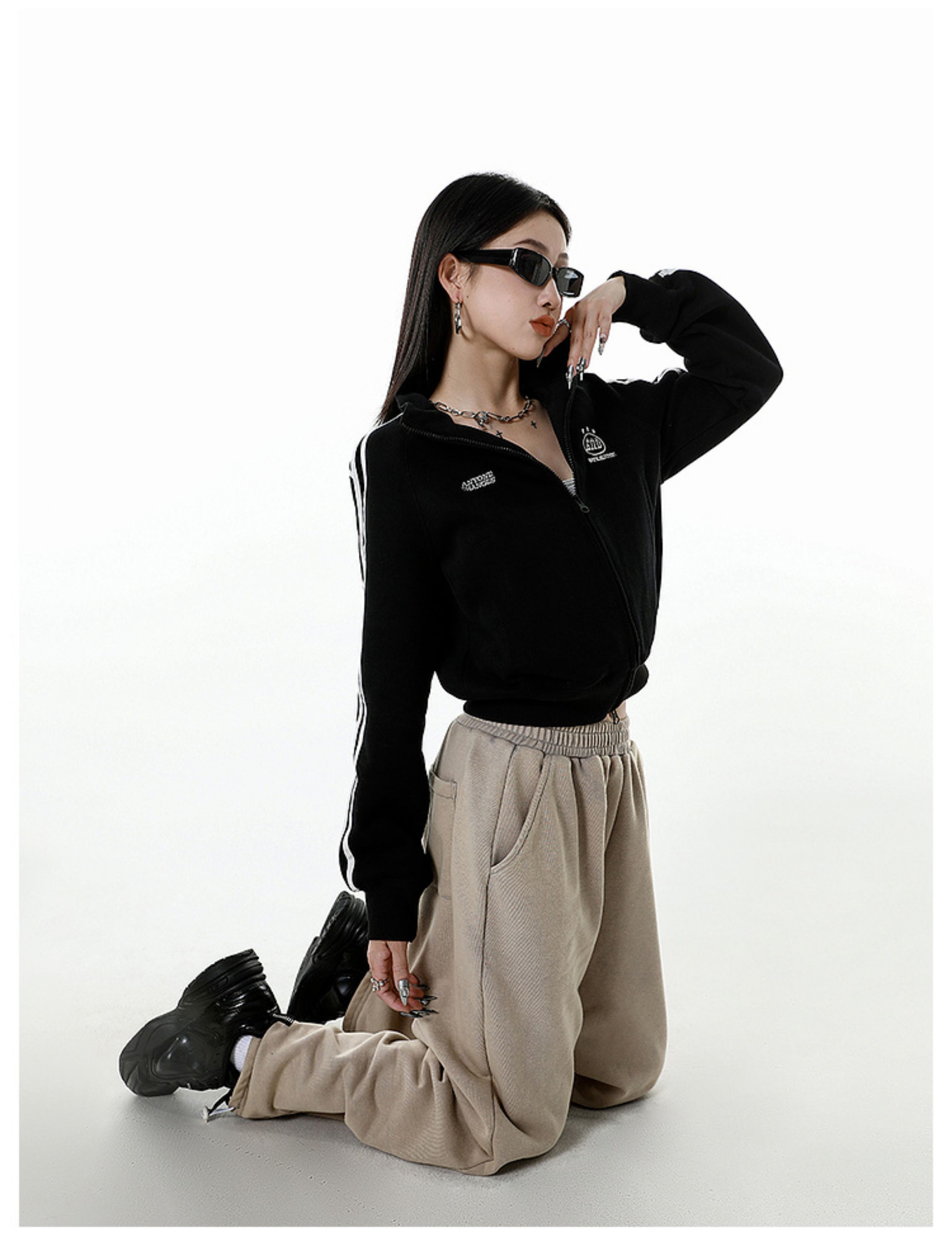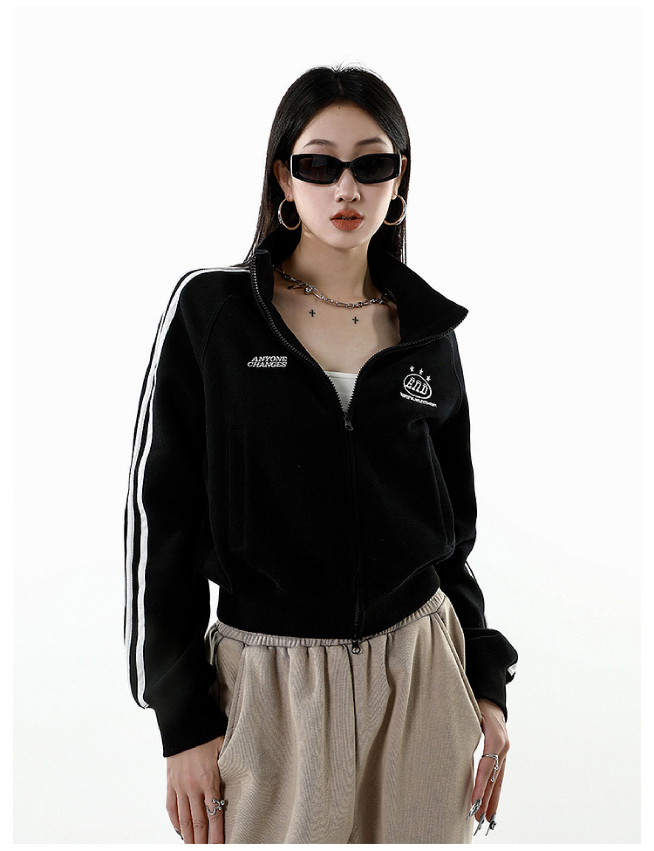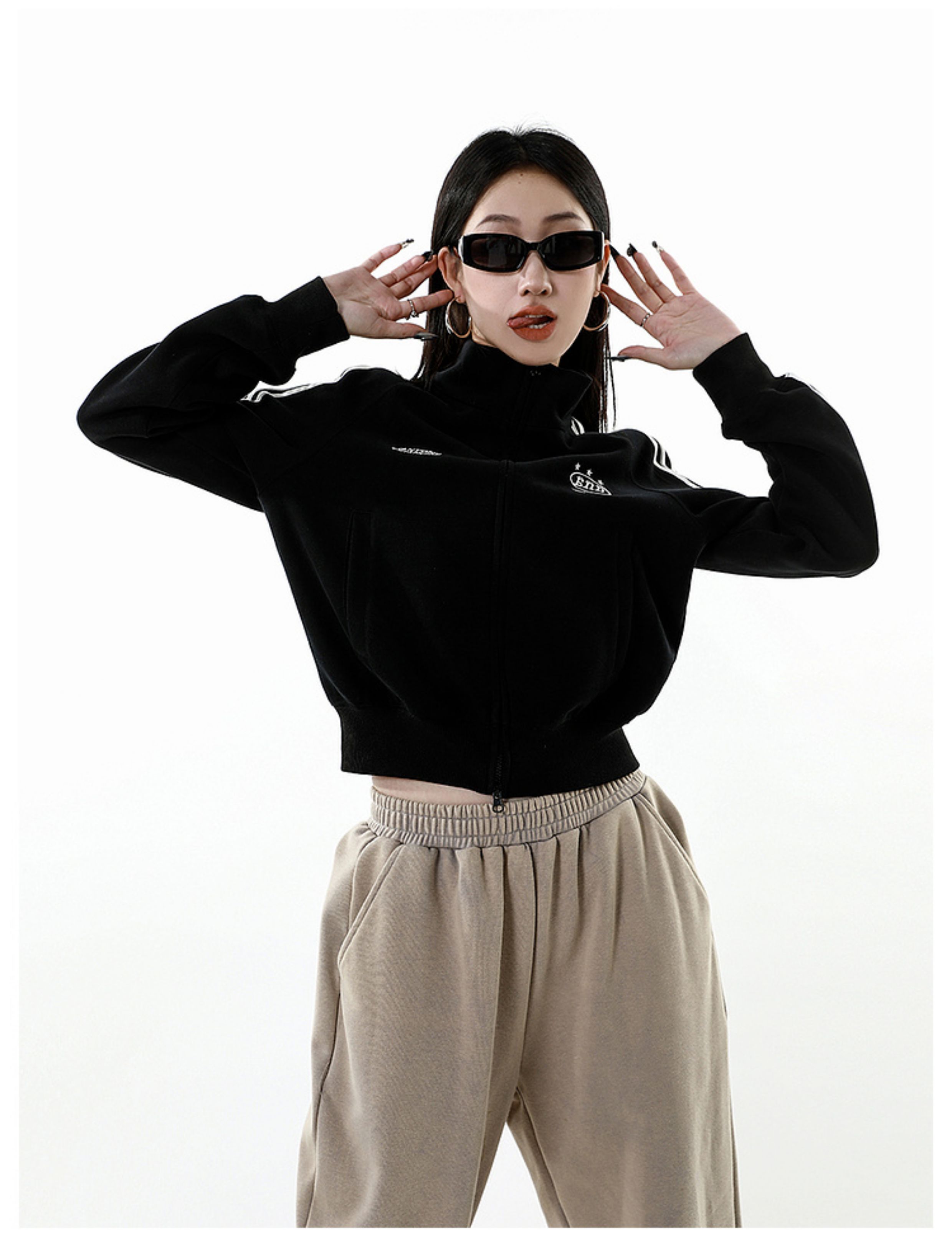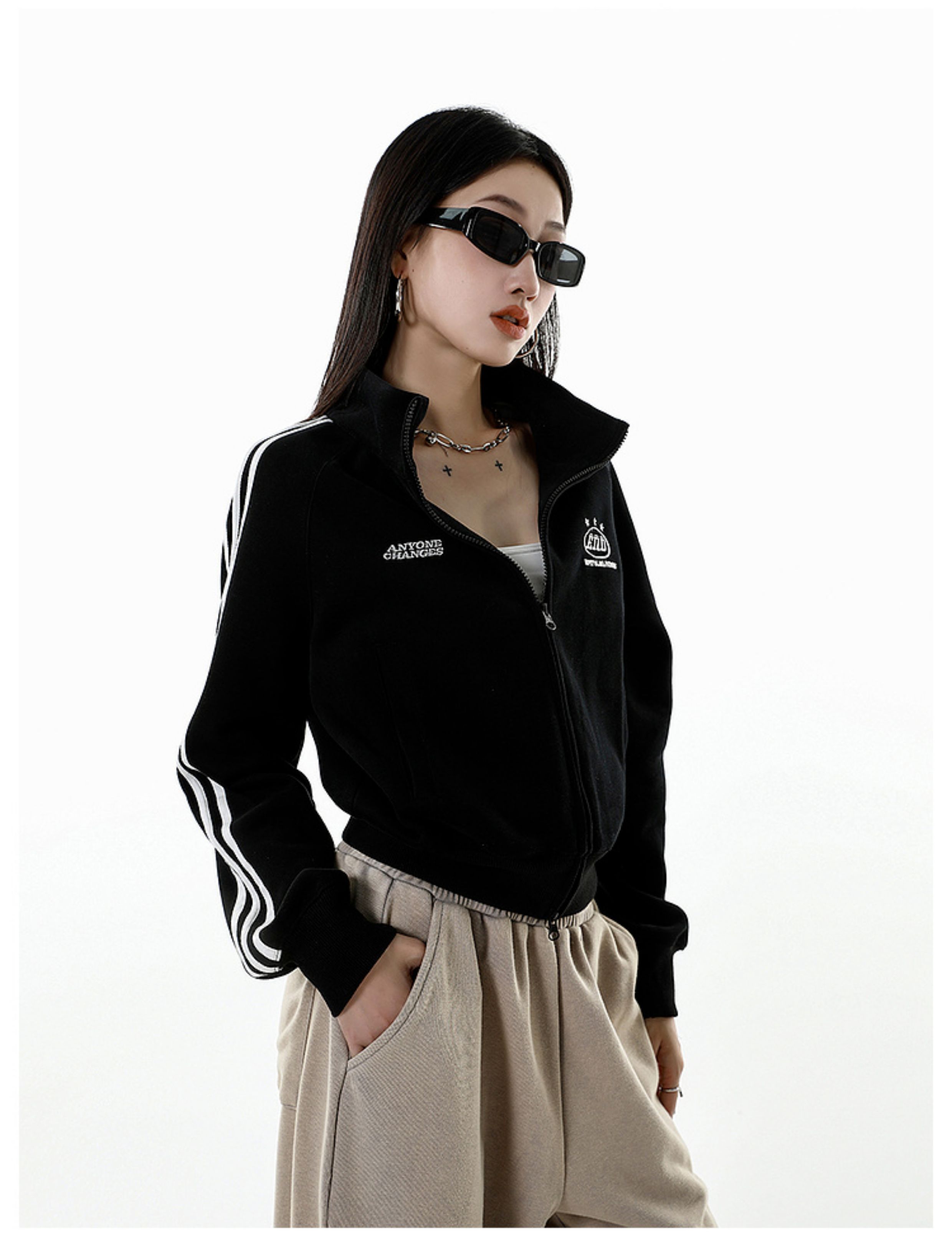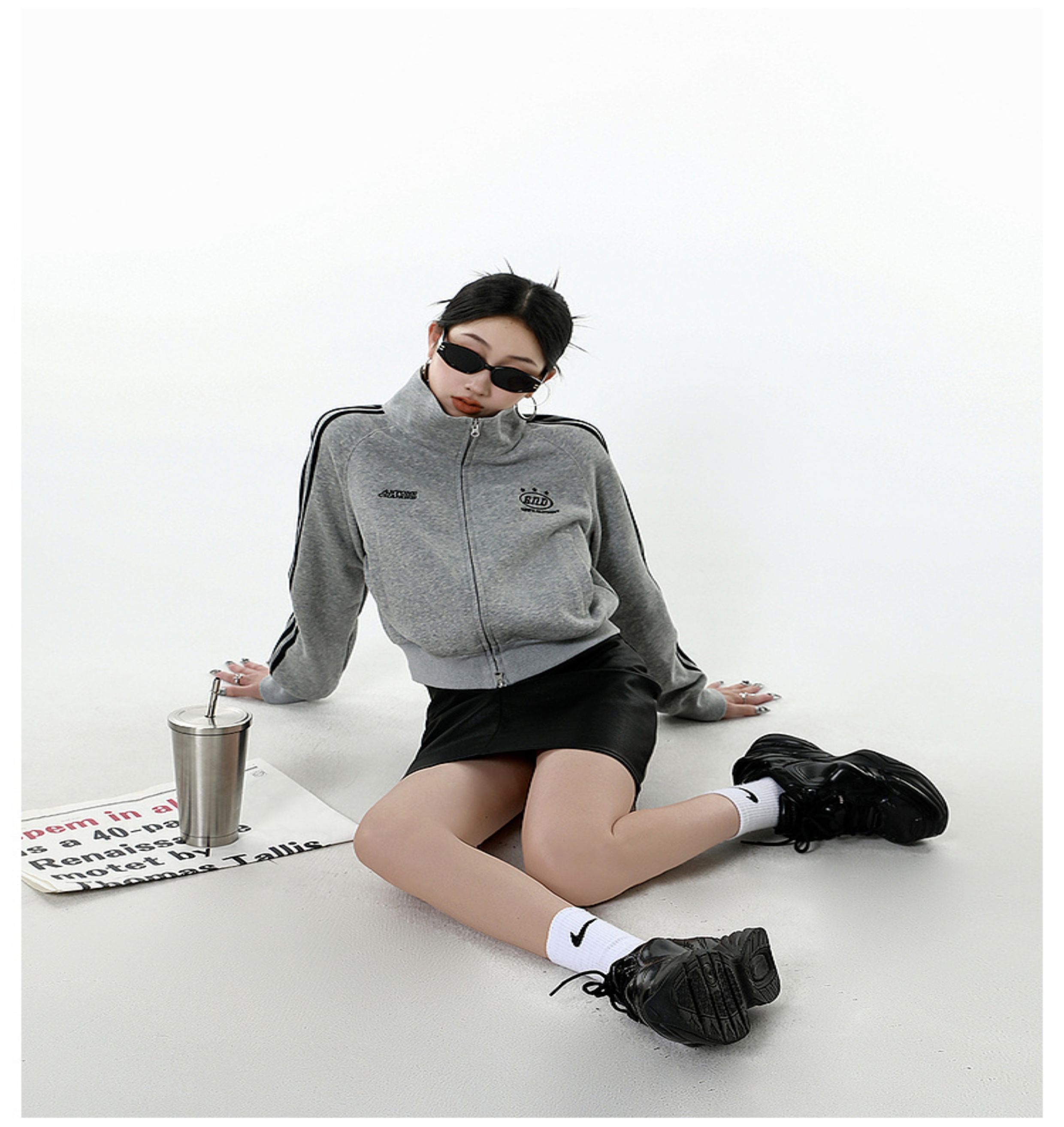 ICH MODE 美式修身短款黑色外套女2026新款春季運動連帽衛衣開衫