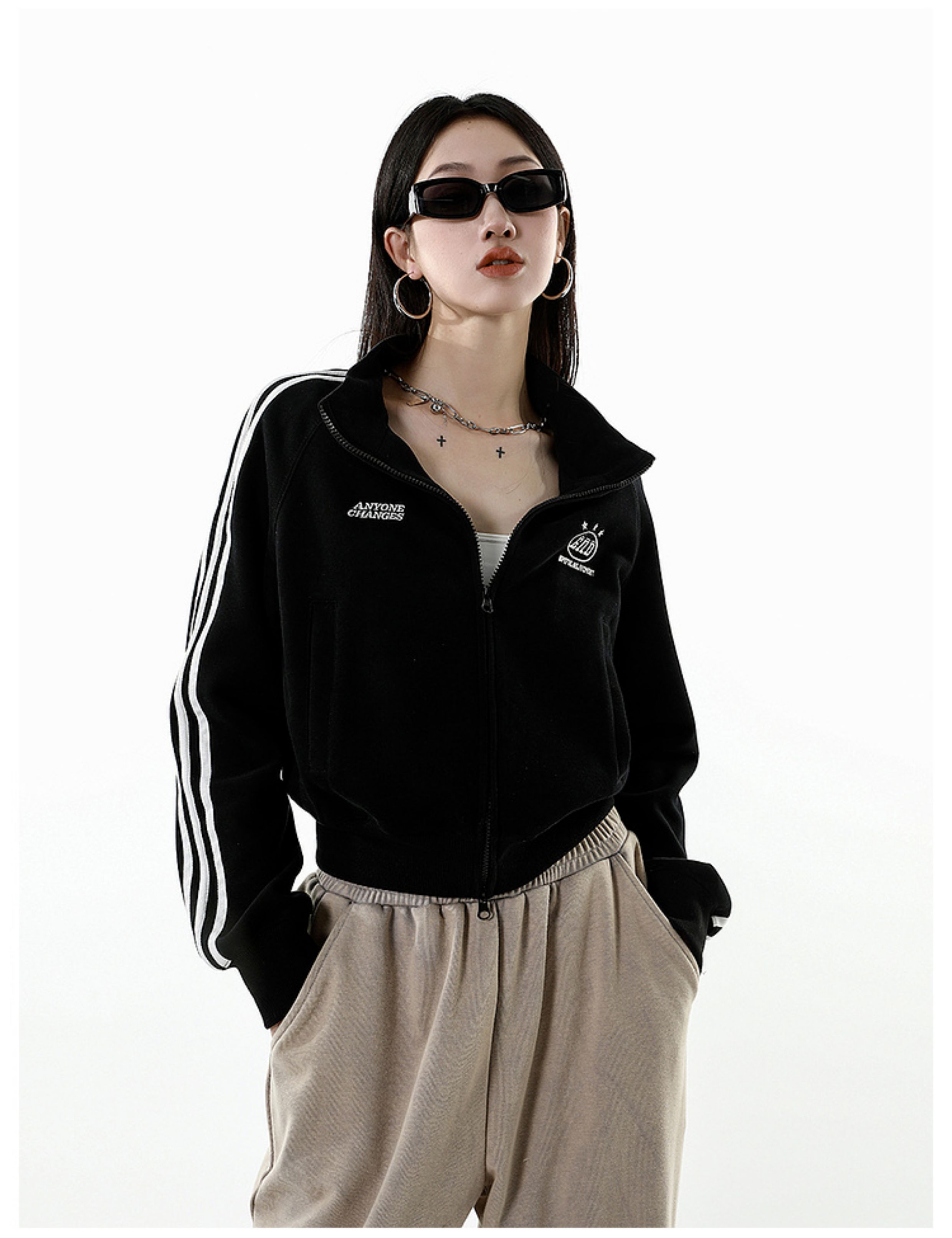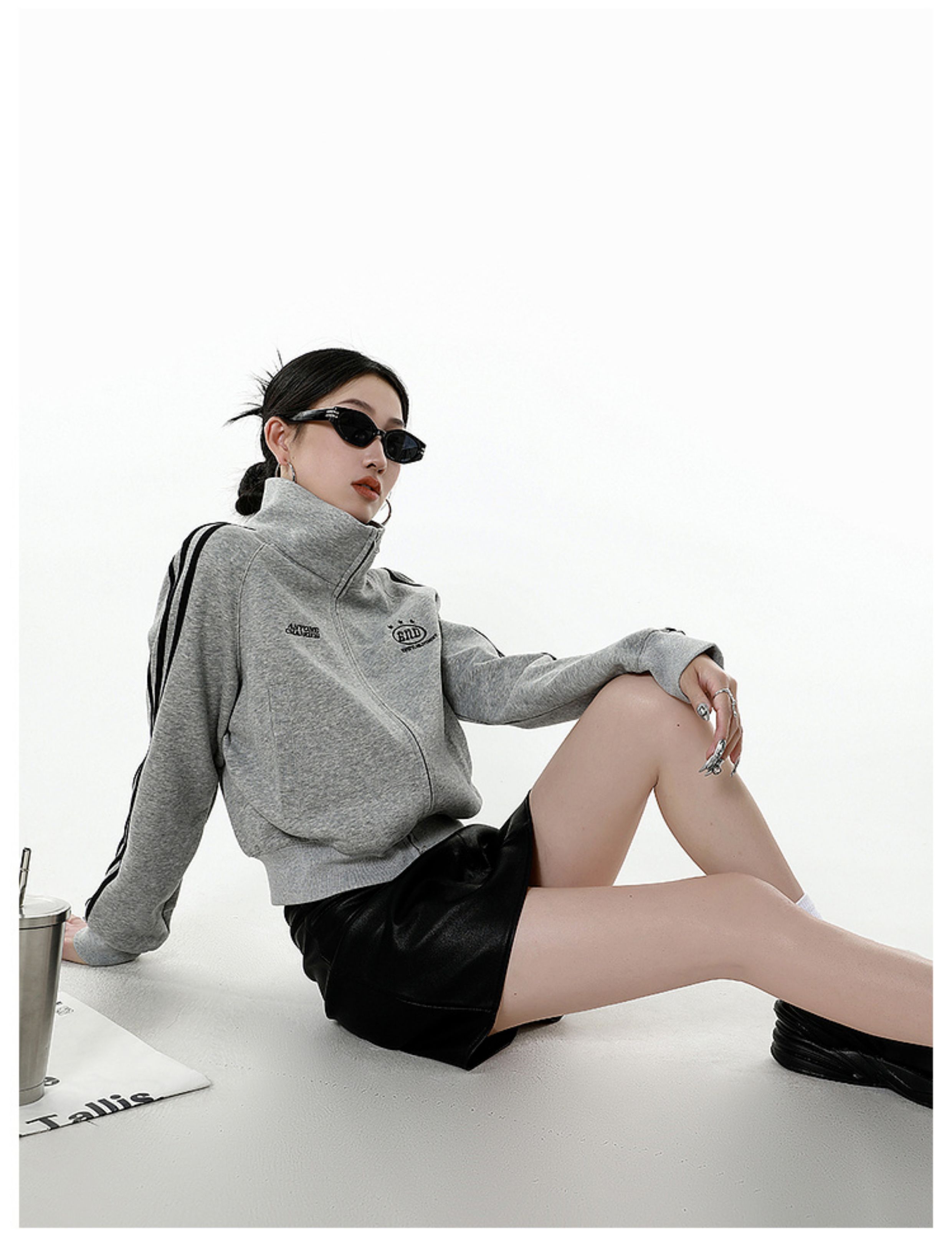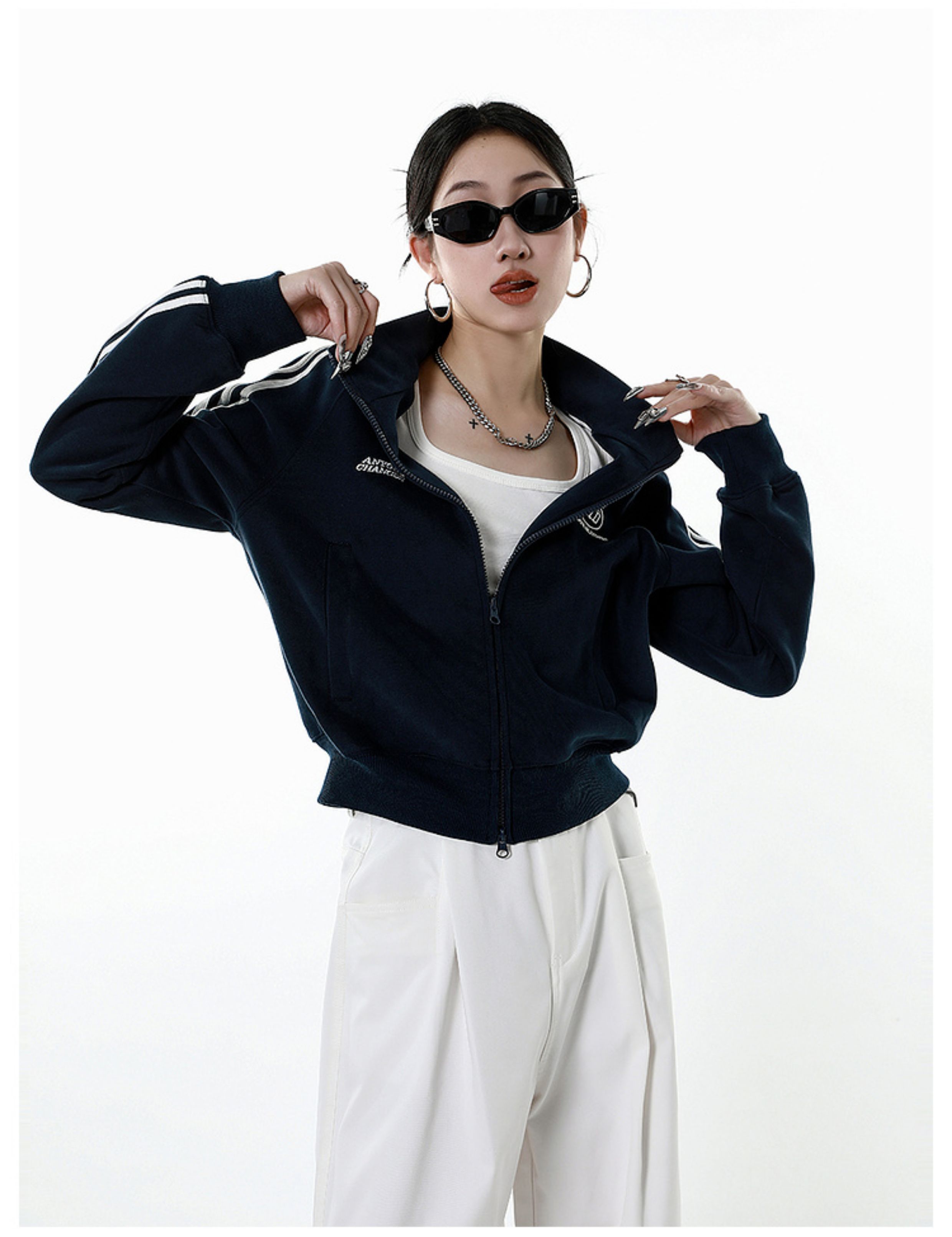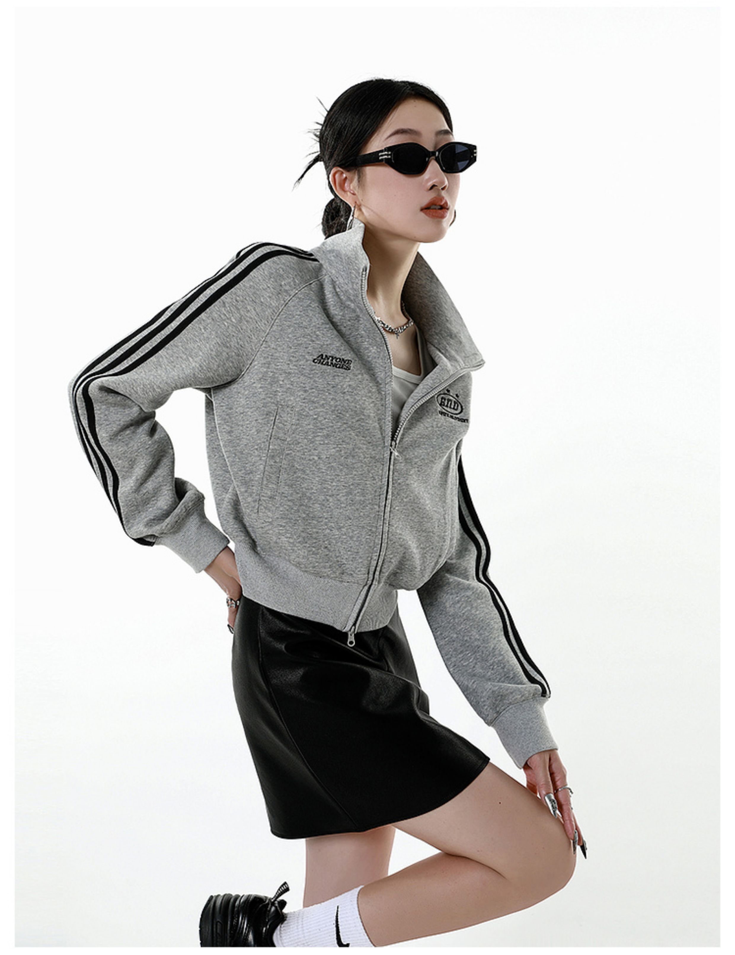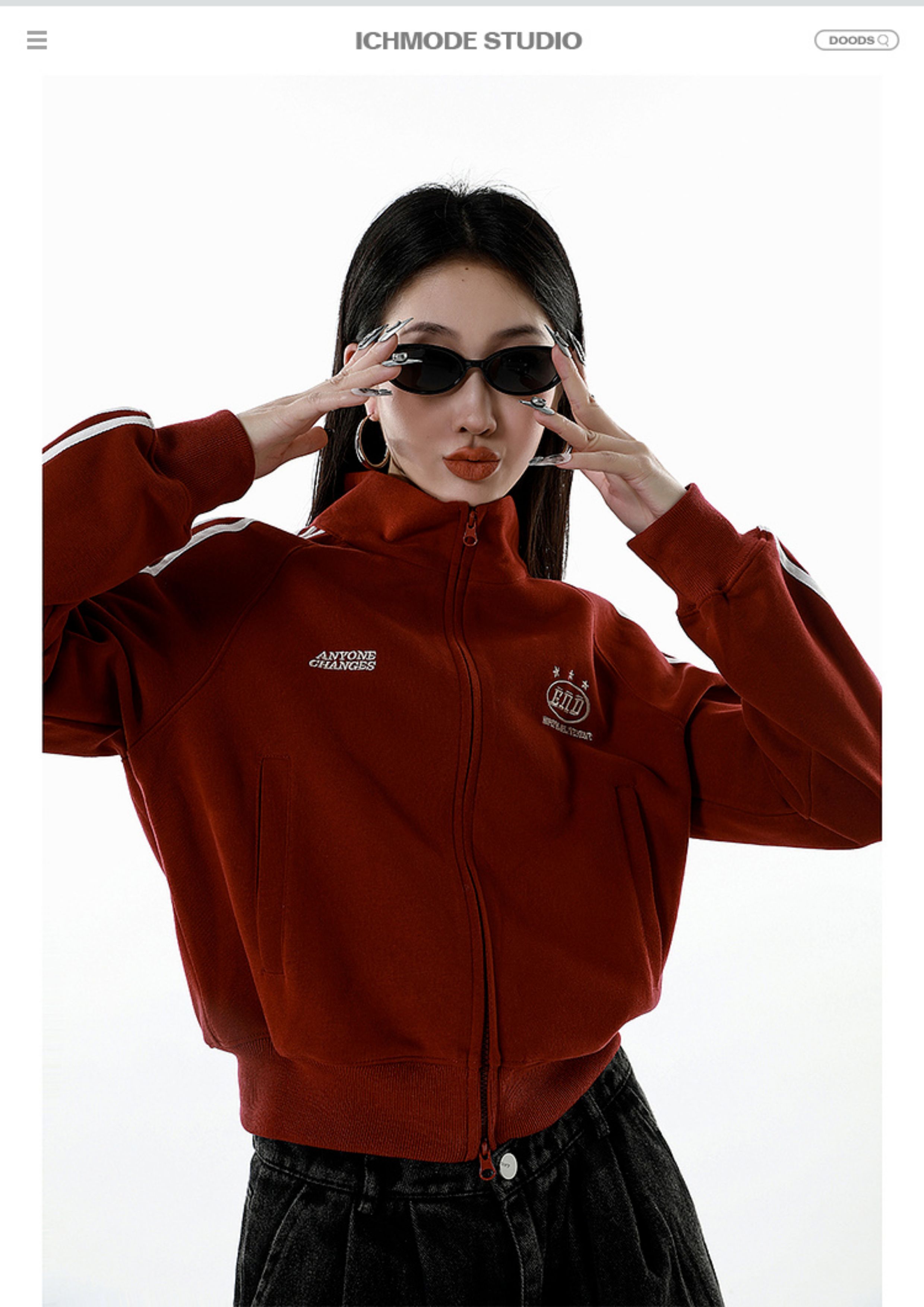 ICH MODE 美式修身短款黑色外套女2026新款春季運動連帽衛衣開衫