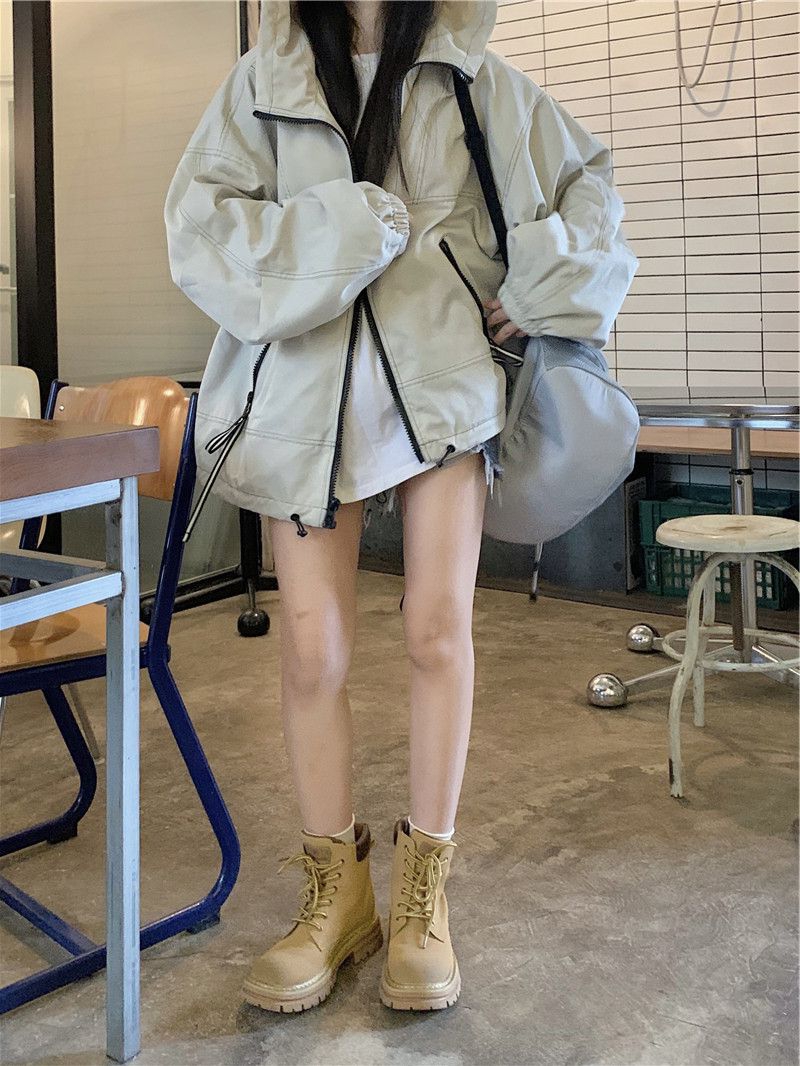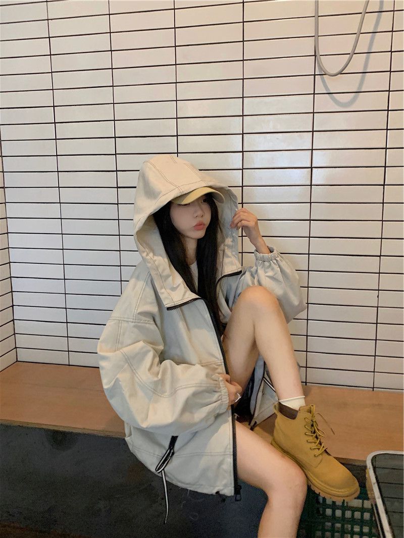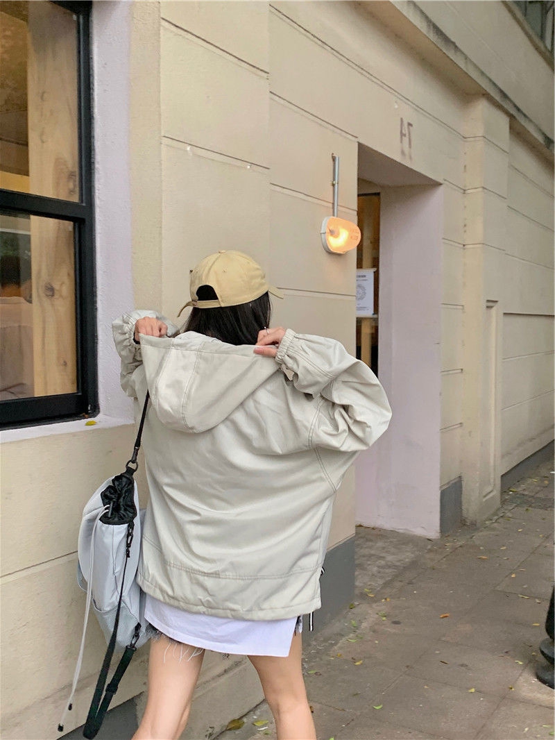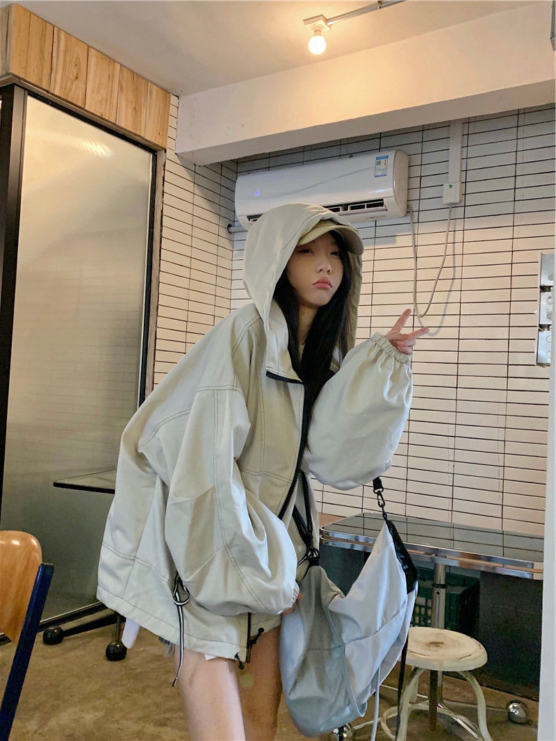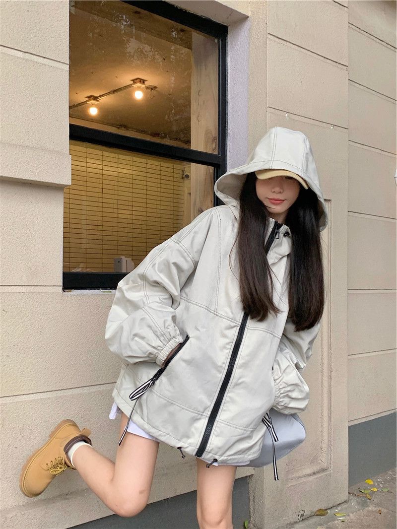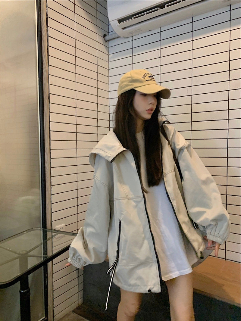 胖MM大碼300斤美式復古連帽沖鋒衣外套女春秋設計感小衆夾克上衣
