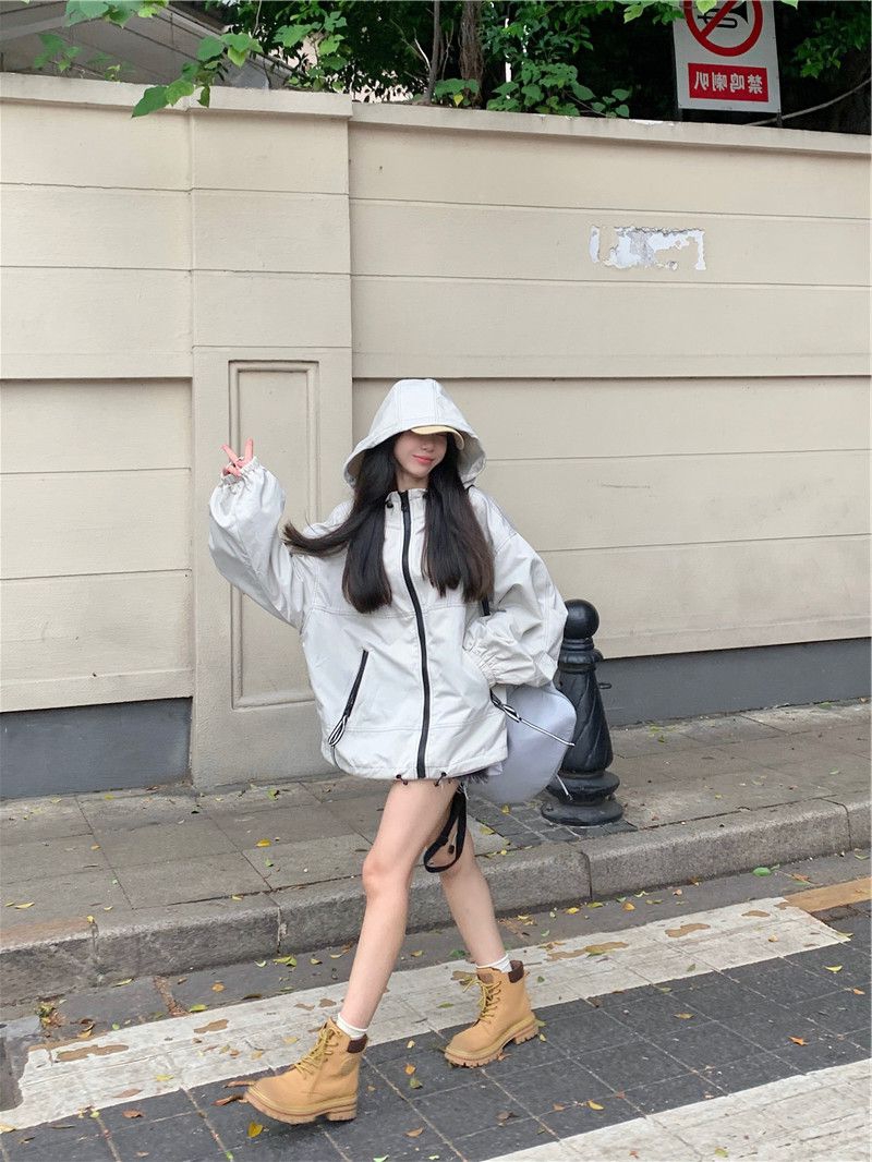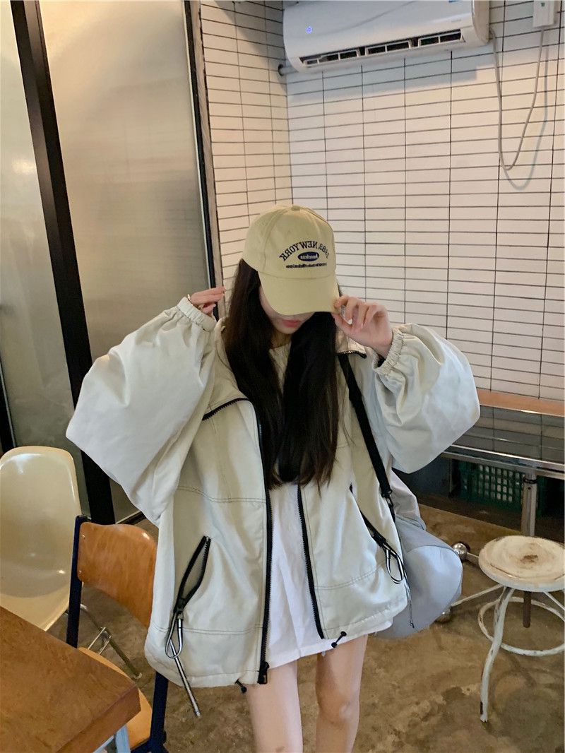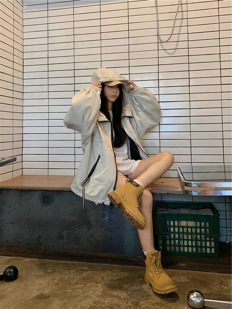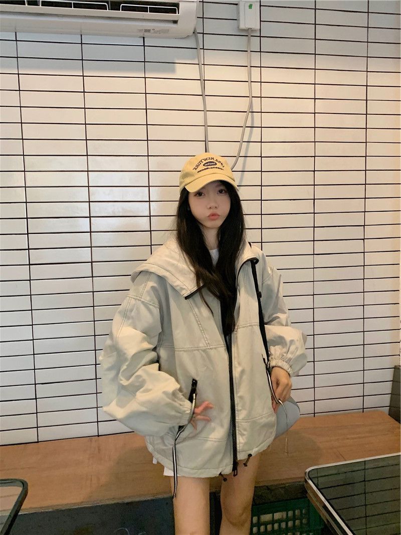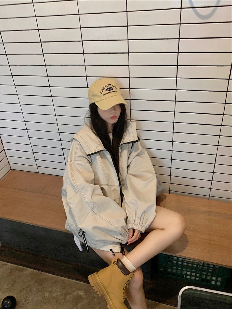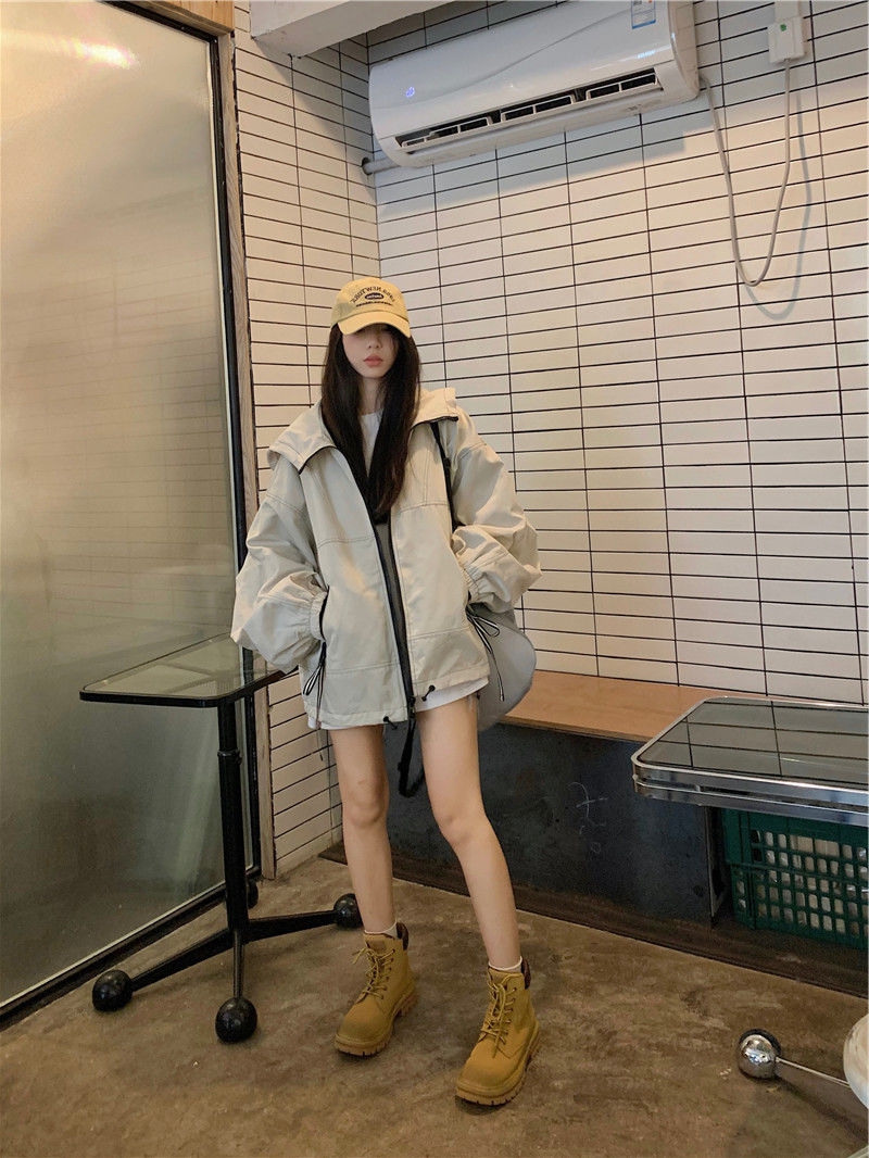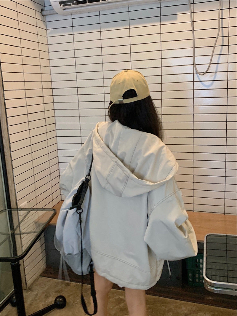 胖MM大碼300斤美式復古連帽沖鋒衣外套女春秋設計感小衆夾克上衣