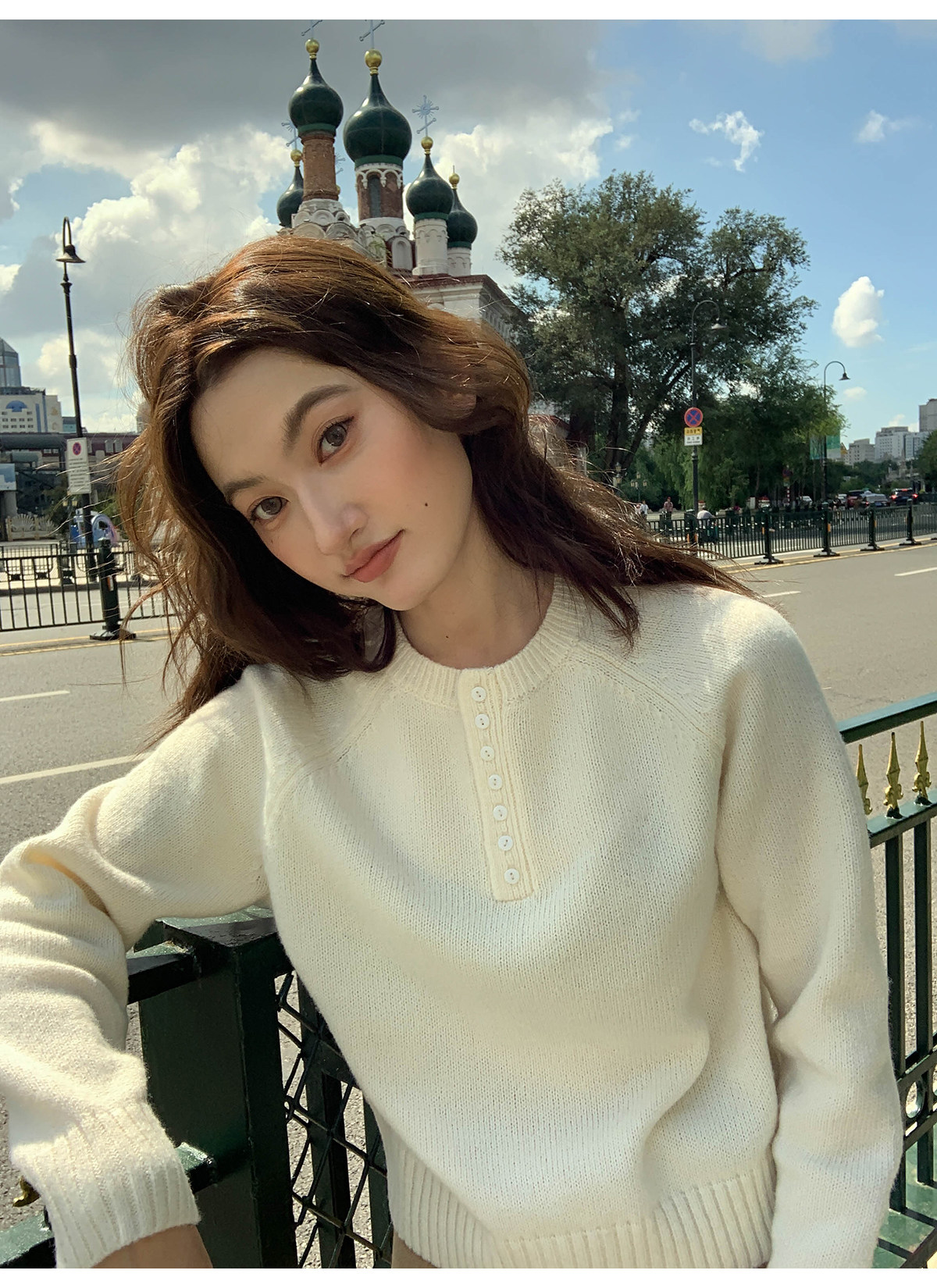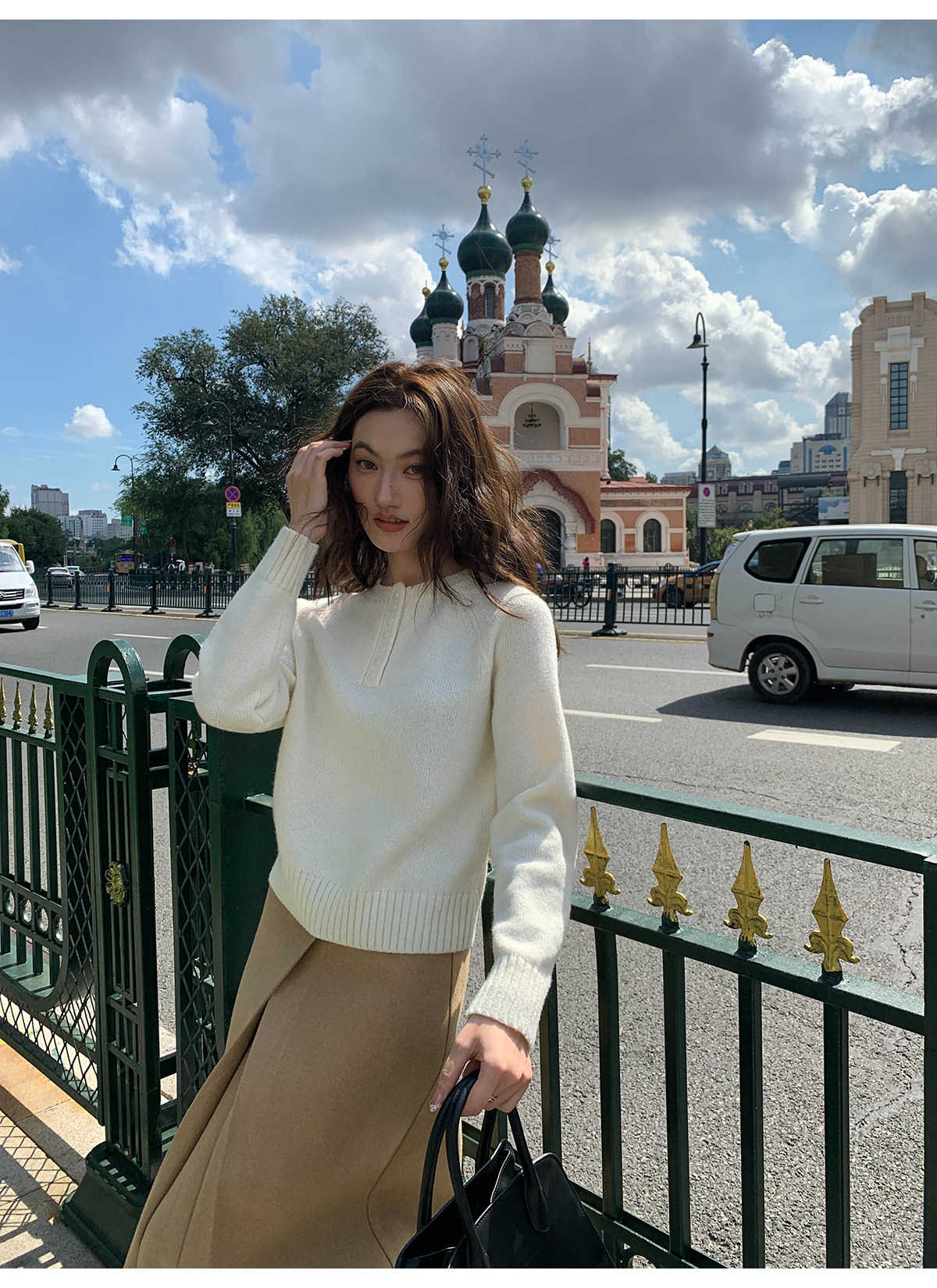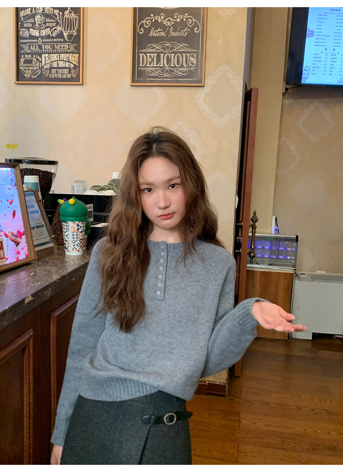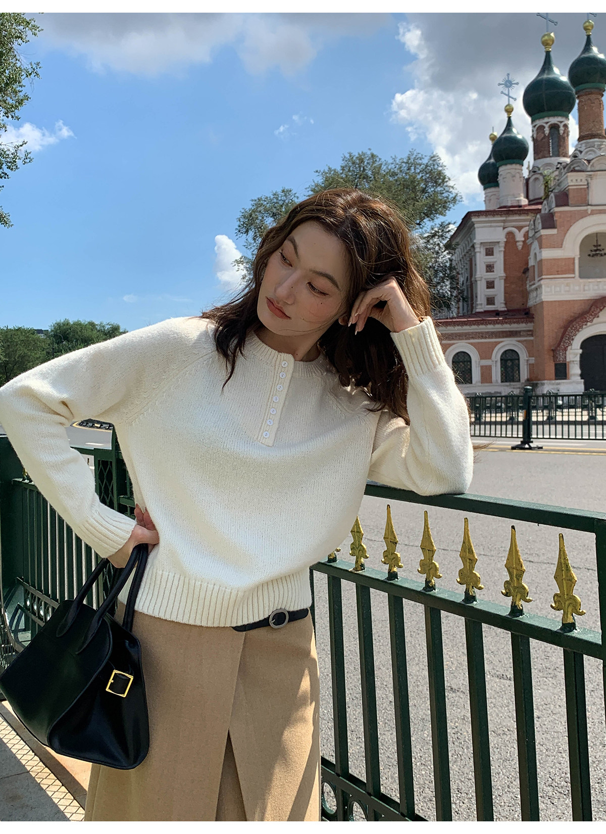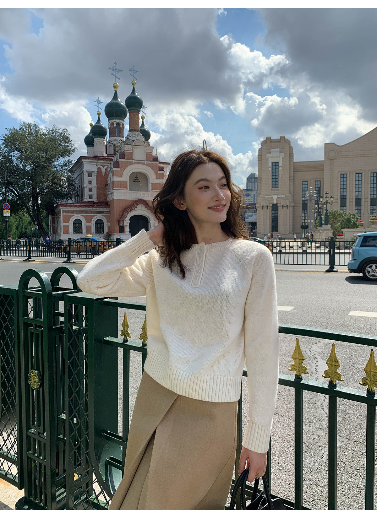 你好卡農 亨利領插肩袖套頭針織衫女秋2025新款寬鬆簡約純色毛衣