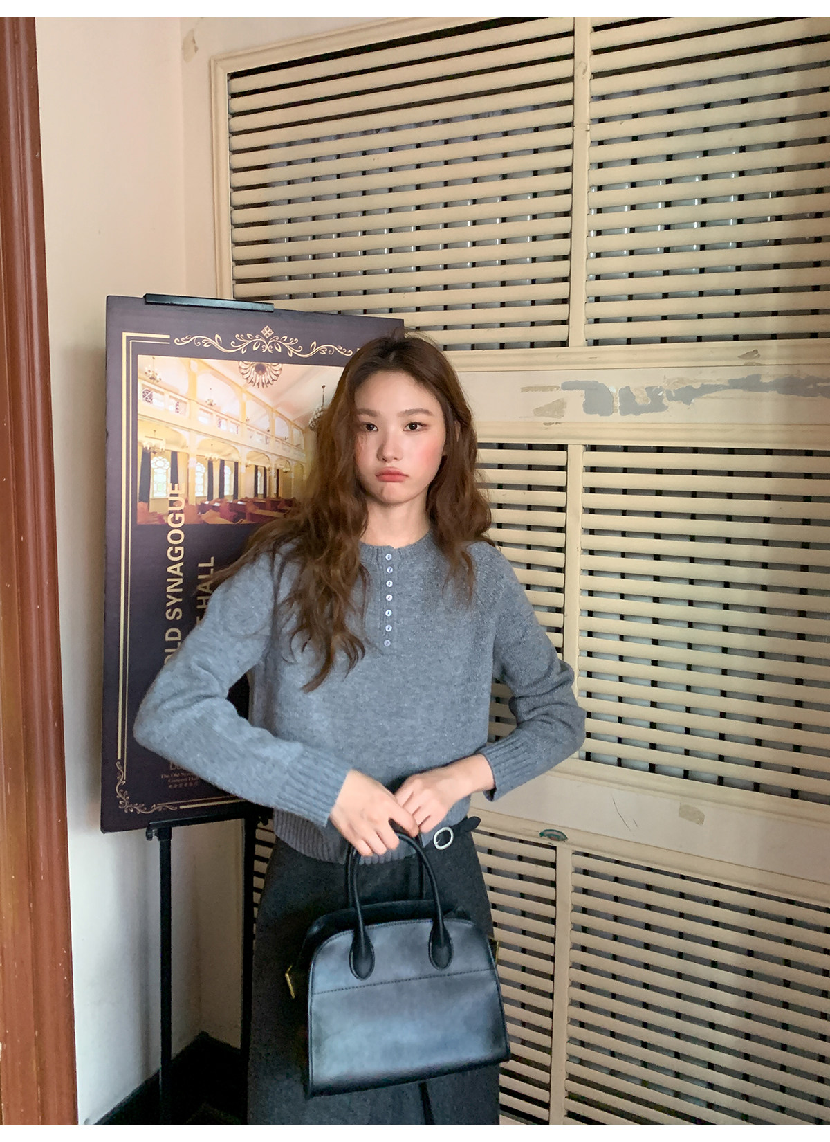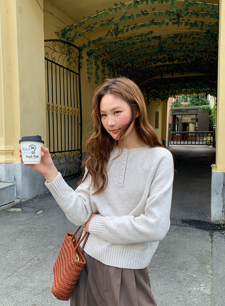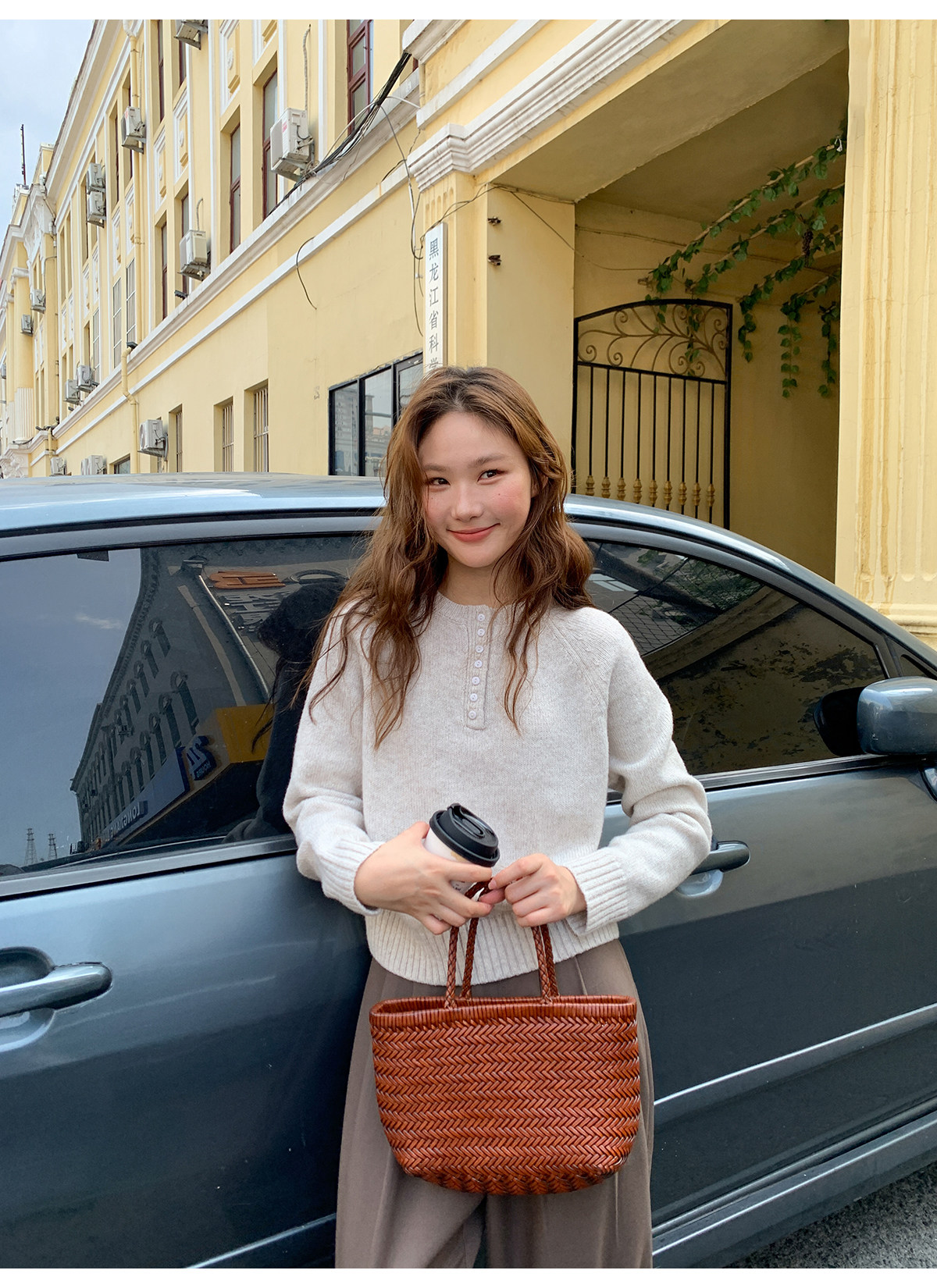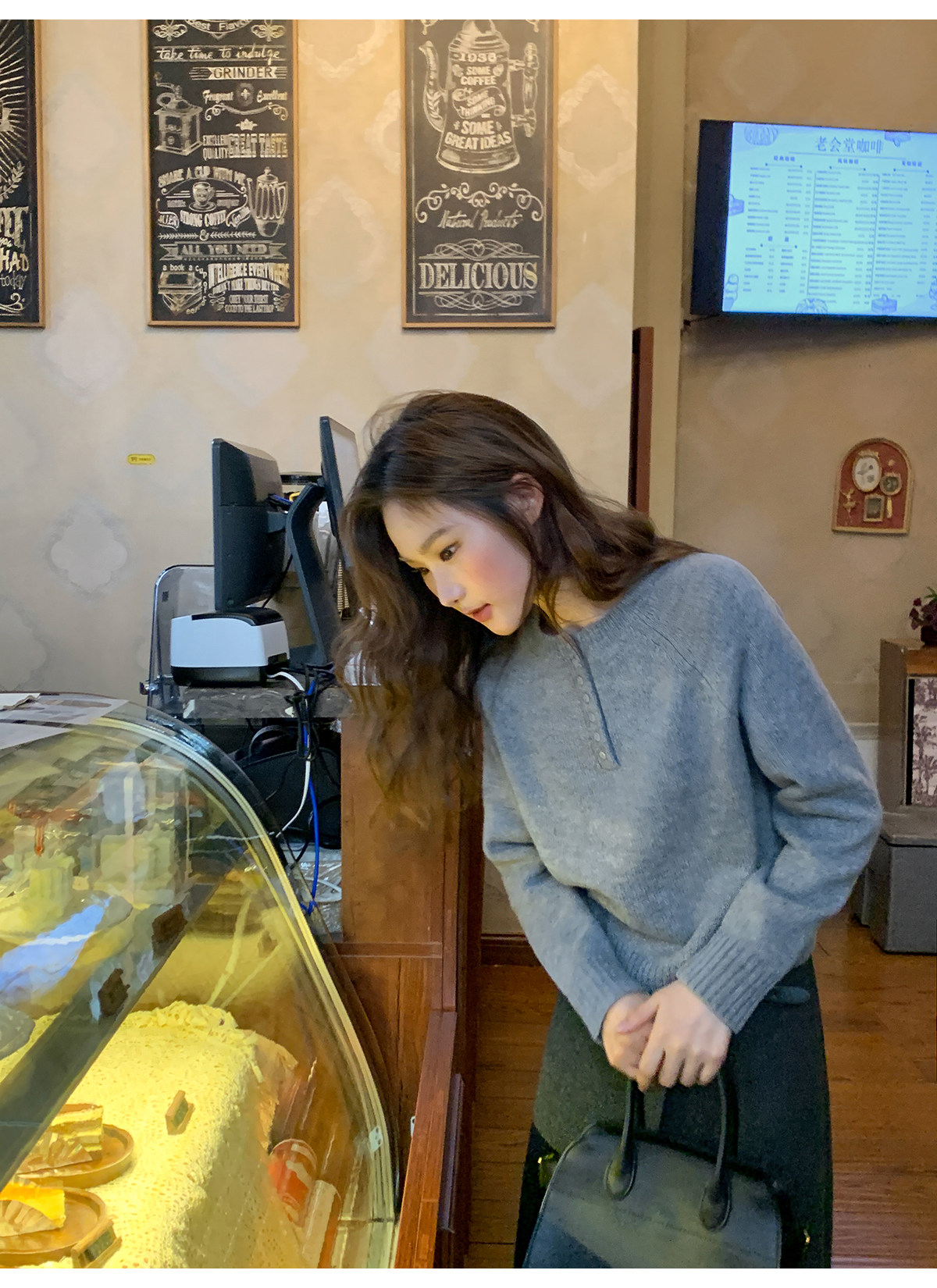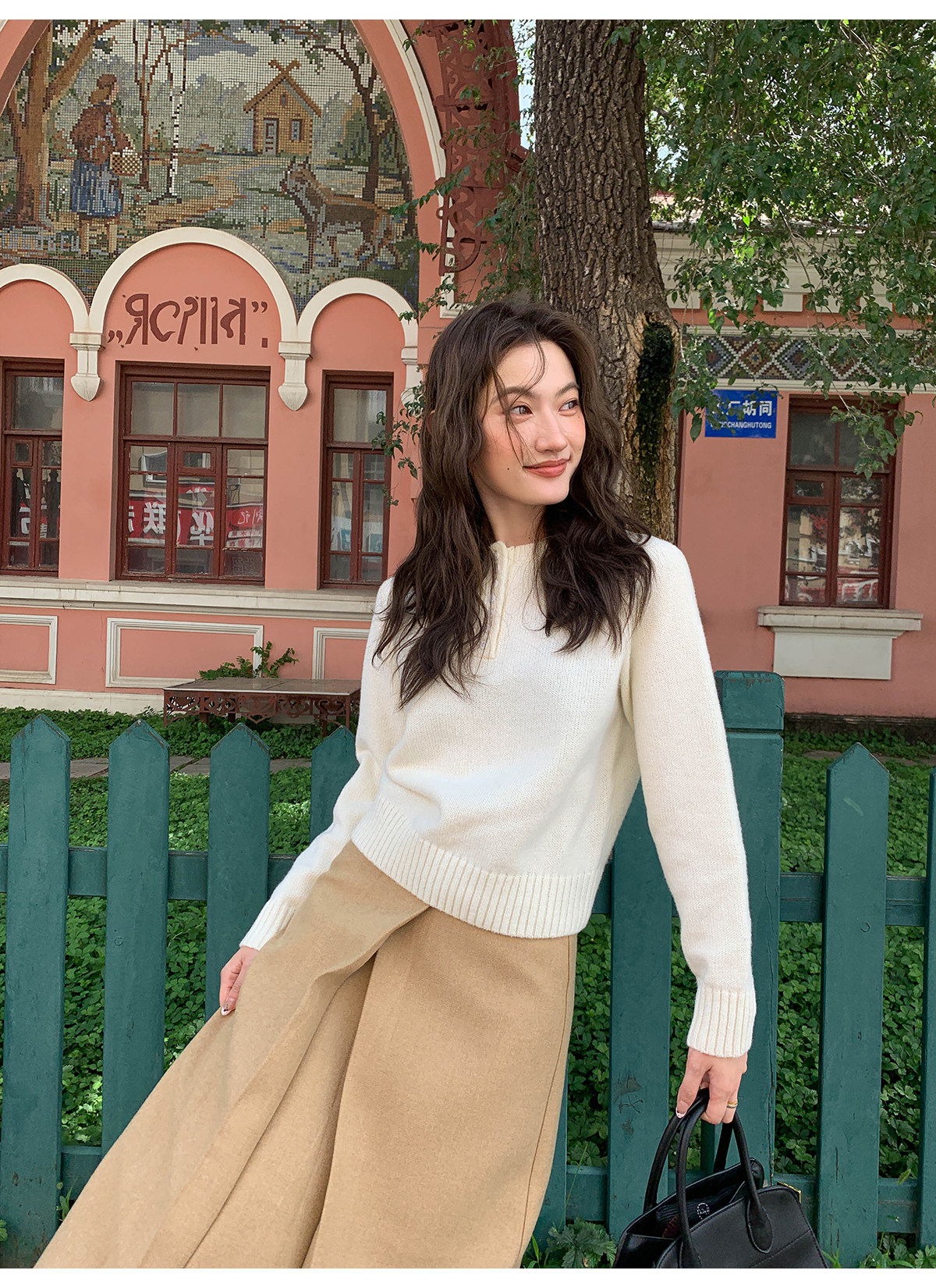 你好卡農 亨利領插肩袖套頭針織衫女秋2025新款寬鬆簡約純色毛衣