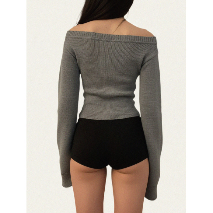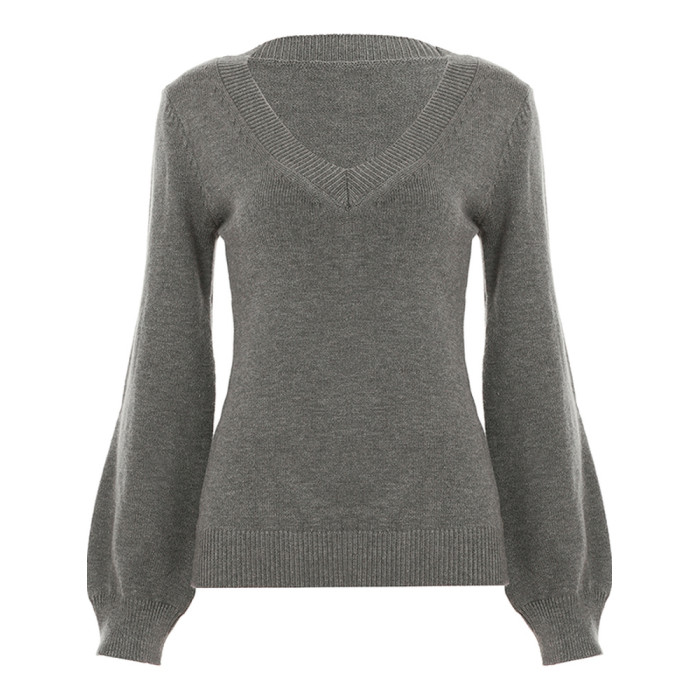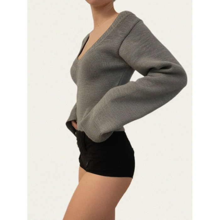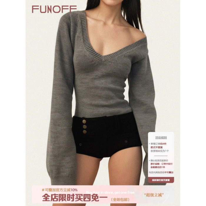 FUNOFF 美式復古灰色V領低胸毛織上衣2025秋性感純色收腰內搭長袖