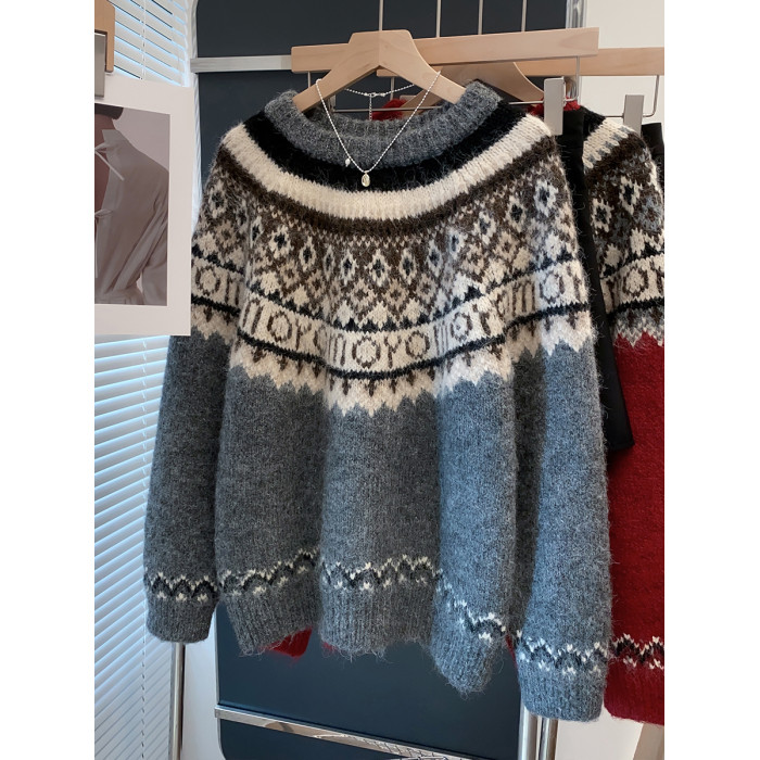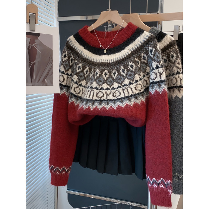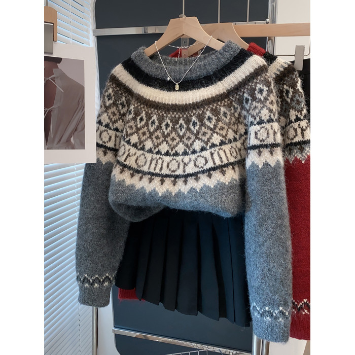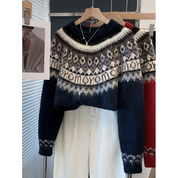 圓領費爾島毛衣女加厚打底衫2025秋冬新款套頭寬松針織衫內搭上衣
