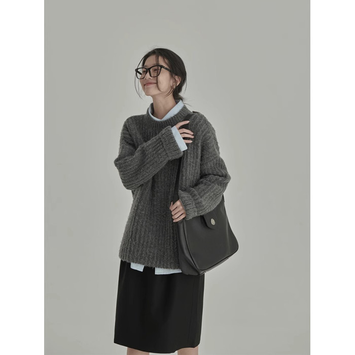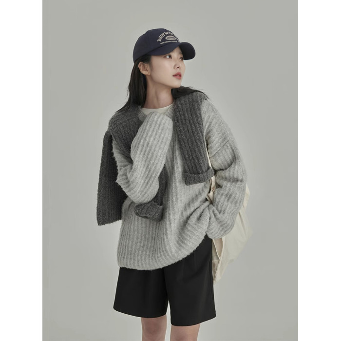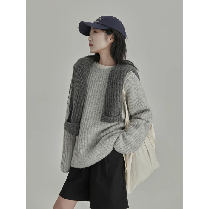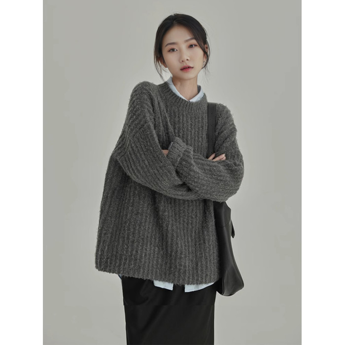 秋冬慵懶風坑條紋寬松加厚外穿套頭基礎款內搭復古針織衫毛衣女