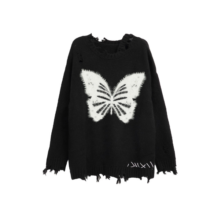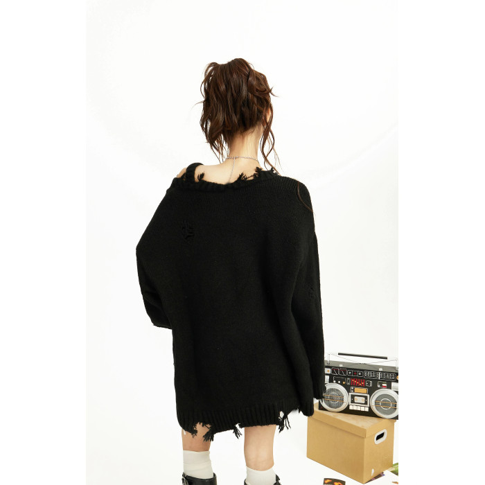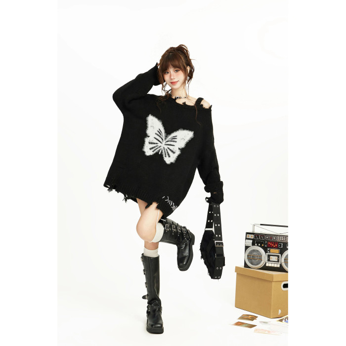 美式黑色蝴蝶露肩斜肩針織毛衣女秋冬季慵懶風寬松長款設計感小衆