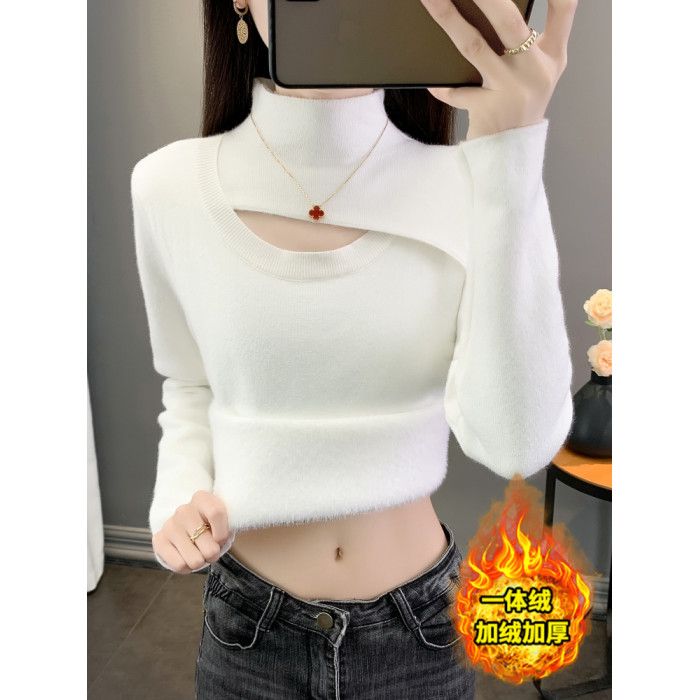 秋冬洋氣加絨加厚小衆設計感半高領毛衣中領一體絨打底衫女士內搭