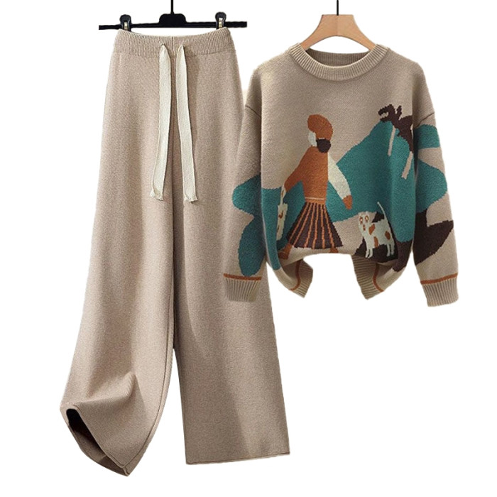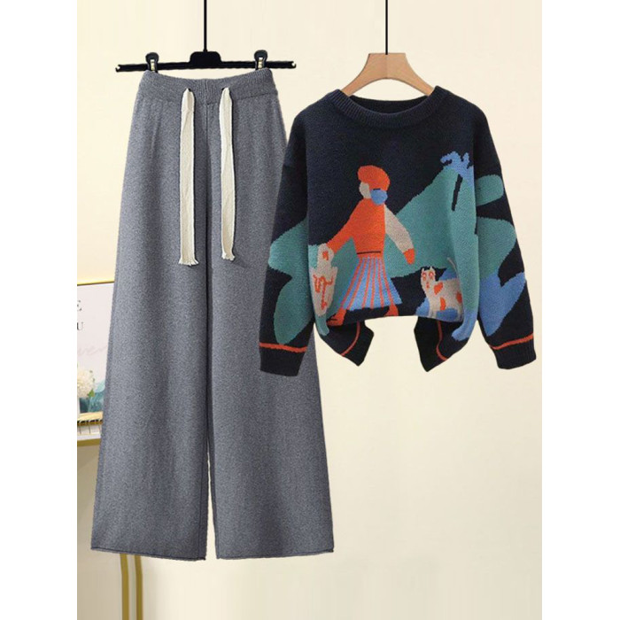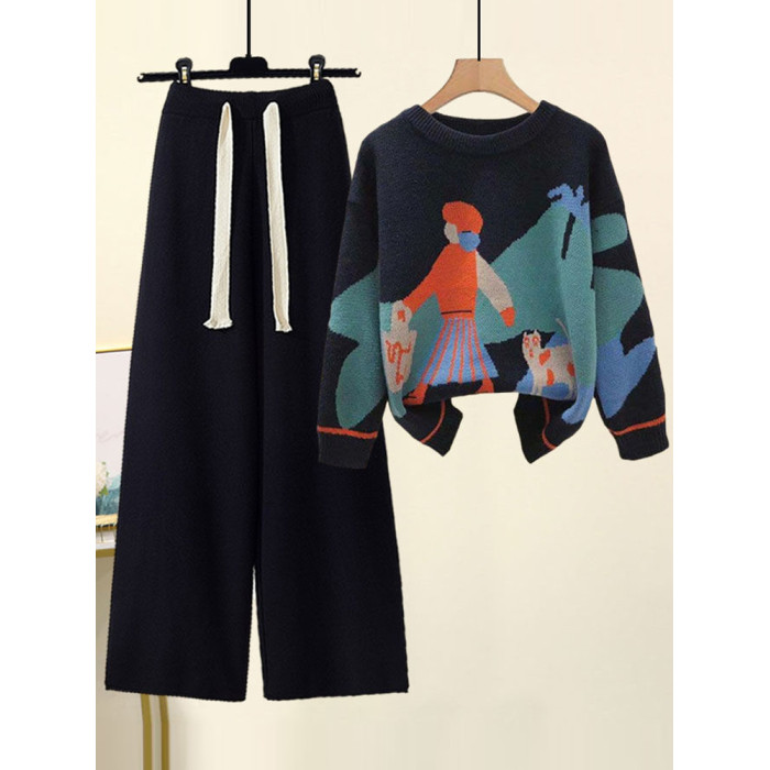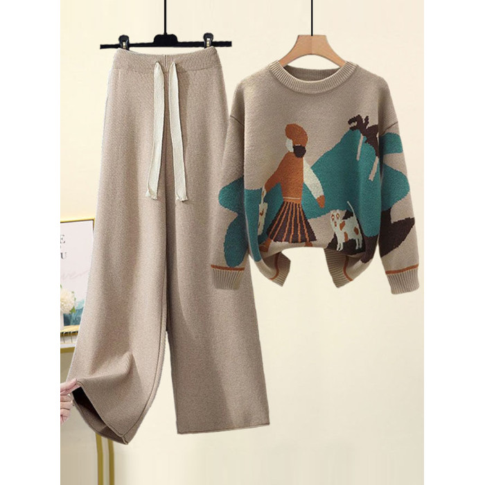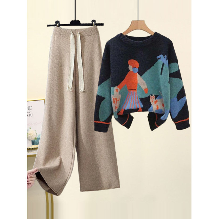 2025年新款針織毛衣女秋季寬松顯瘦設計感遮肉百搭直筒濶腿褲套裝