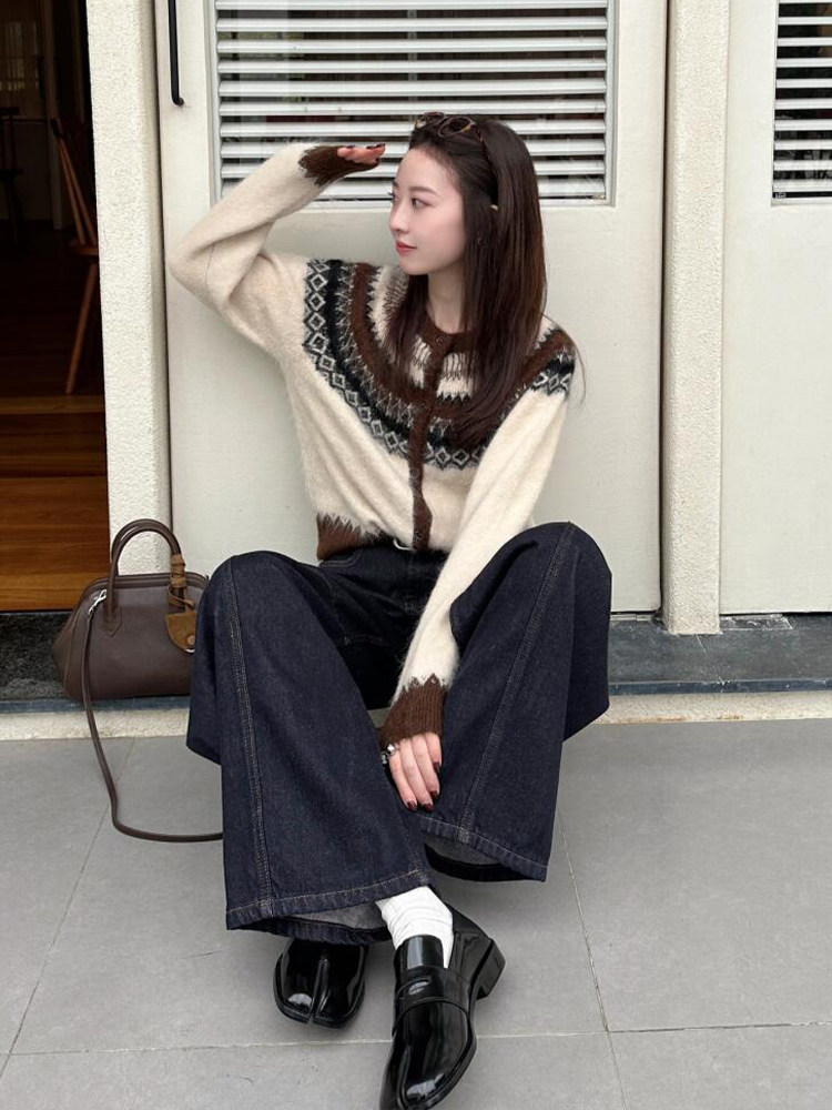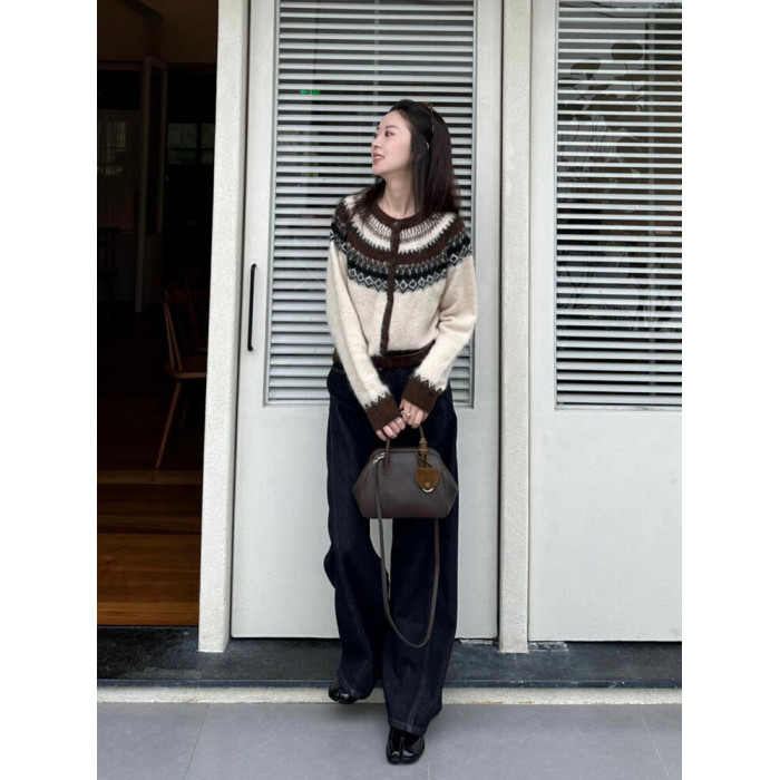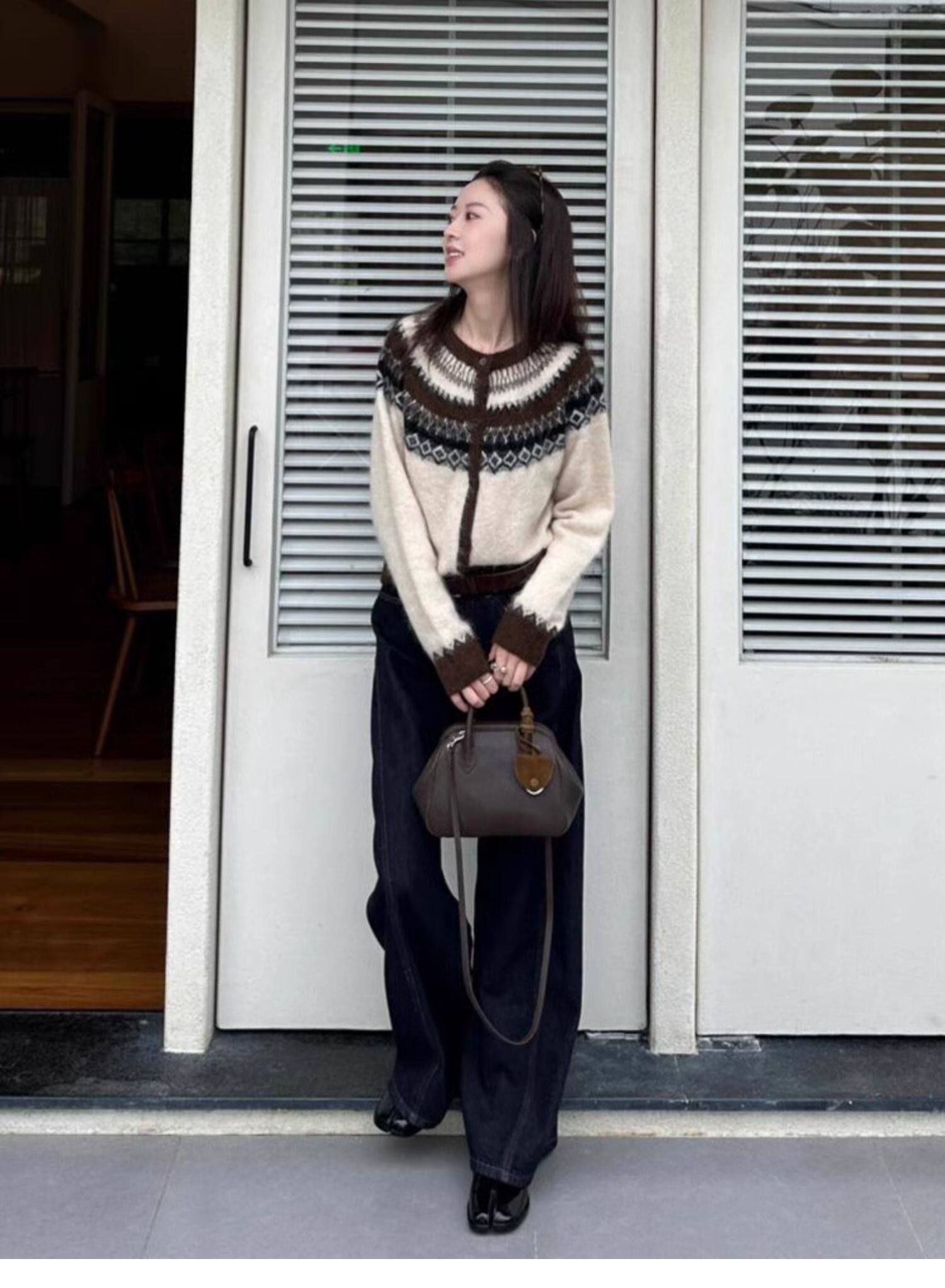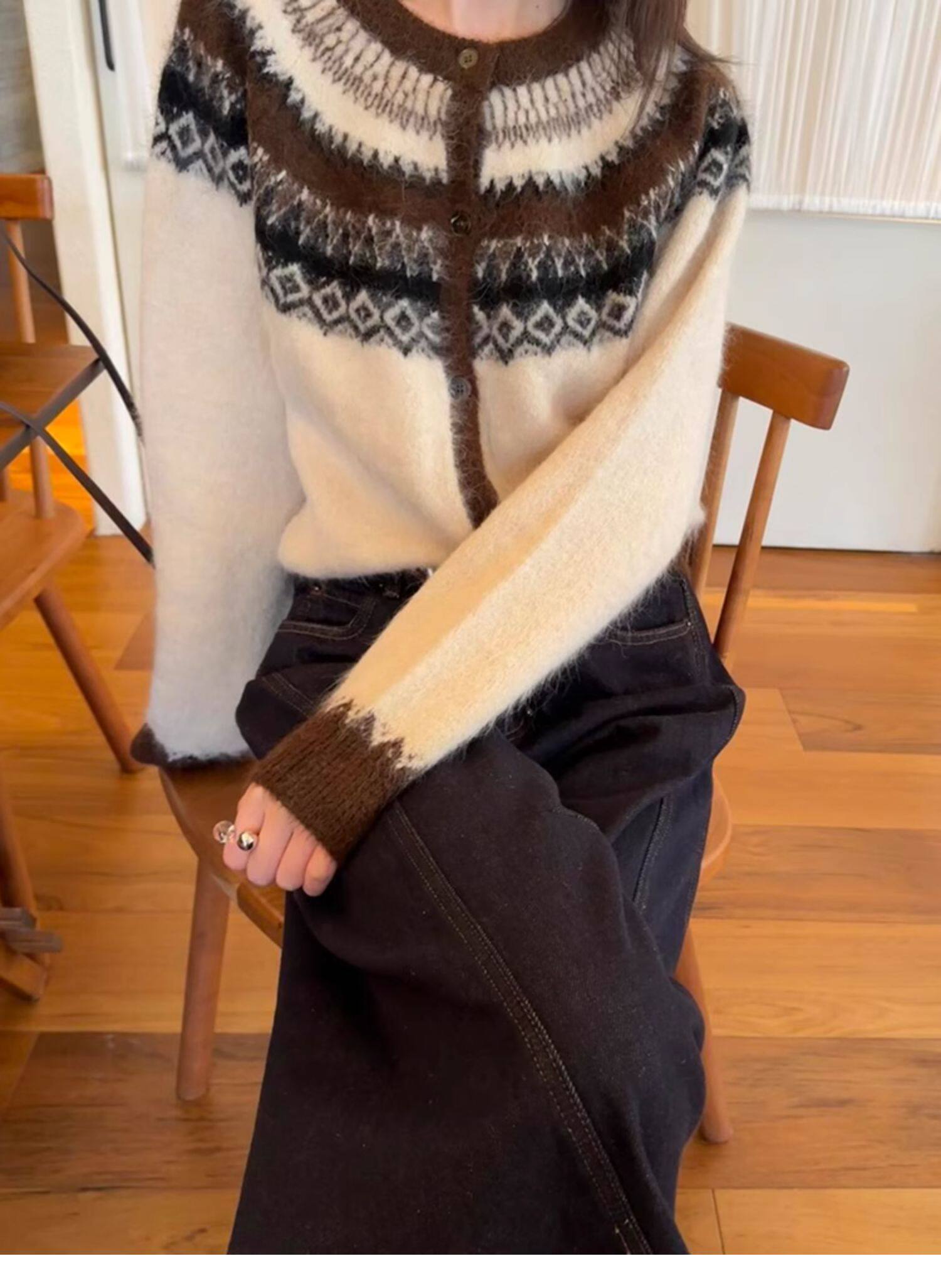 費爾島復古白色提花開衫毛衣外套女秋冬慵懶高級感外穿針織衫上衣