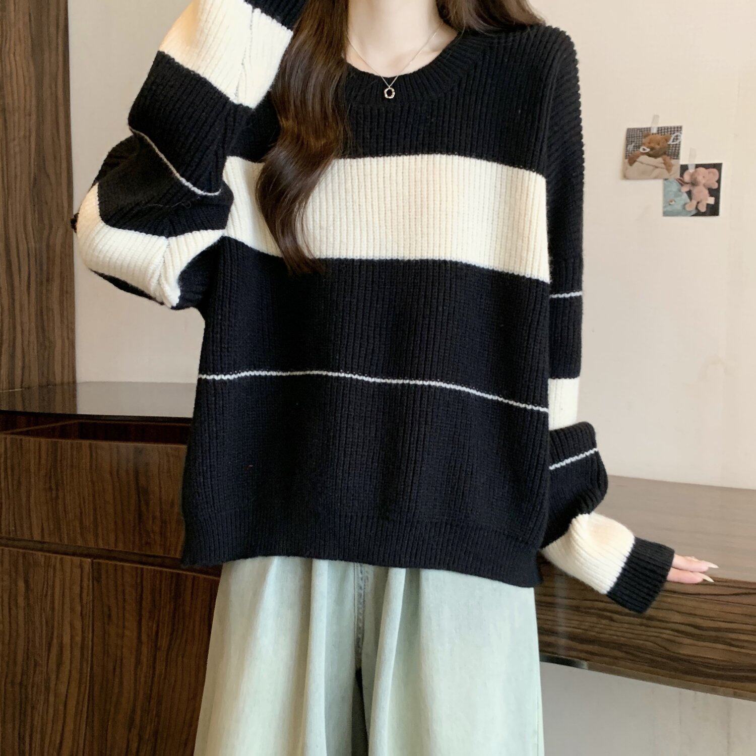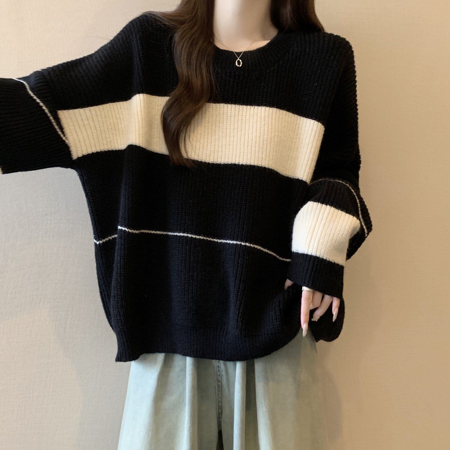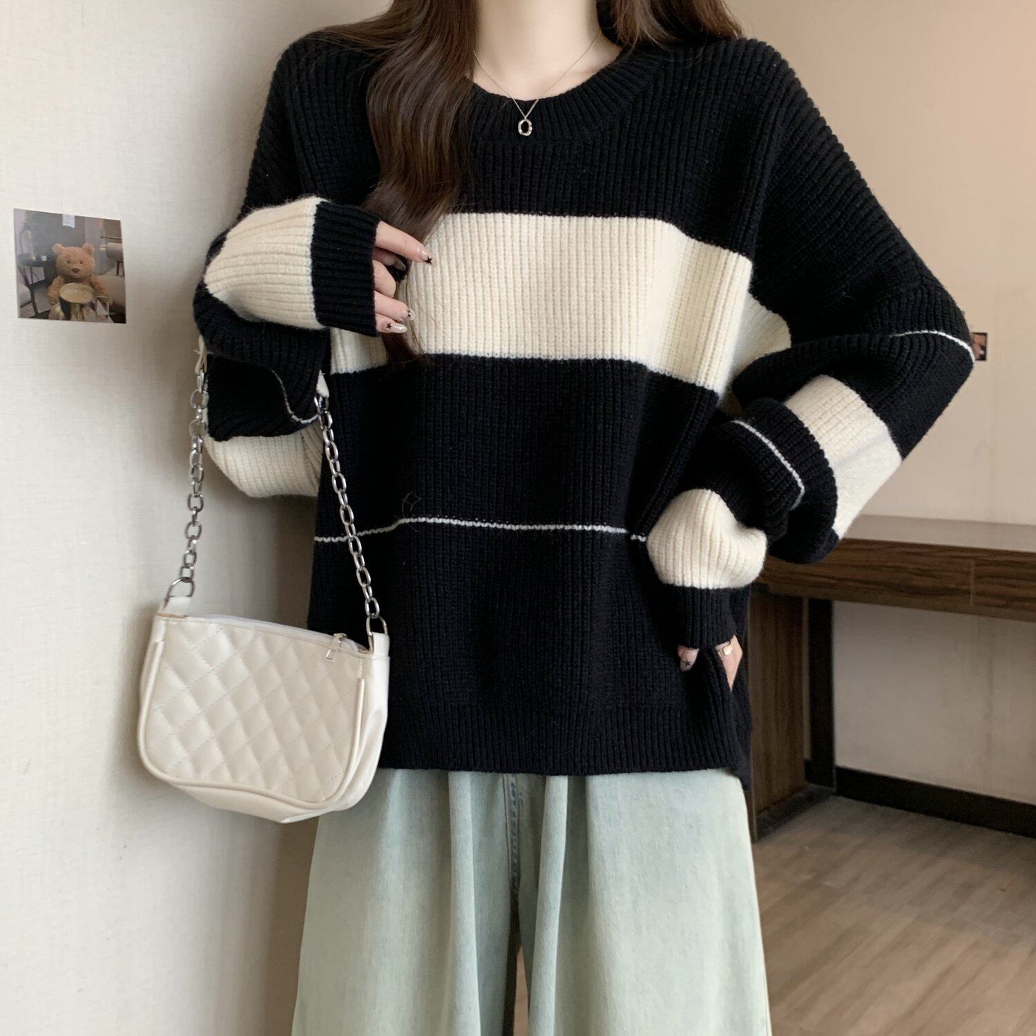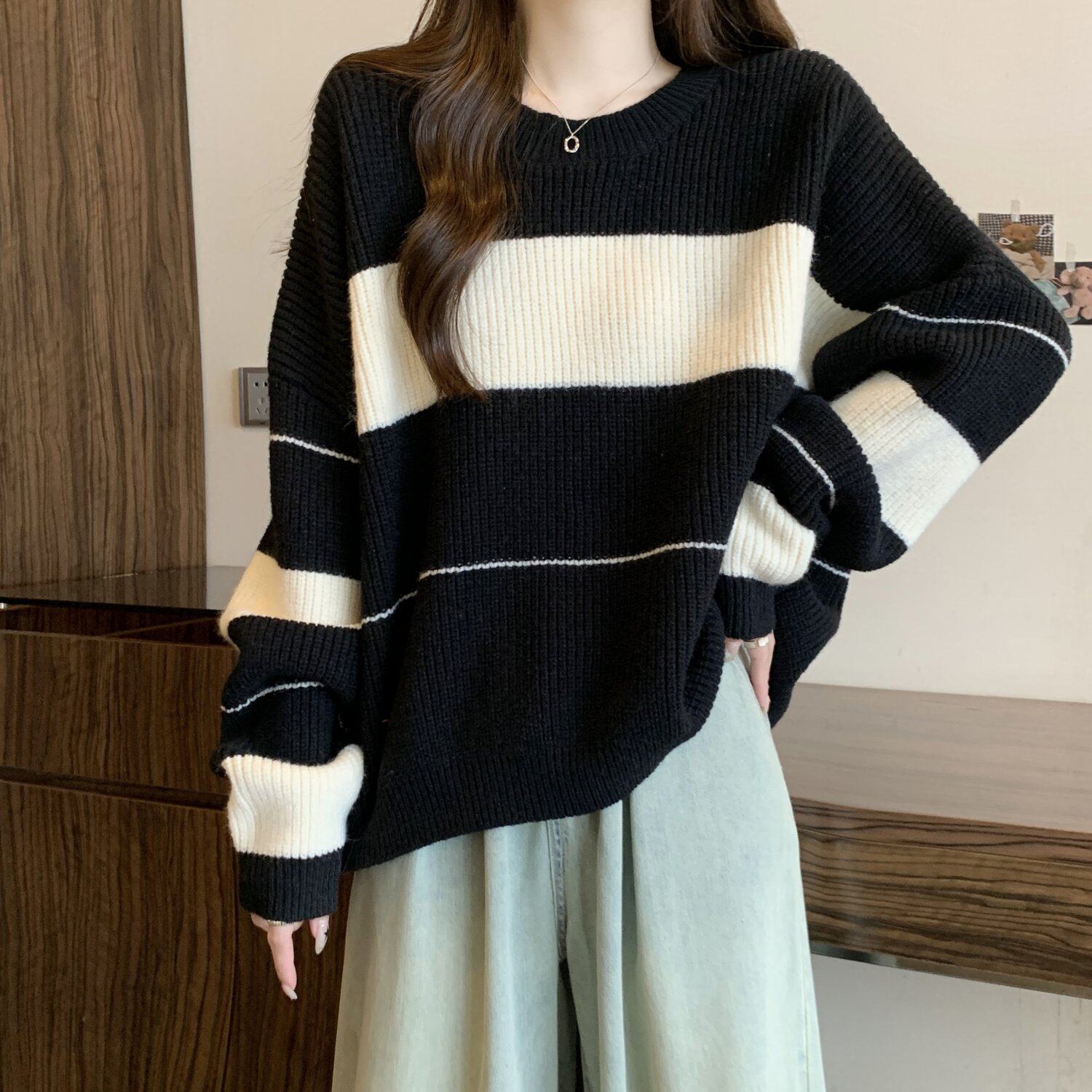 寬松慵懶風加厚條紋毛衣大碼女裝2025秋冬新款高級長袖針織衫上衣