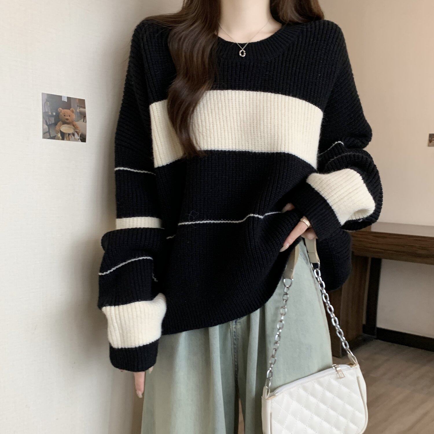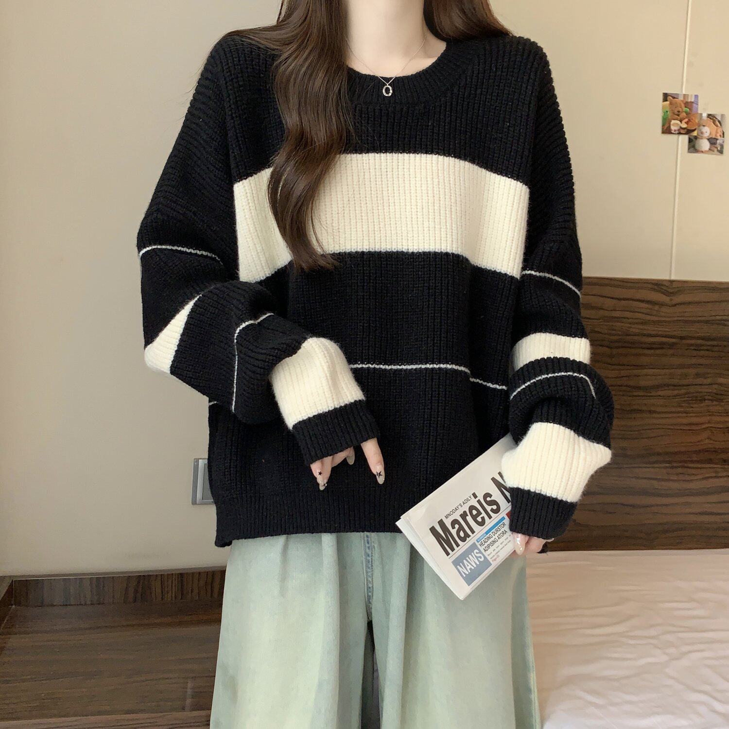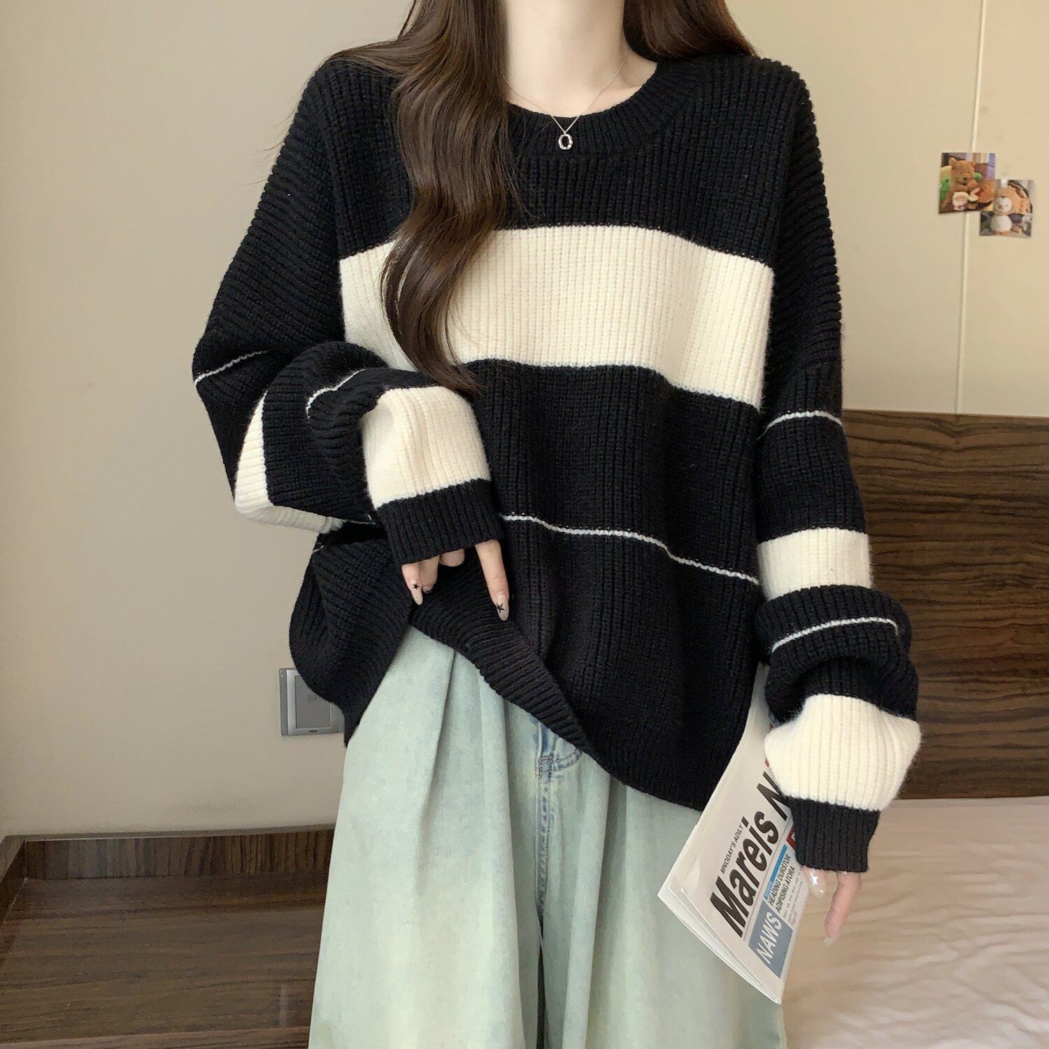 寬松慵懶風加厚條紋毛衣大碼女裝2025秋冬新款高級長袖針織衫上衣