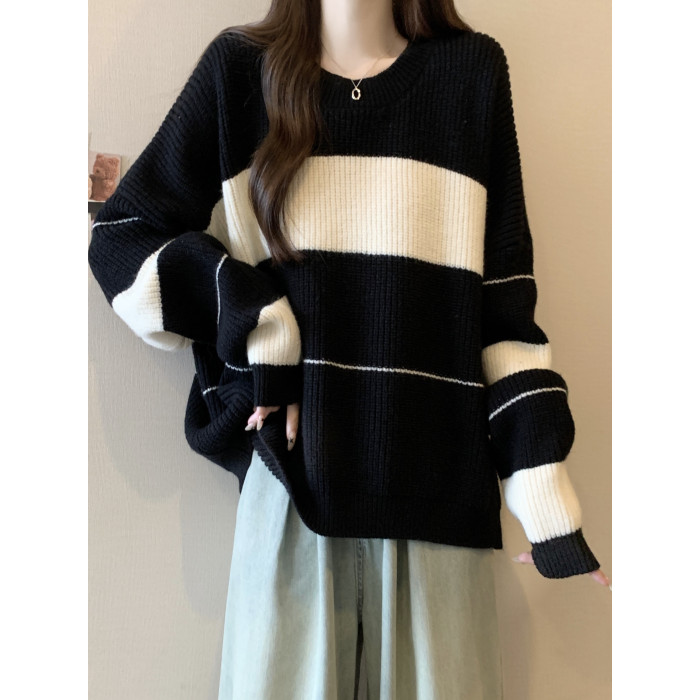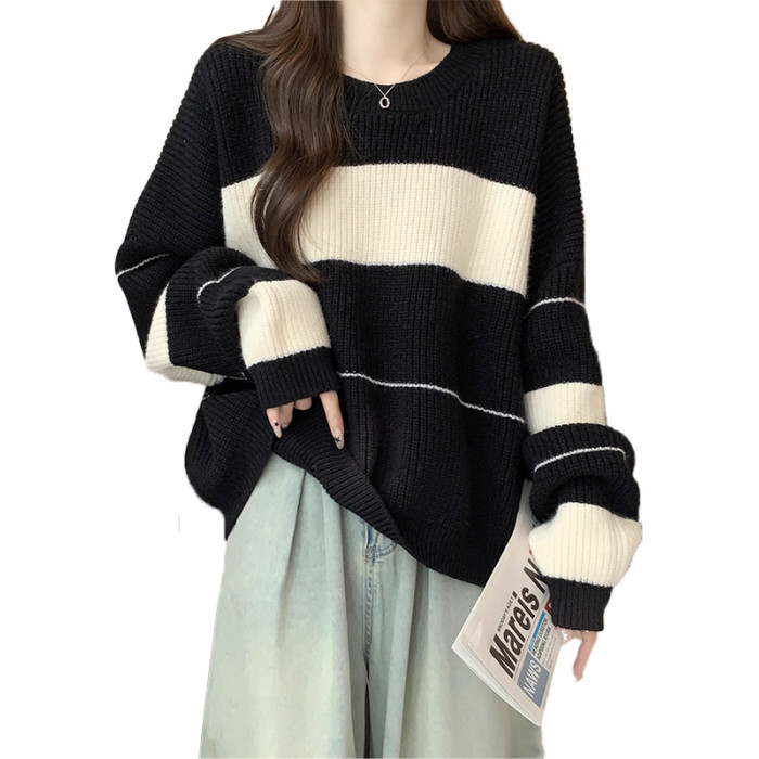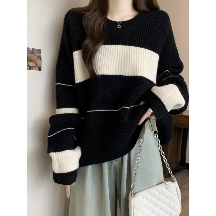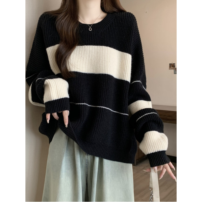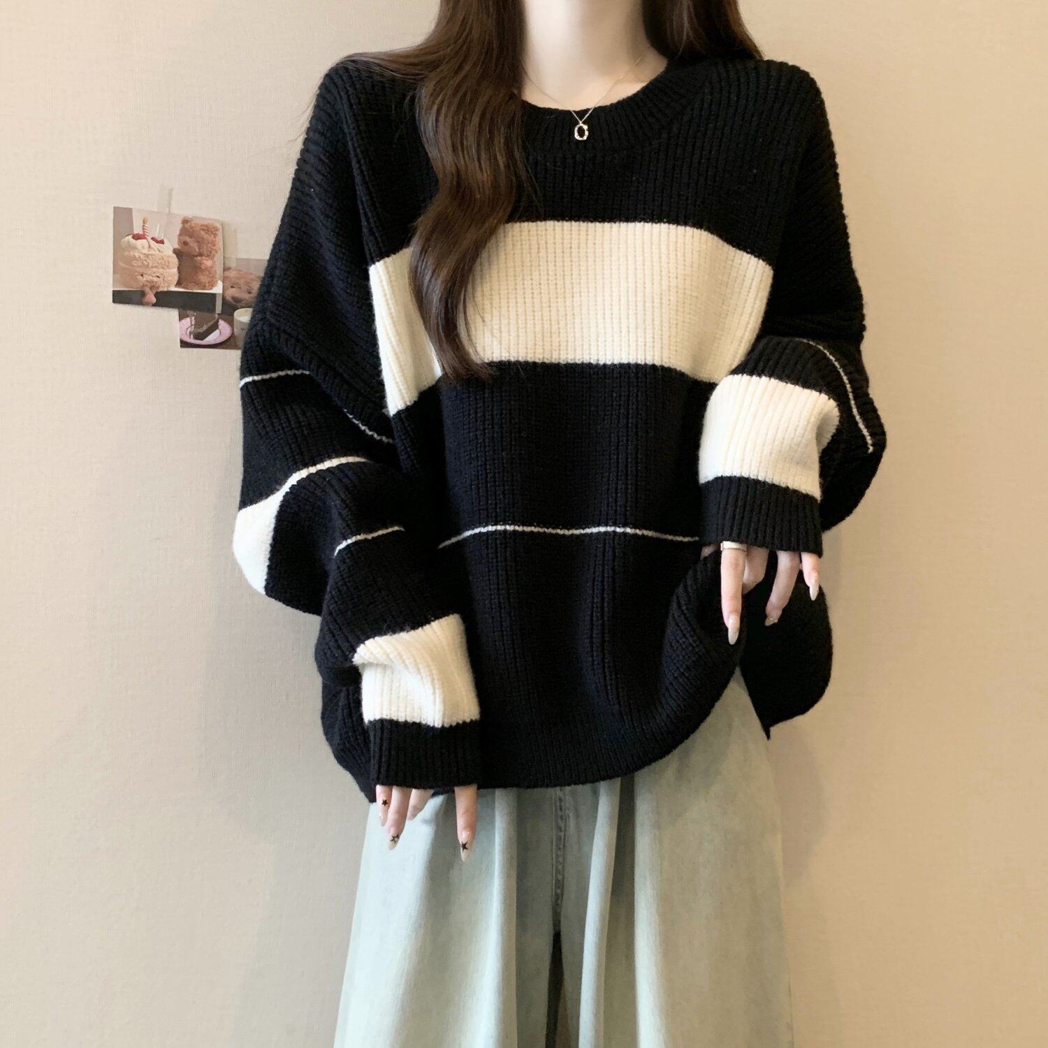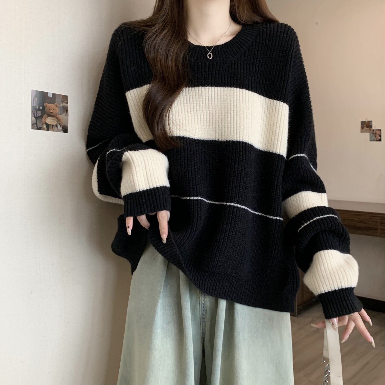 寬松慵懶風加厚條紋毛衣大碼女裝2025秋冬新款高級長袖針織衫上衣