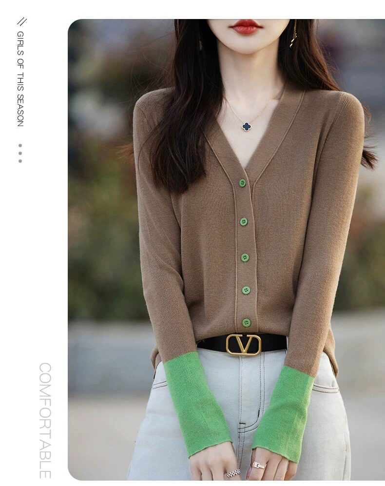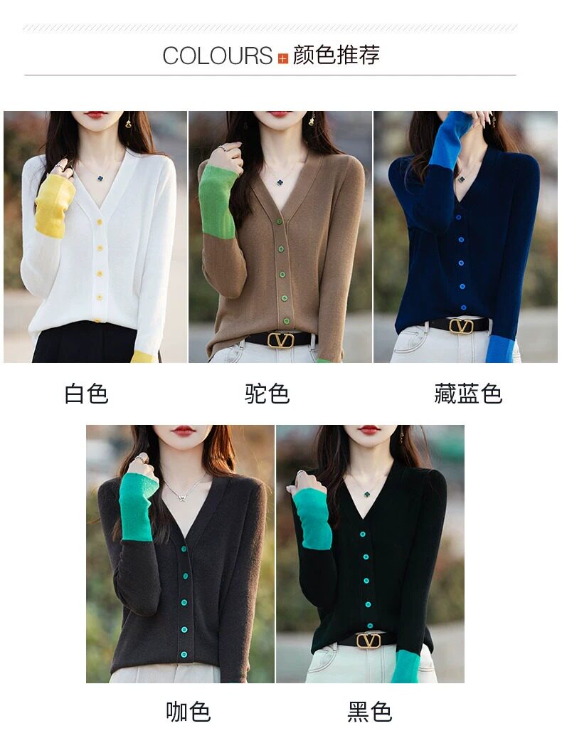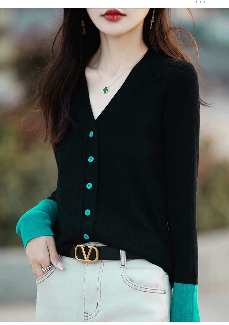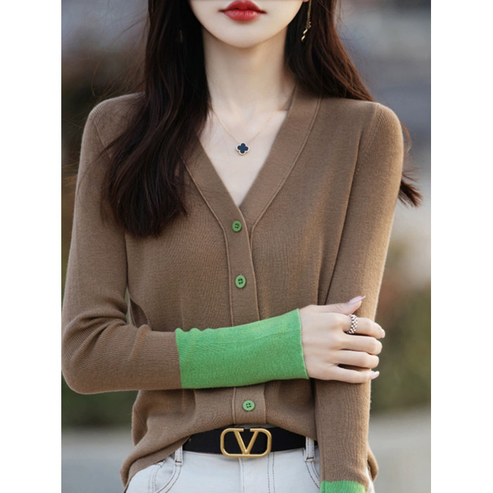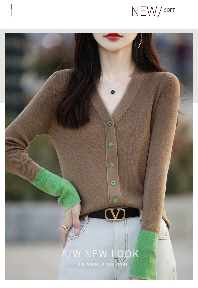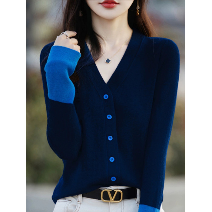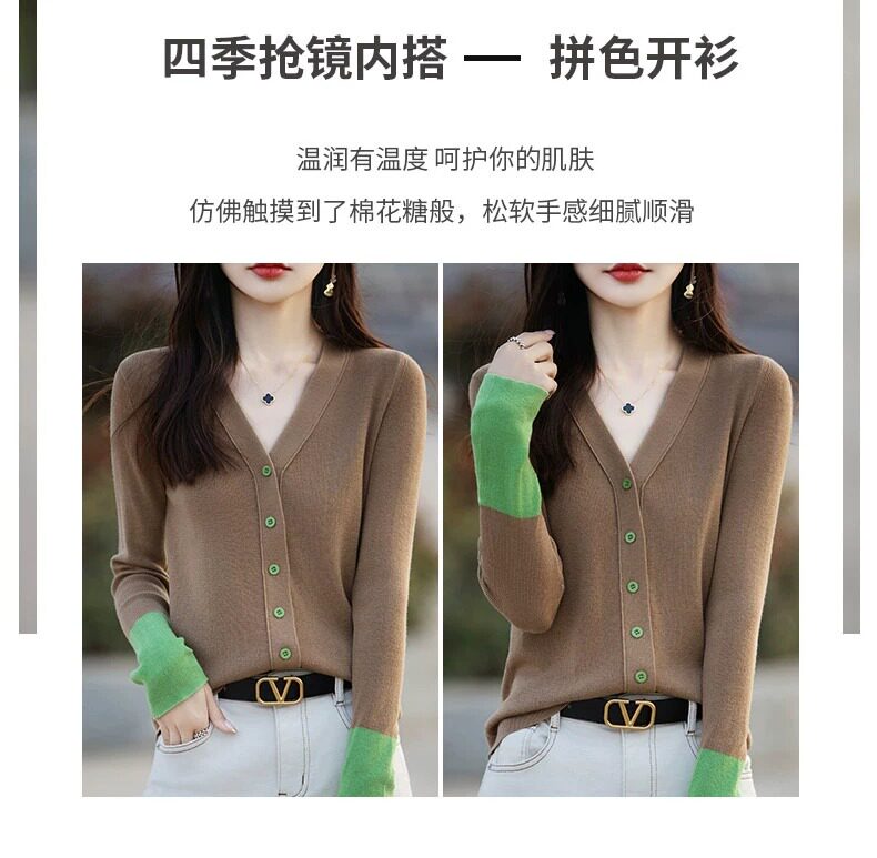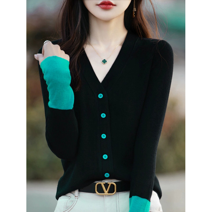 2024秋冬新款V領撞色針織開衫女高級感拼接外搭寬松百搭優雅上衣