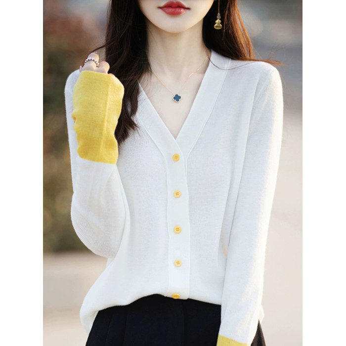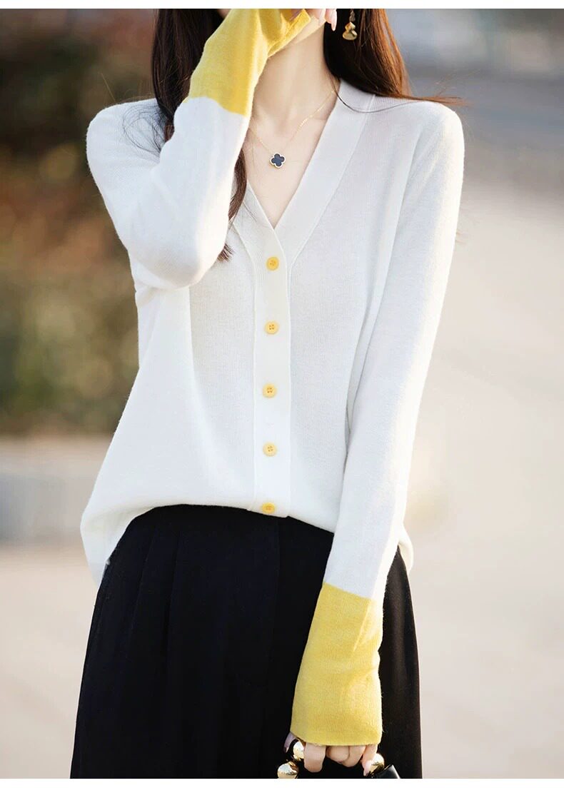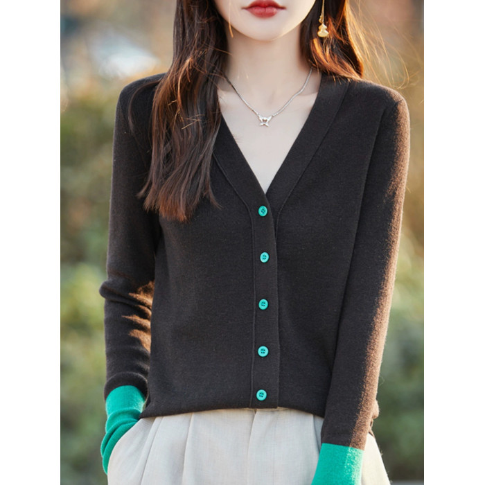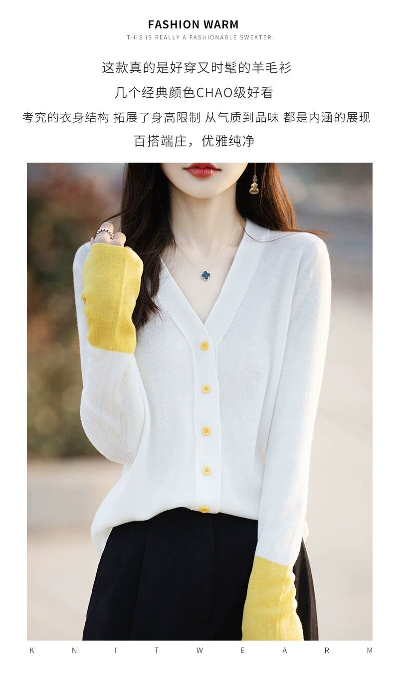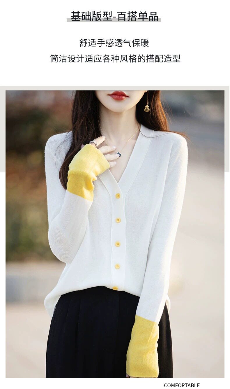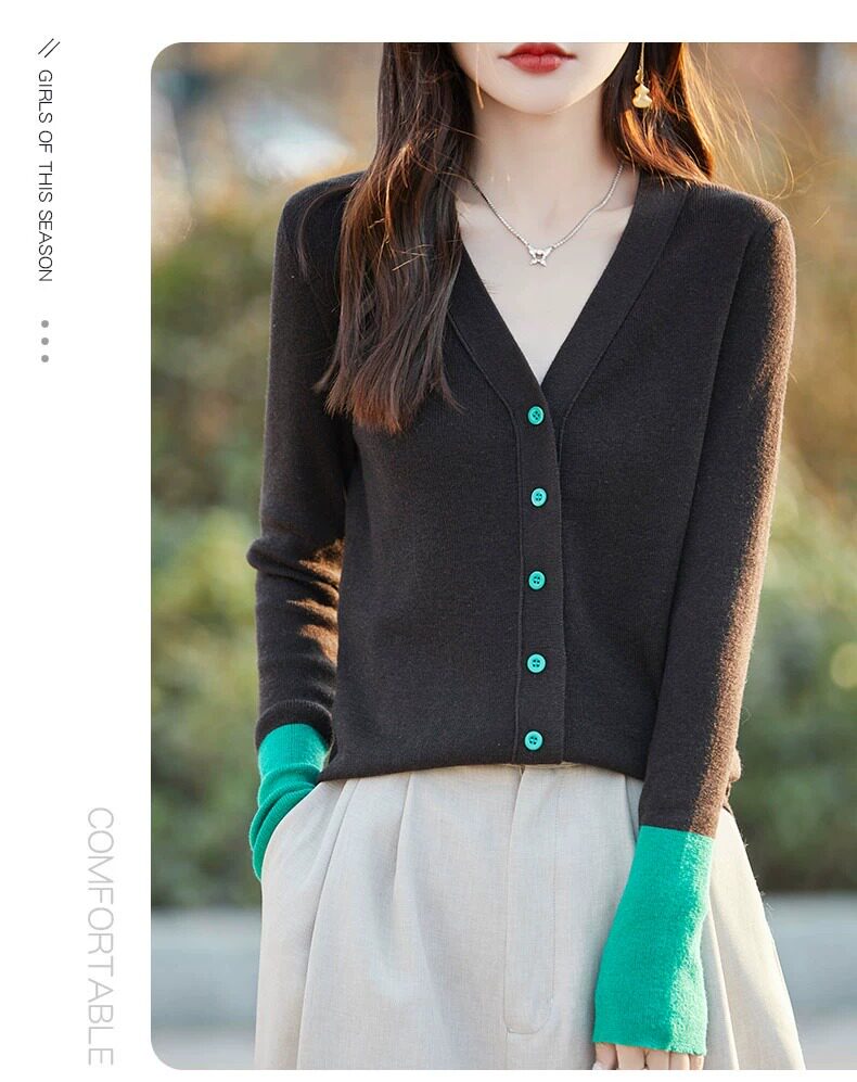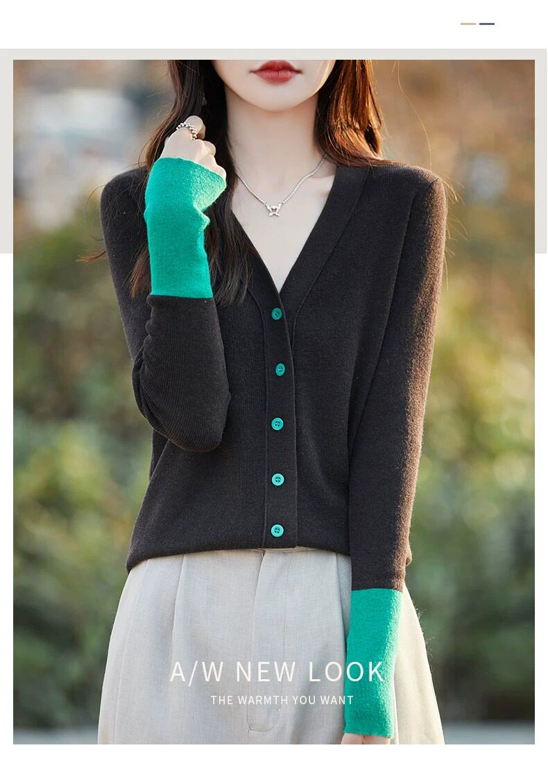 2024秋冬新款V領撞色針織開衫女高級感拼接外搭寬松百搭優雅上衣