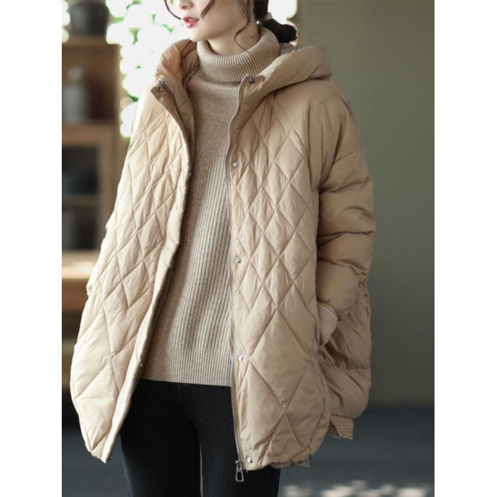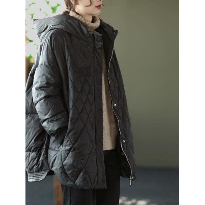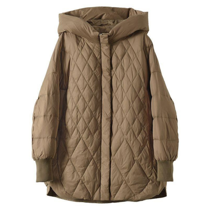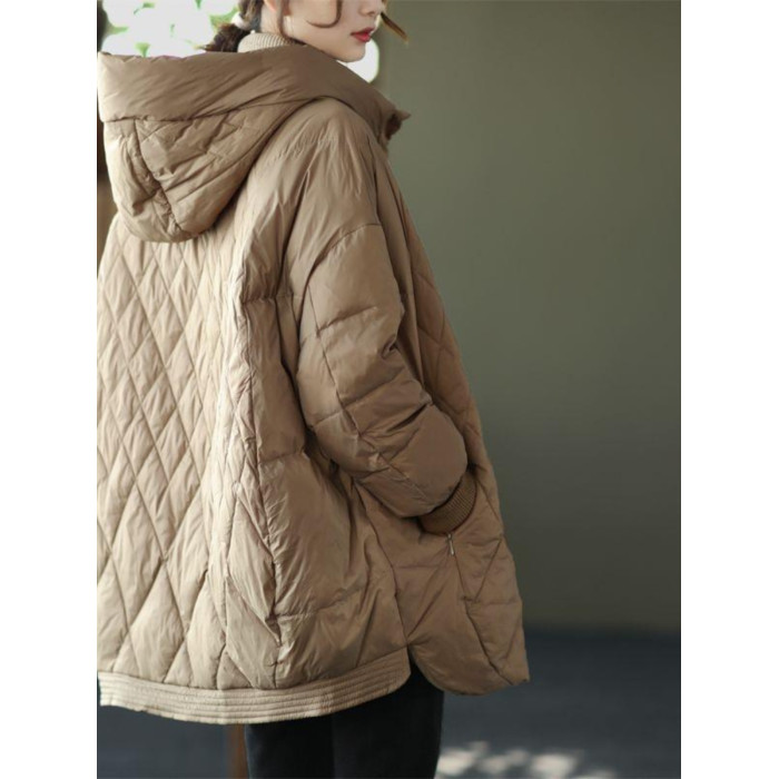 200斤自製連帽白鴨羽絨服女菱格文藝休閒保暖寬松保暖大碼外套